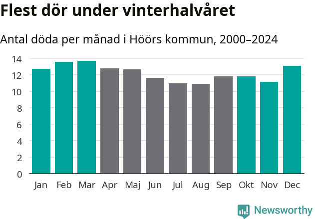 Så är det även i Höör. Under de senaste 25 åren har 1 870 personer dött i kommunen under vinterhalvåret, jämfört med 1 704 personer under sommarhalvåret – alltså tio procent fler.