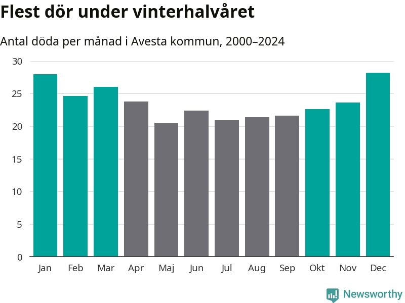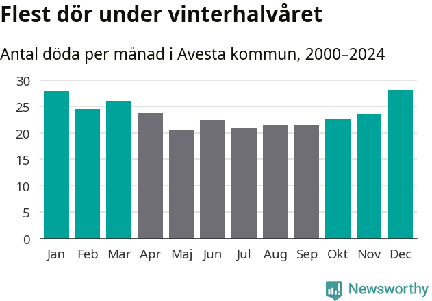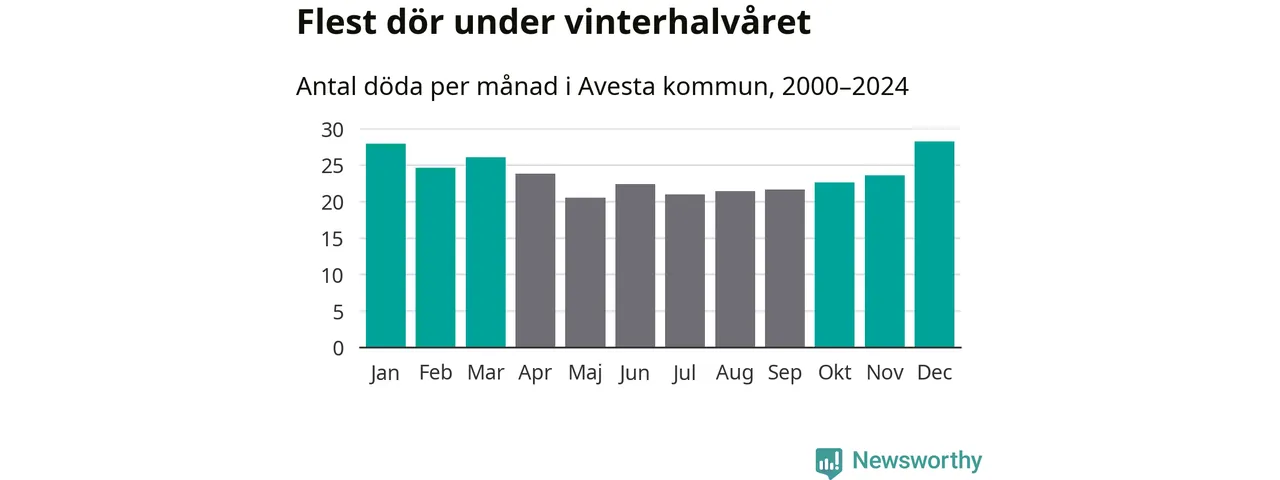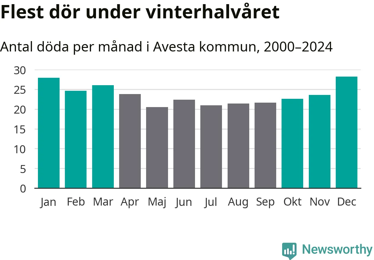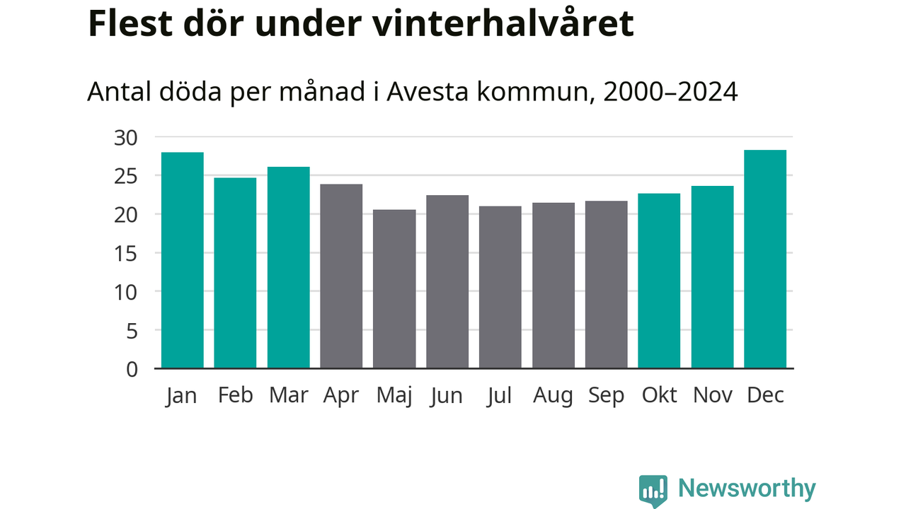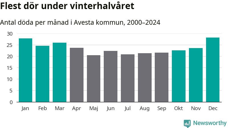 Så är det även i Avesta. Under de senaste 25 åren har 3 779 personer dött i kommunen under vinterhalvåret, jämfört med 3 228 personer under sommarhalvåret – alltså 17 procent fler.