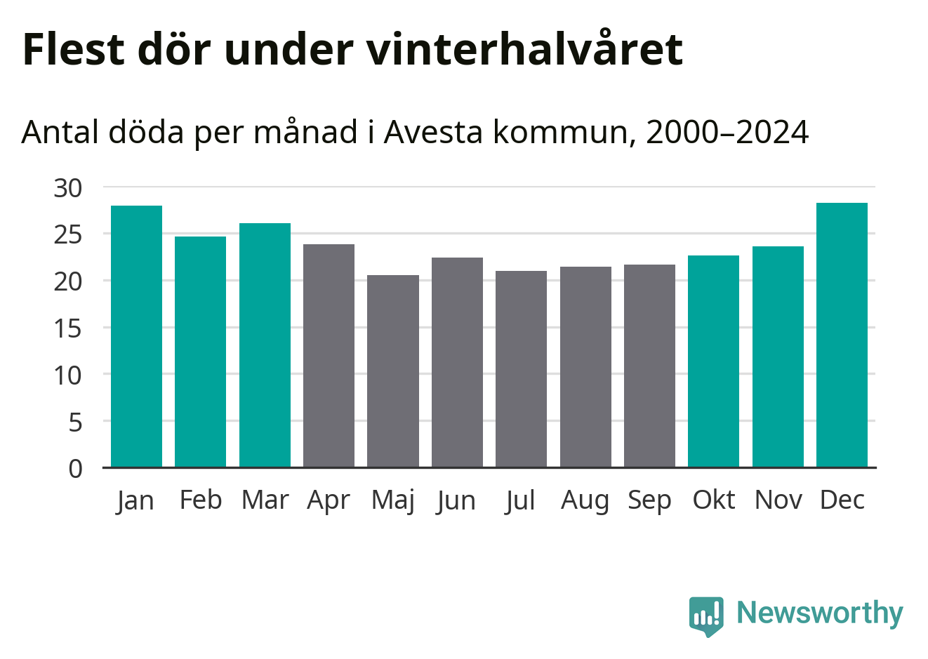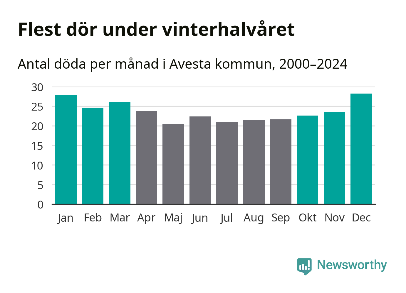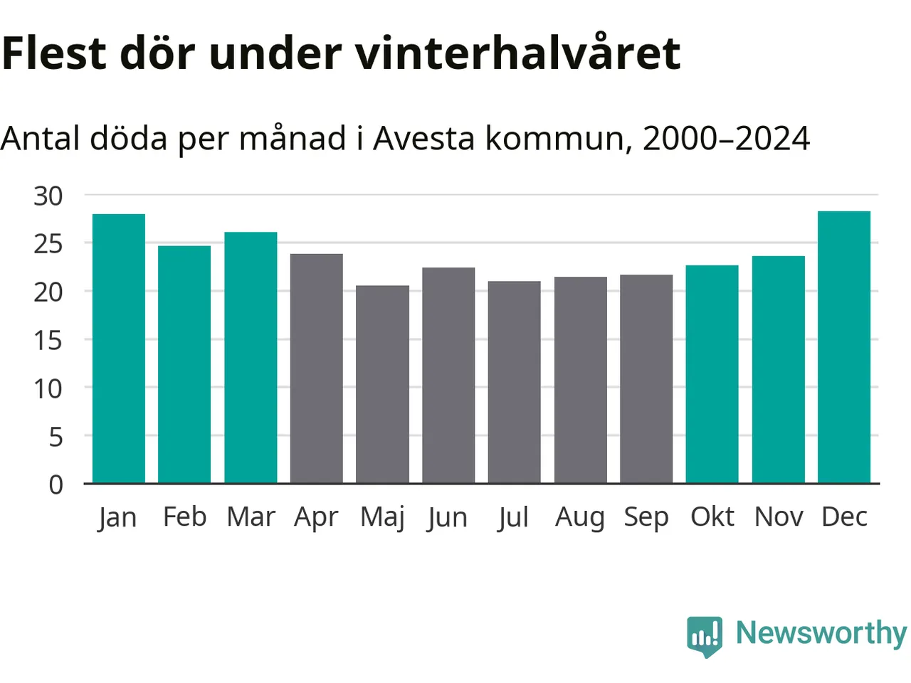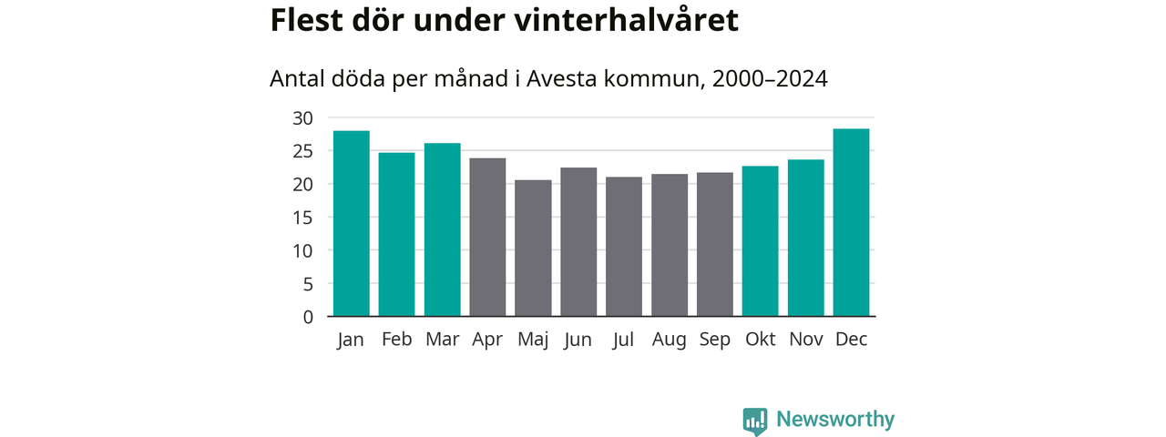Så är det även i Avesta. Under de senaste 25 åren har 3 779 personer dött i kommunen under vinterhalvåret, jämfört med 3 228 personer under sommarhalvåret – alltså 17 procent fler.