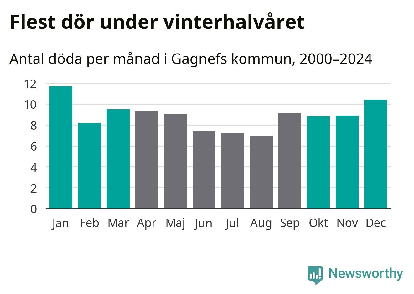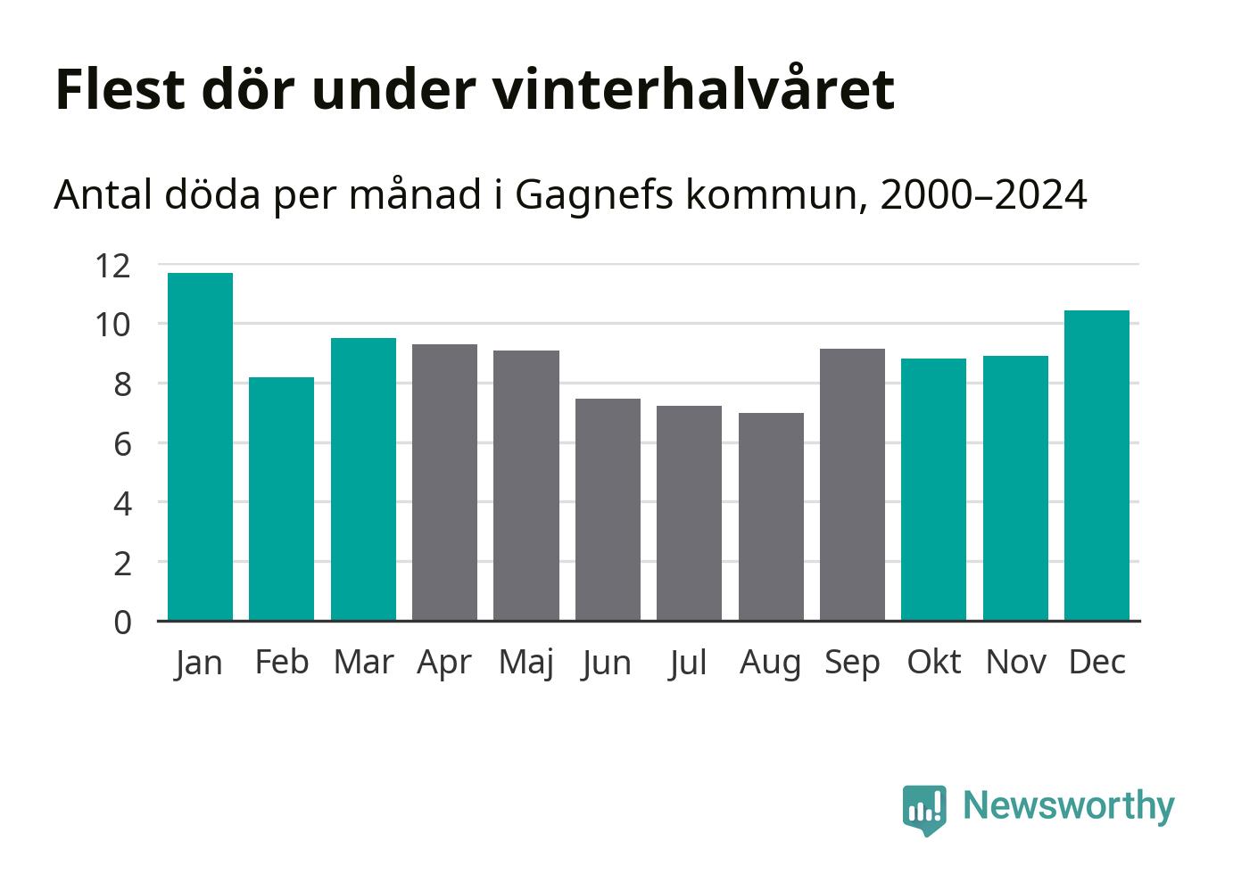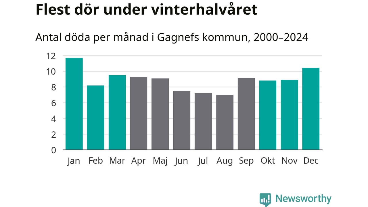 I landet som helhet är det veckorna kring årsskiftet som är de allra dödligaste. Så är det även i Gagnef, där den dödligaste perioden infaller under vecka 1, enligt statistik för de senaste 25 åren. Sammanlagt handlar det om 75 personer , vilket är 48 procent fler än snittet för resten av året.