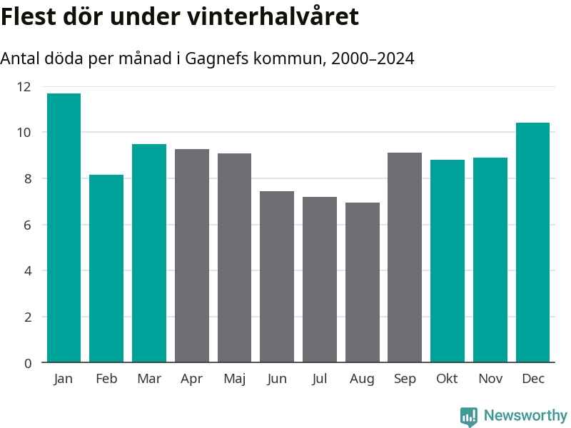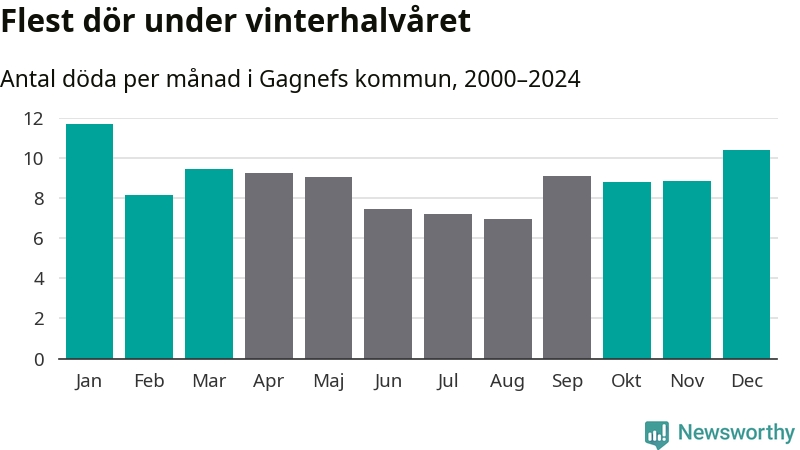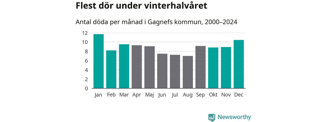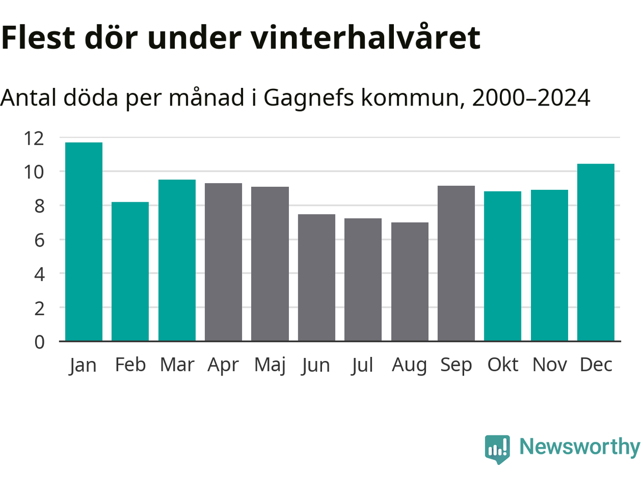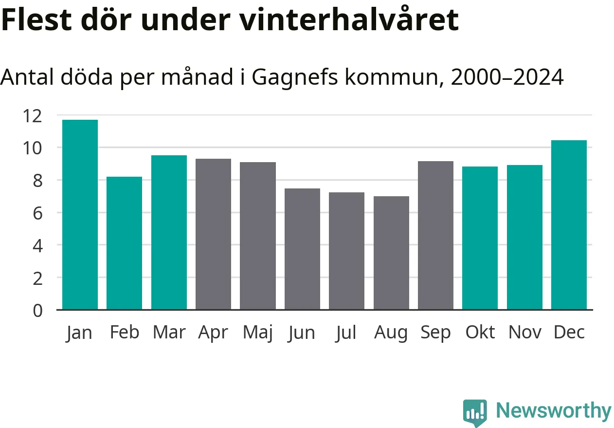 I landet som helhet är det veckorna kring årsskiftet som är de allra dödligaste. Så är det även i Gagnef, där den dödligaste perioden infaller under vecka 1, enligt statistik för de senaste 25 åren. Sammanlagt handlar det om 75 personer , vilket är 48 procent fler än snittet för resten av året.