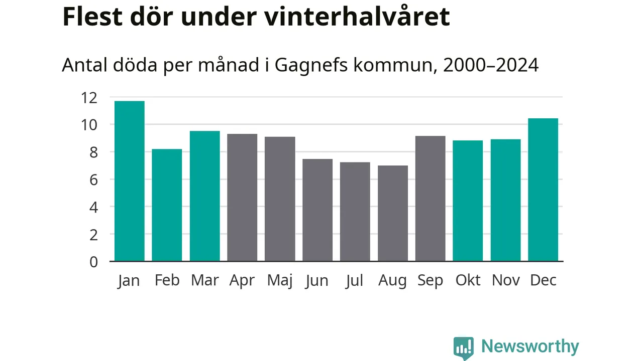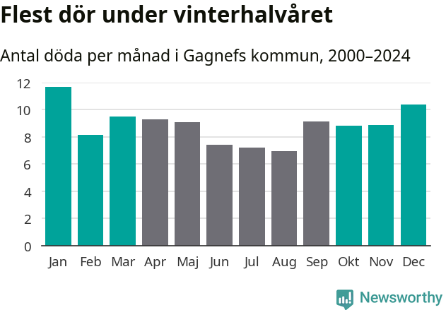 Så är det även i Gagnef. Under de senaste 25 åren har 1 429 personer dött i kommunen under vinterhalvåret, jämfört med 1 215 personer under sommarhalvåret – alltså 18 procent fler.