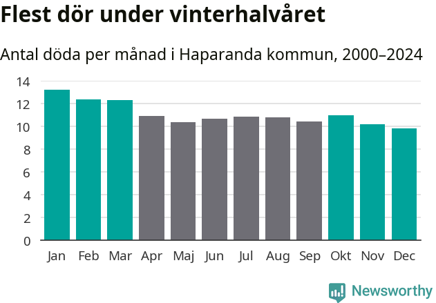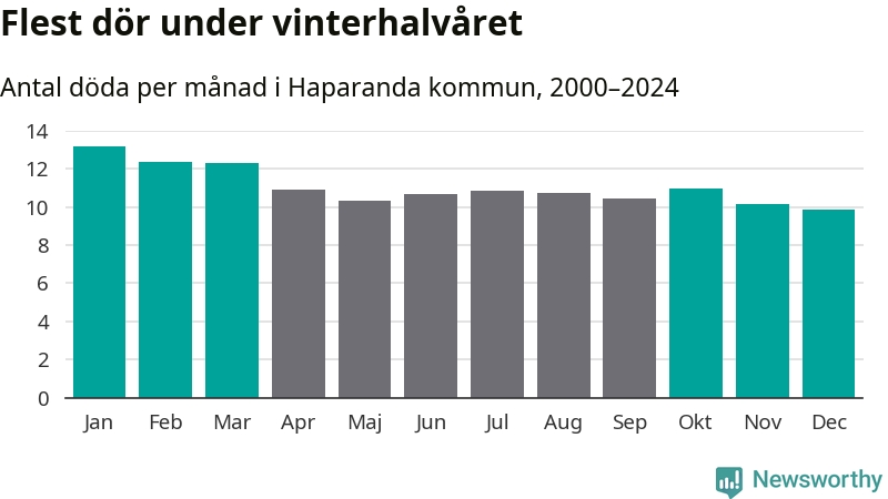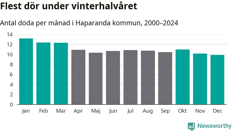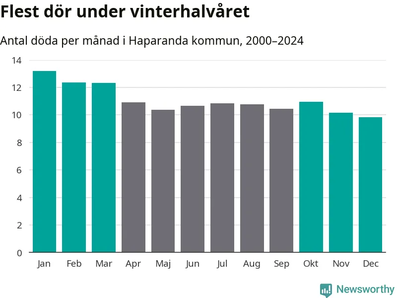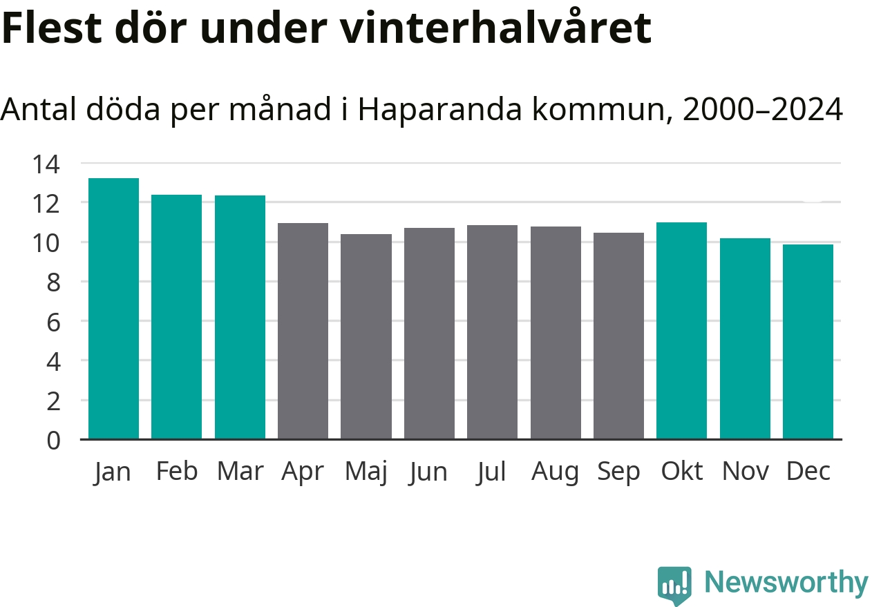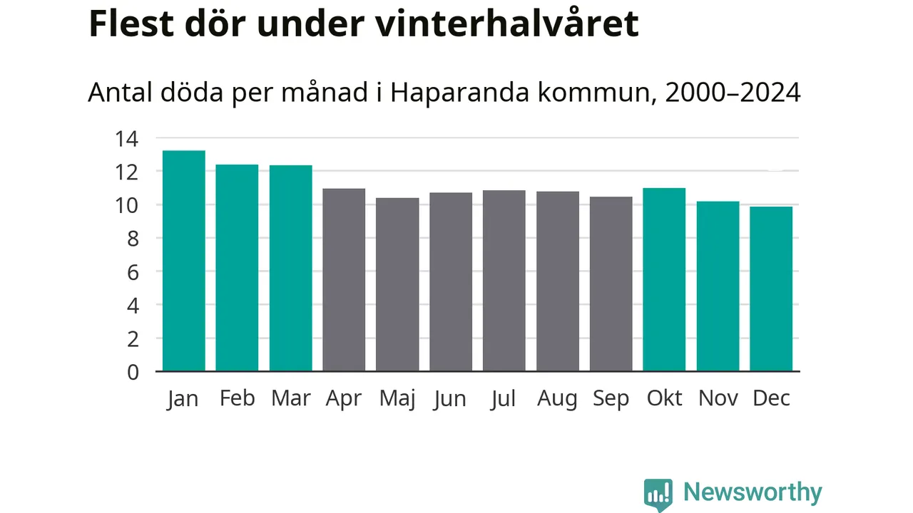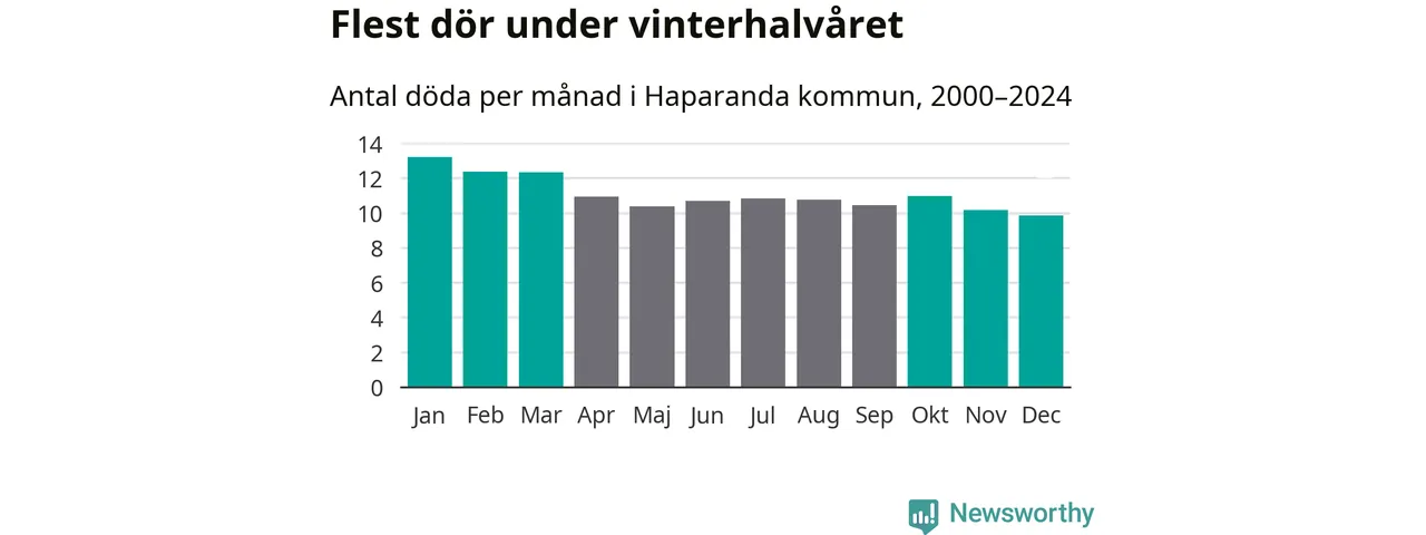 Så är det även i Haparanda. Under de senaste 25 åren har 1 692 personer dött i kommunen under vinterhalvåret, jämfört med 1 576 personer under sommarhalvåret – alltså sju procent fler.