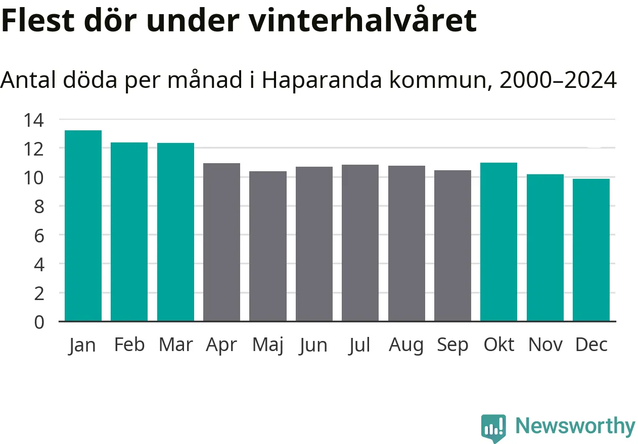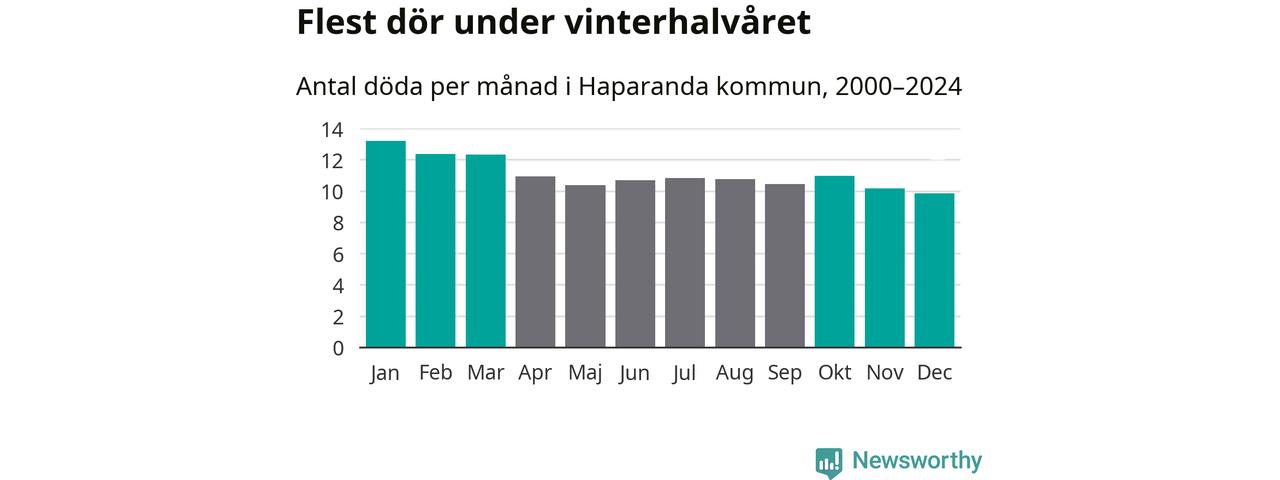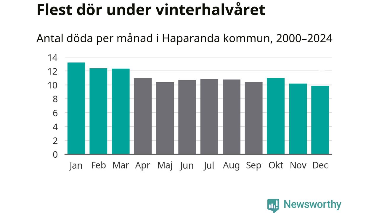 I landet som helhet är det veckorna kring årsskiftet som är de allra dödligaste. Så är det även i Haparanda, där den dödligaste perioden infaller under vecka 1, enligt statistik för de senaste 25 åren. Sammanlagt handlar det om 85 personer , vilket är 35 procent fler än snittet för resten av året.