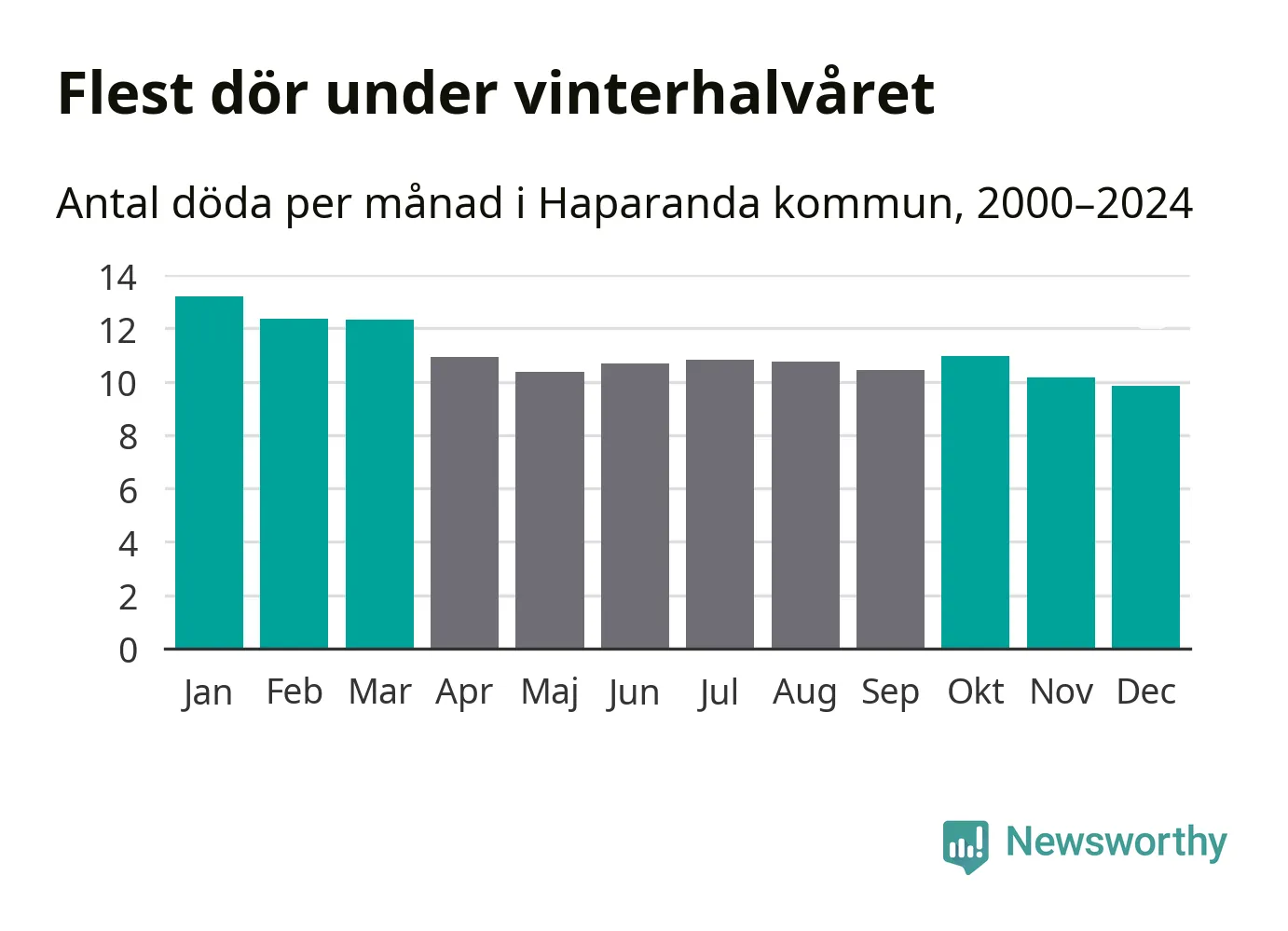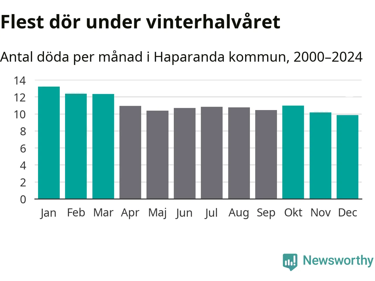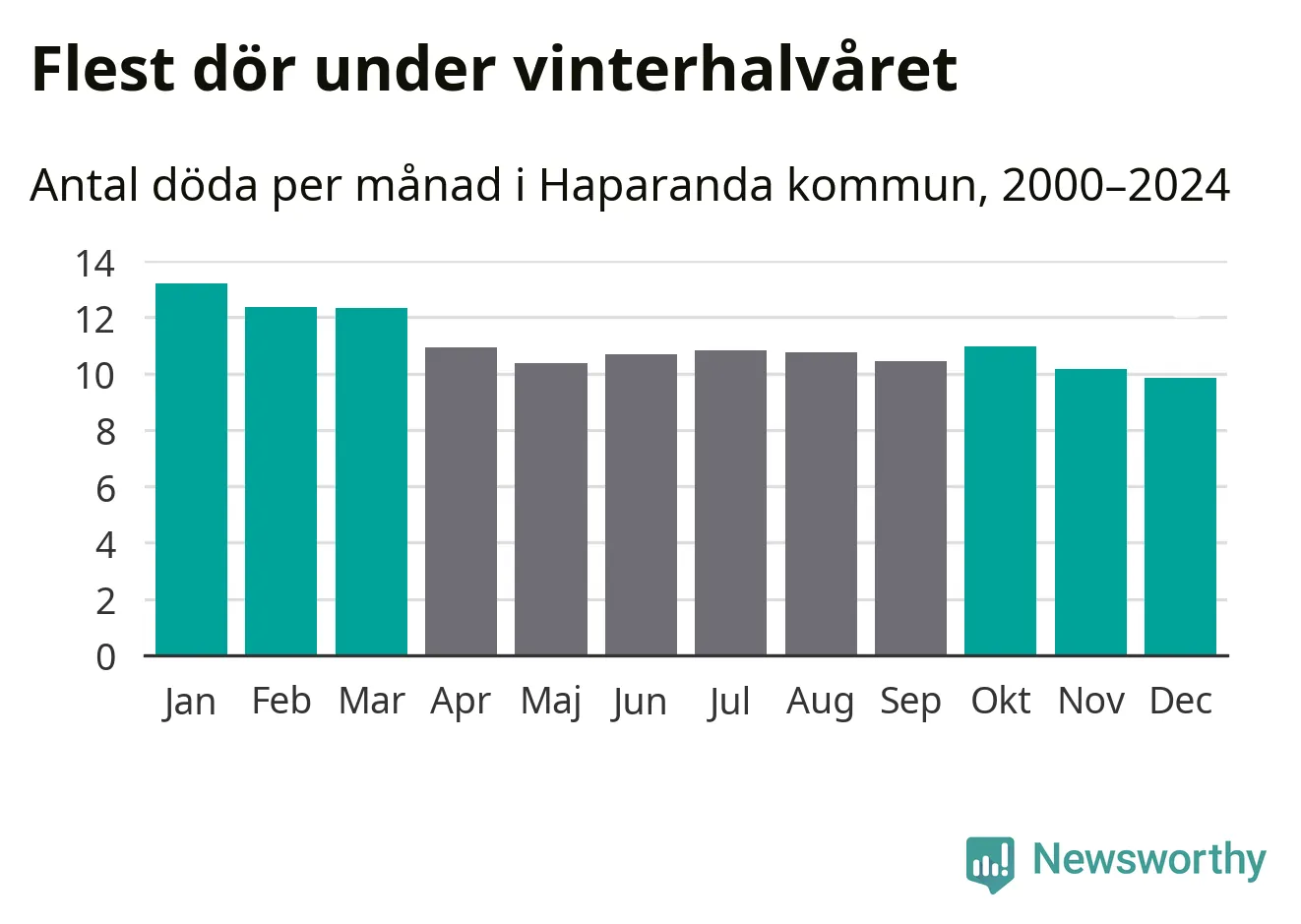 I landet som helhet är det veckorna kring årsskiftet som är de allra dödligaste. Så är det även i Haparanda, där den dödligaste perioden infaller under vecka 1, enligt statistik för de senaste 25 åren. Sammanlagt handlar det om 85 personer , vilket är 35 procent fler än snittet för resten av året.