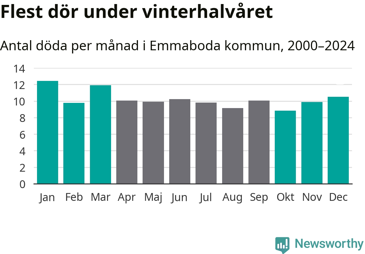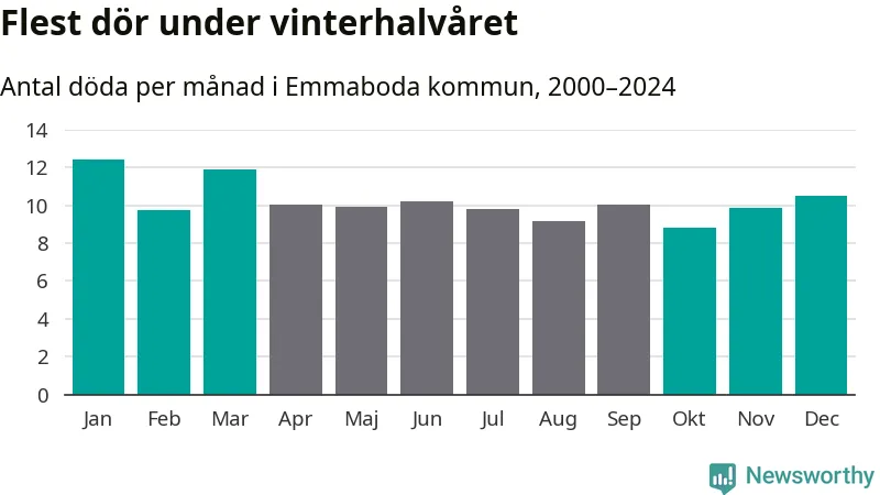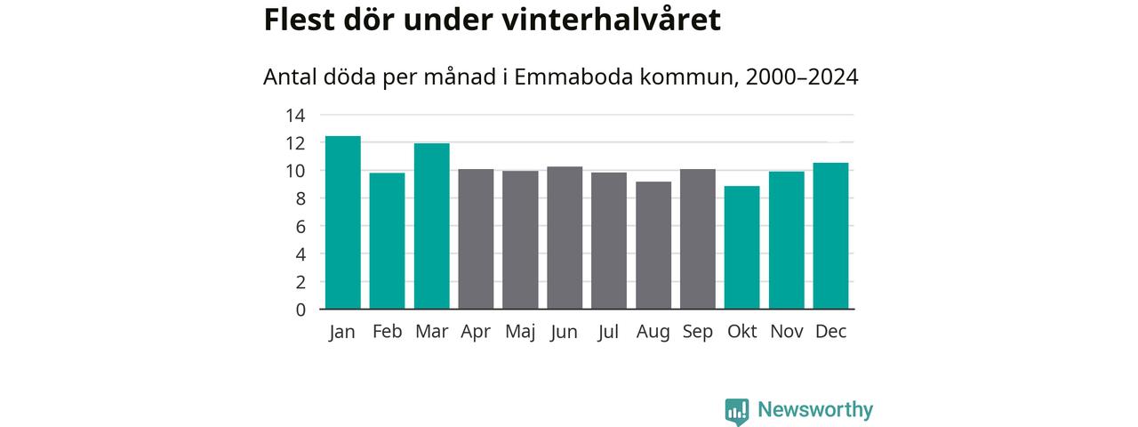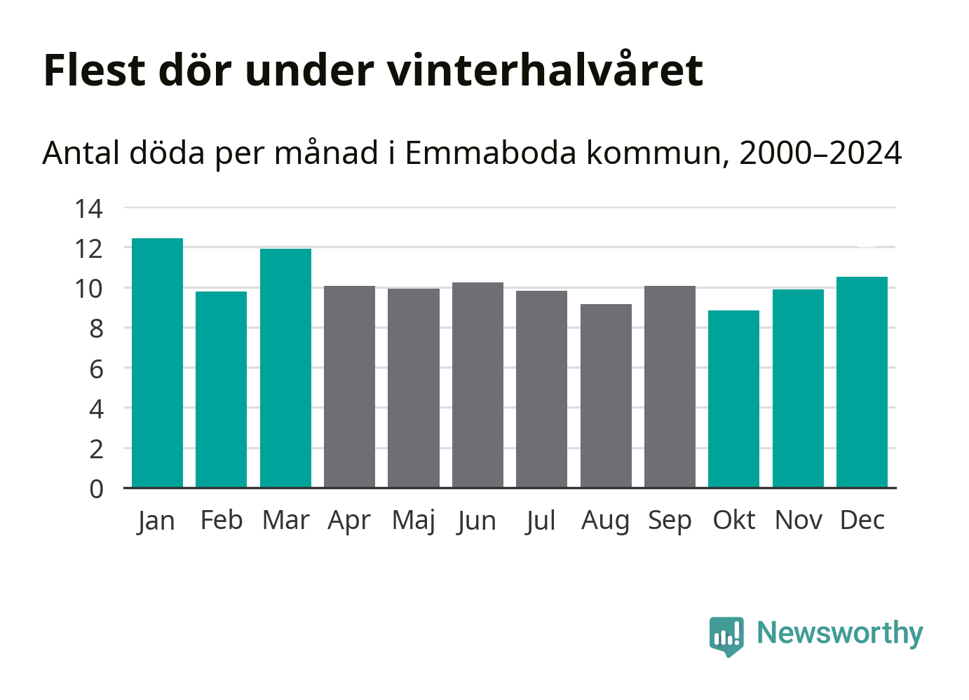 Så är det även i Emmaboda. Under de senaste 25 åren har 1 588 personer dött i kommunen under vinterhalvåret, jämfört med 1 430 personer under sommarhalvåret – alltså elva procent fler.
