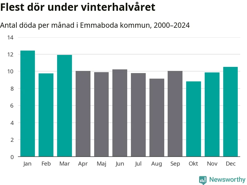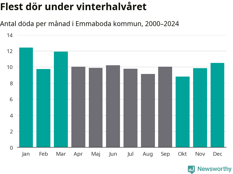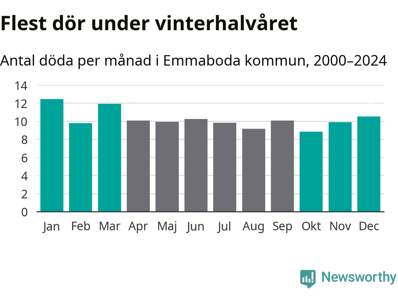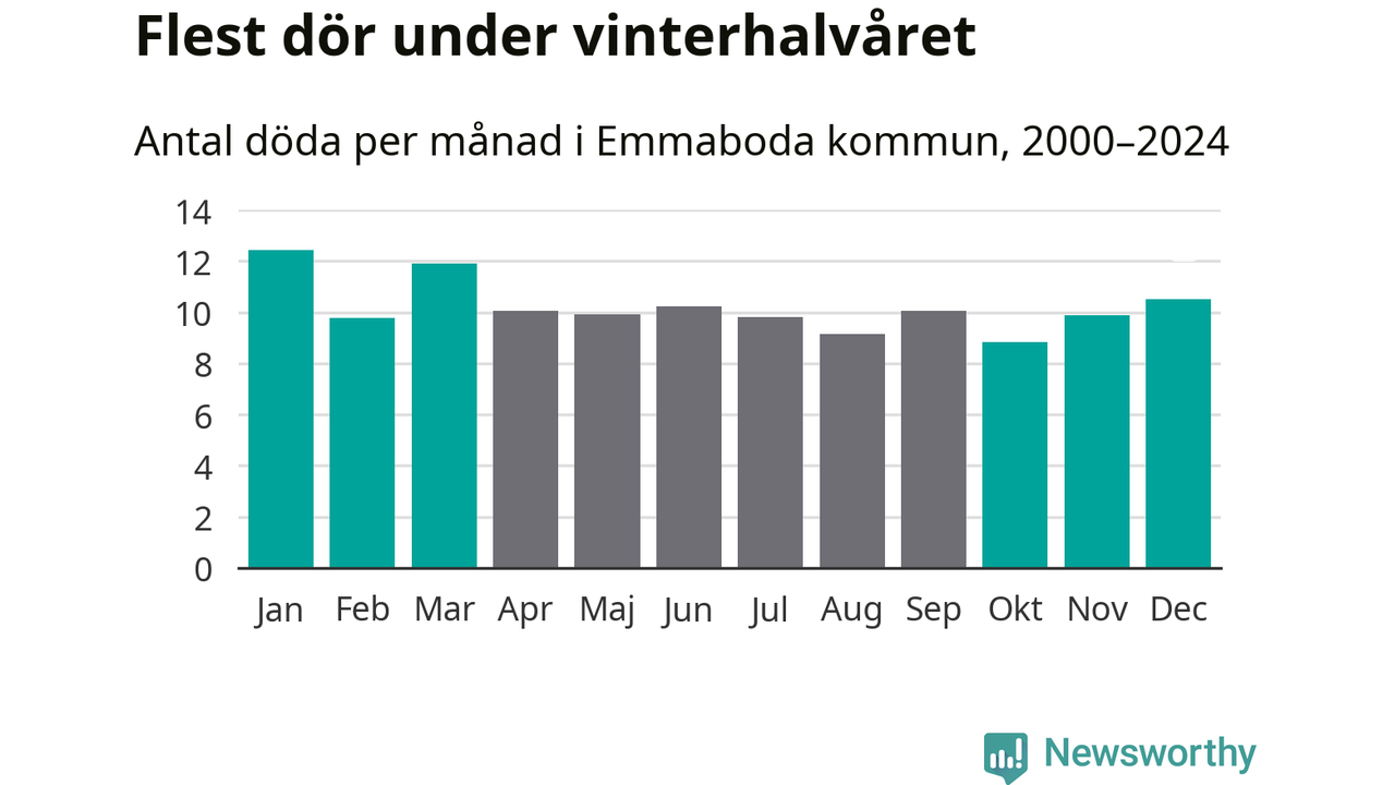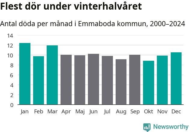 Så är det även i Emmaboda. Under de senaste 25 åren har 1 588 personer dött i kommunen under vinterhalvåret, jämfört med 1 430 personer under sommarhalvåret – alltså elva procent fler.