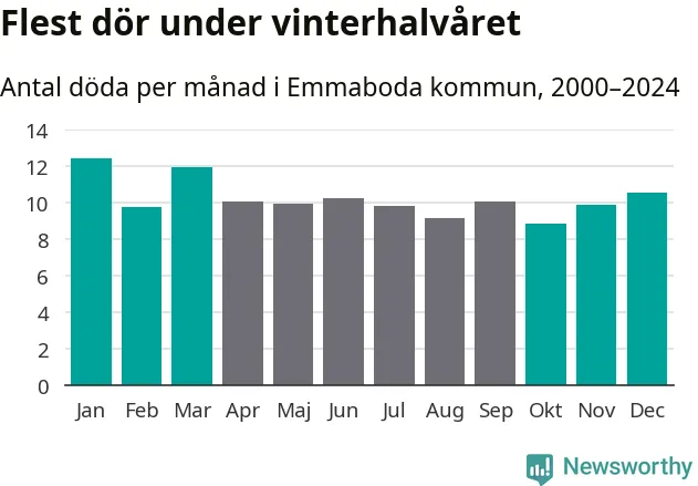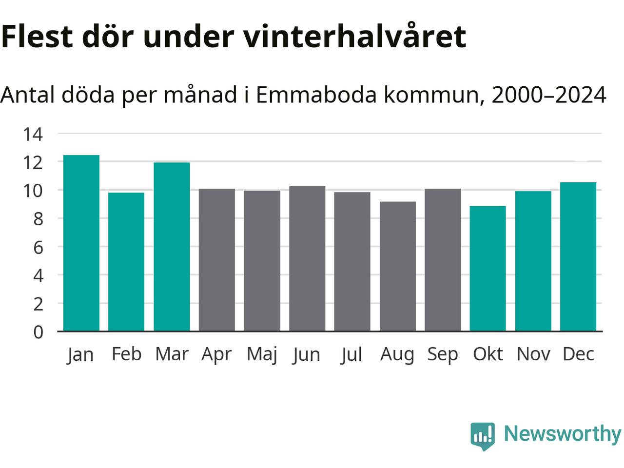 I landet som helhet är det veckorna kring årsskiftet som är de allra dödligaste. Så är det även i Emmaboda, där den dödligaste perioden infaller under vecka 1, enligt statistik för de senaste 25 åren. Sammanlagt handlar det om 77 personer , vilket är 33 procent fler än snittet för resten av året.