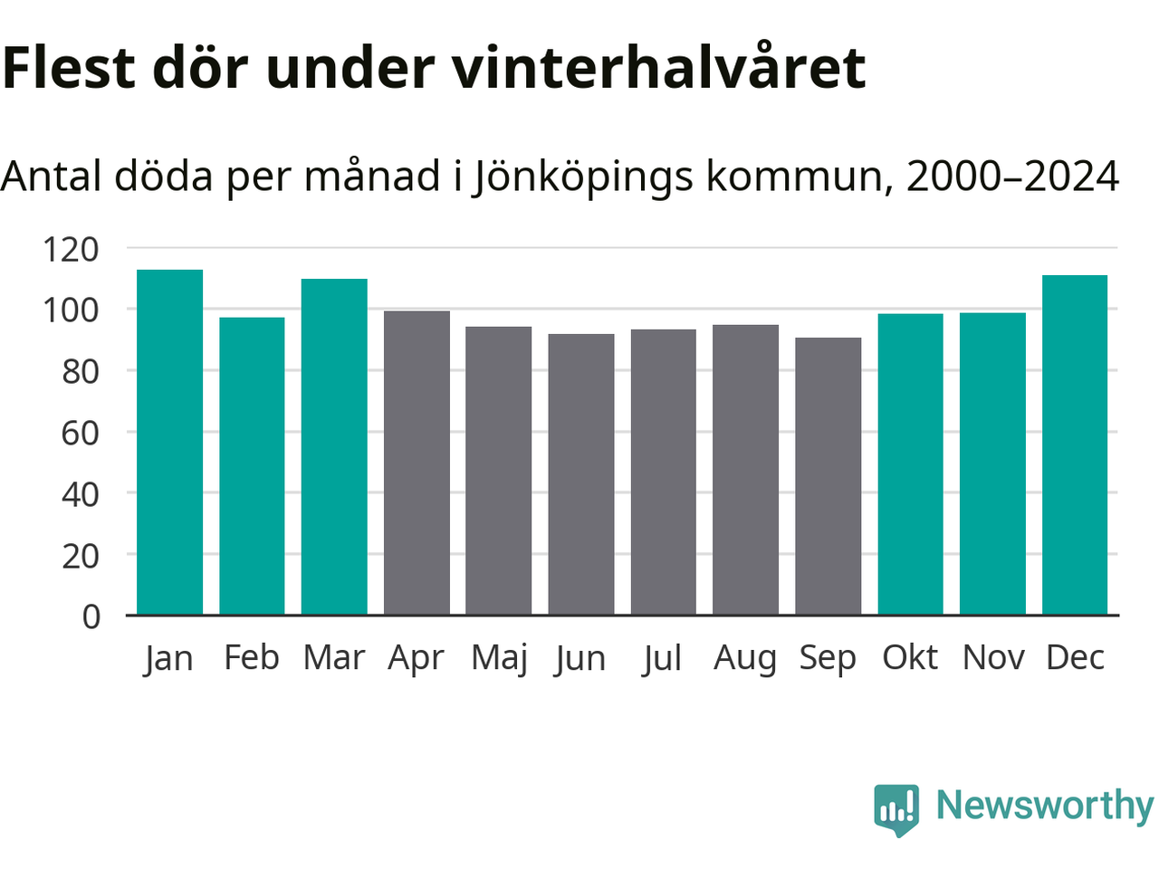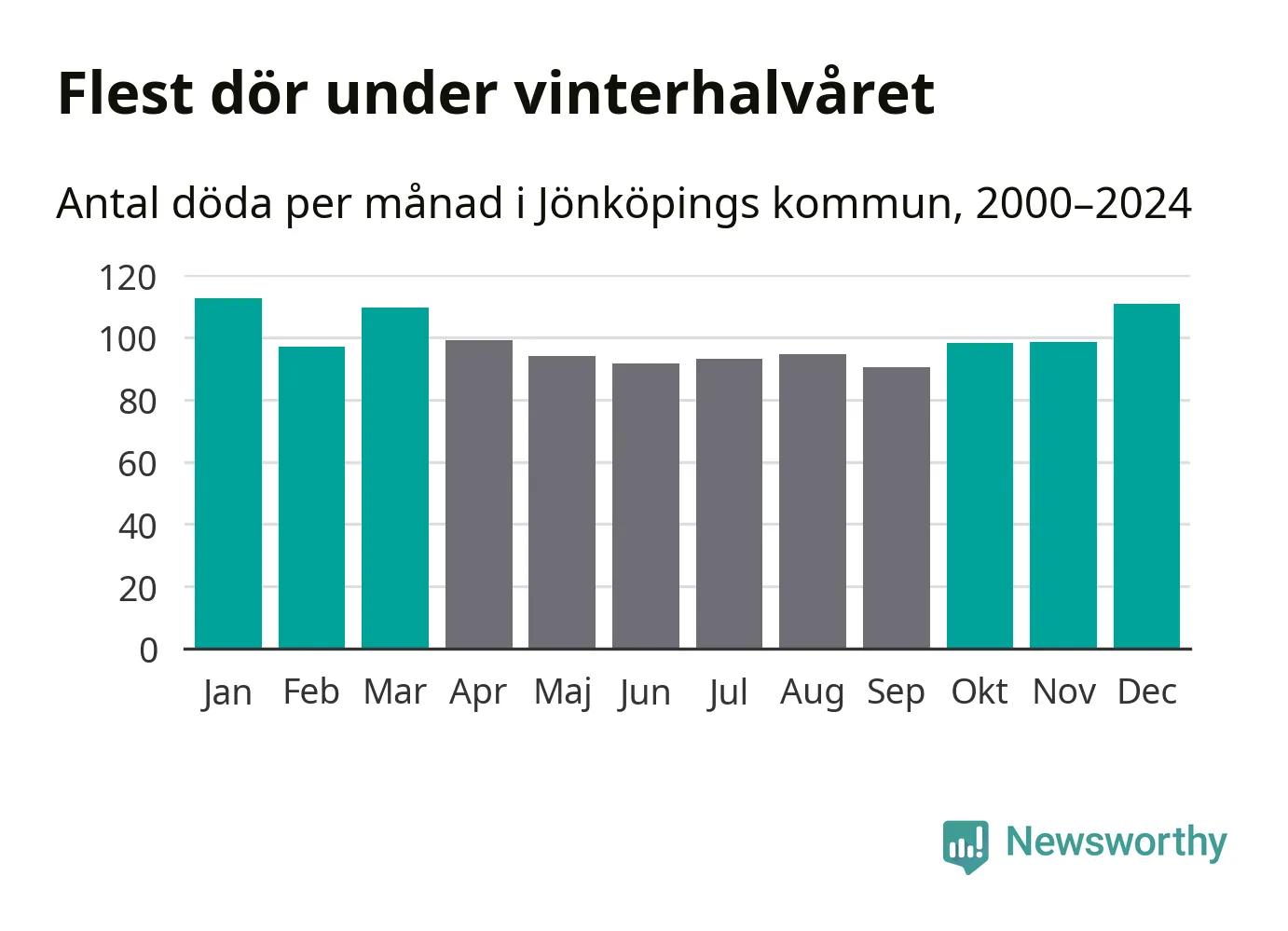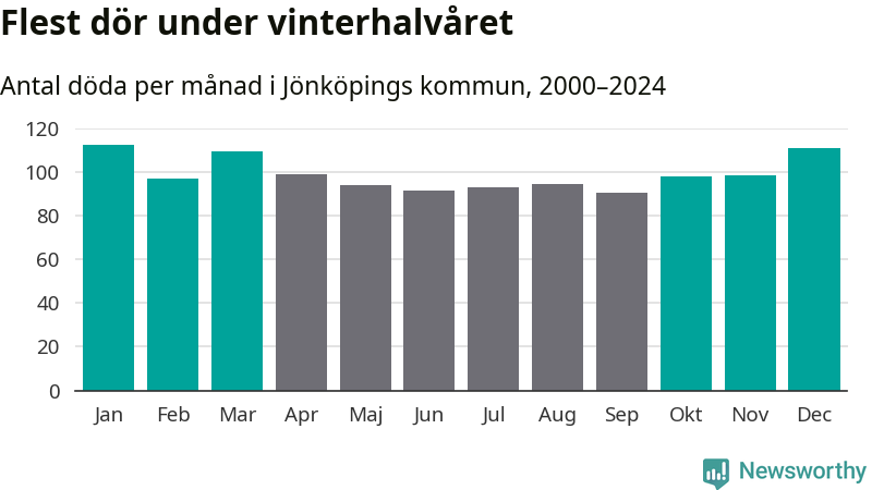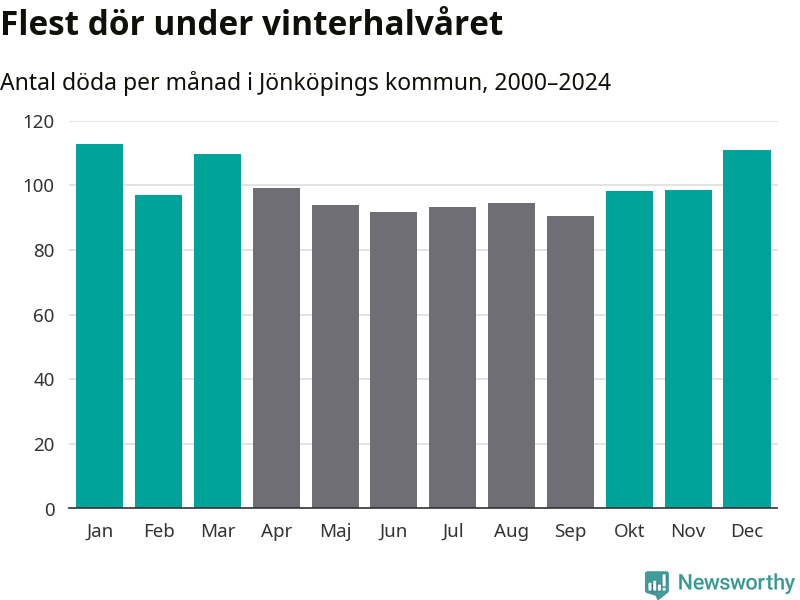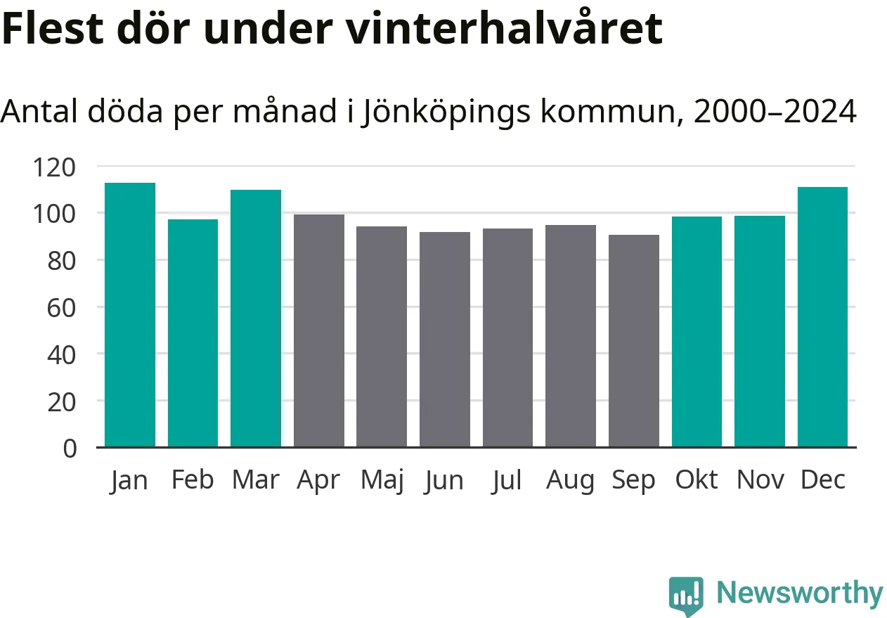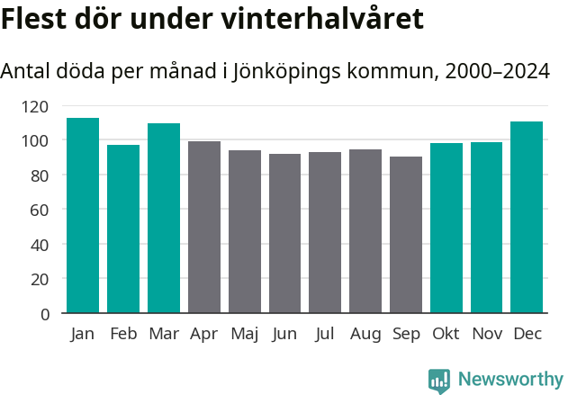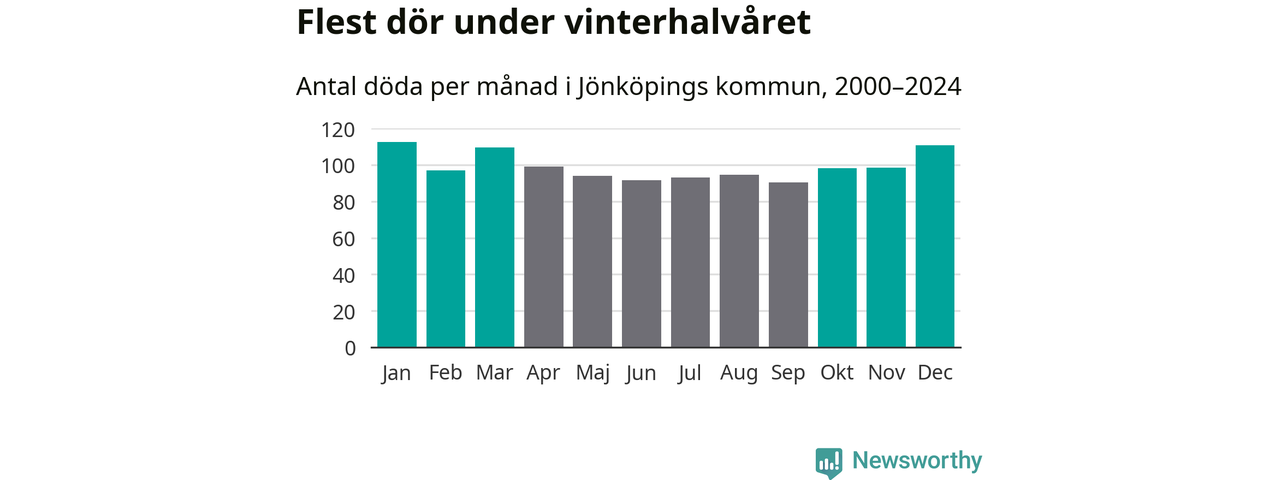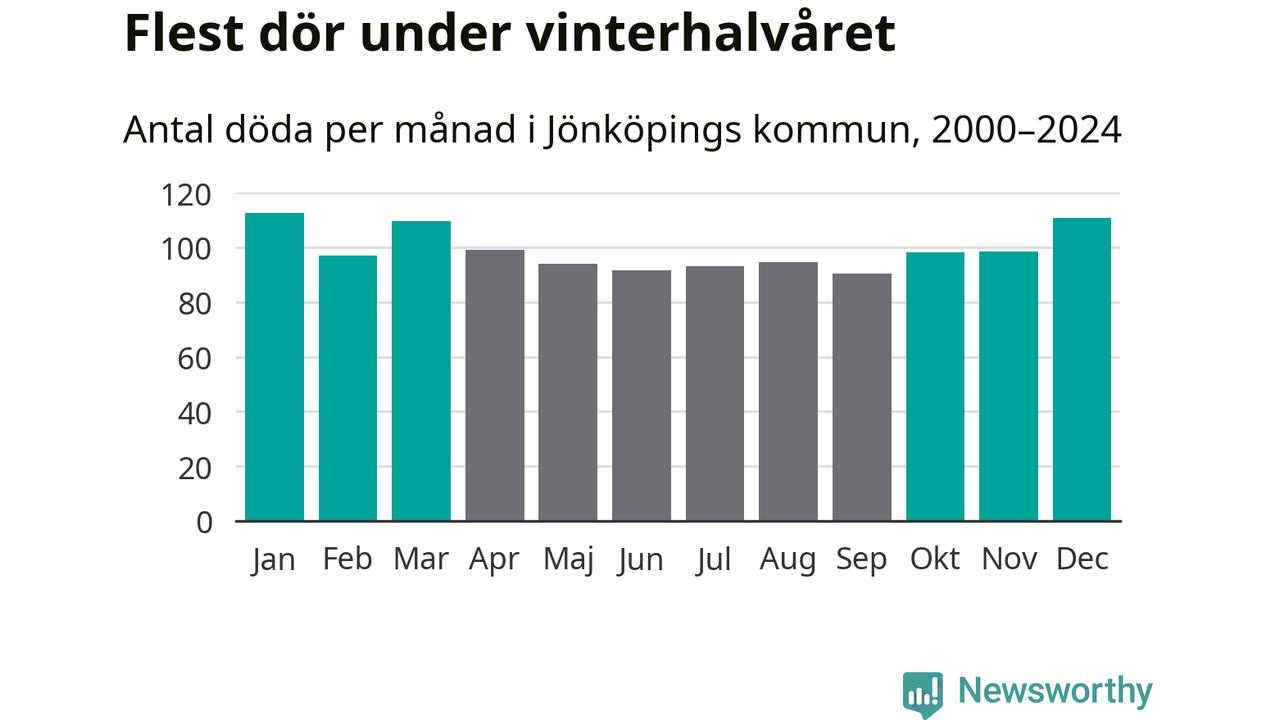Så är det även i Jönköping. Under de senaste 25 åren har 15 440 personer dött i kommunen under vinterhalvåret, jämfört med 13 874 personer under sommarhalvåret – alltså elva procent fler.