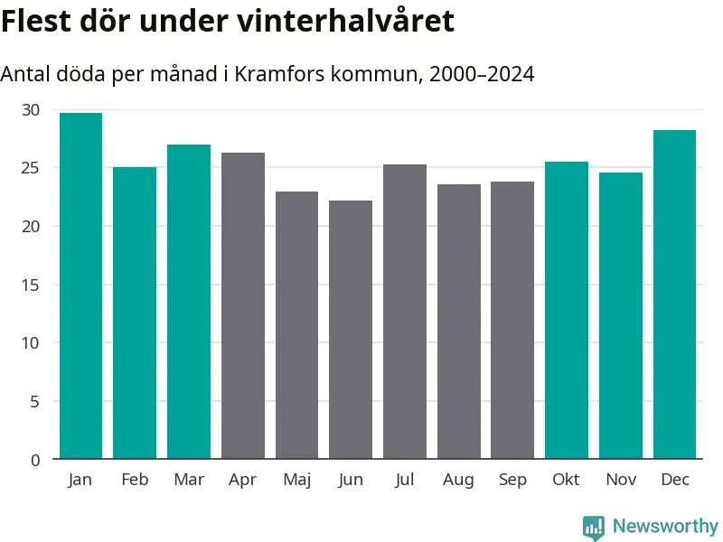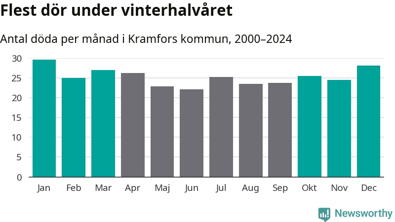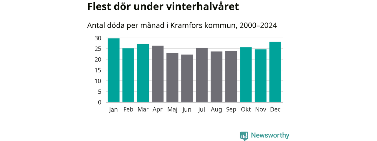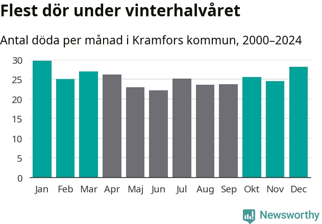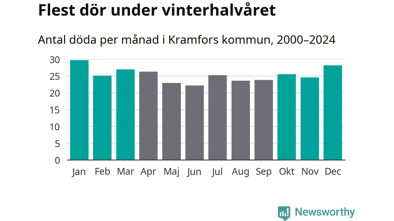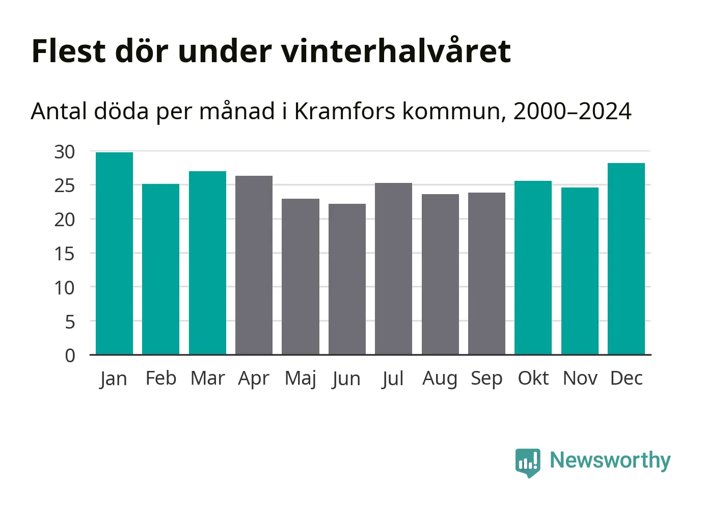Så är det även i Kramfors. Under de senaste 25 åren har 3 974 personer dött i kommunen under vinterhalvåret, jämfört med 3 527 personer under sommarhalvåret – alltså 13 procent fler.