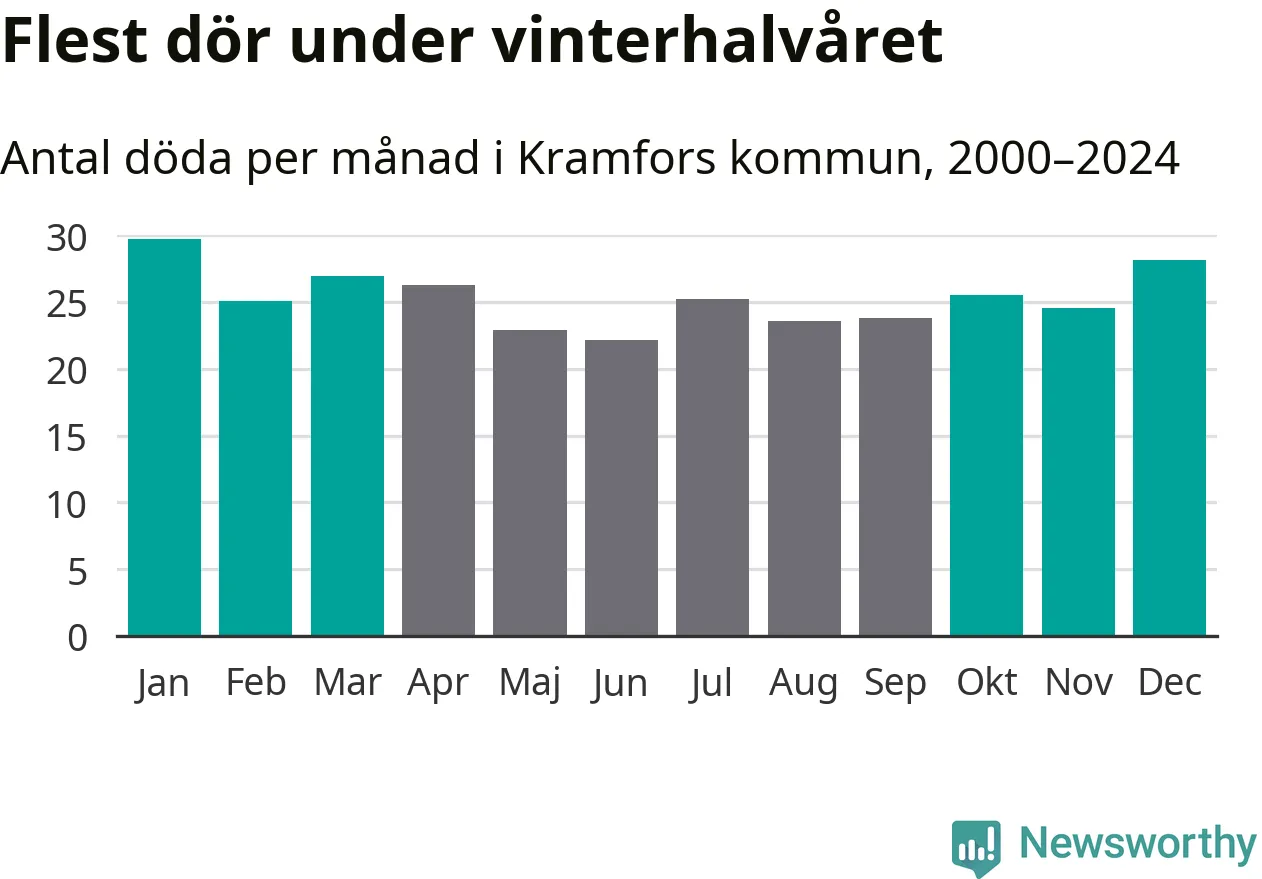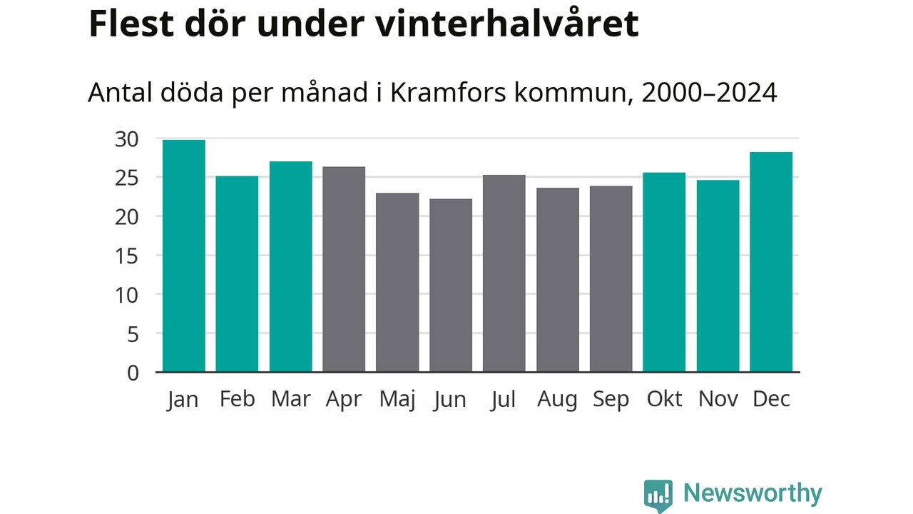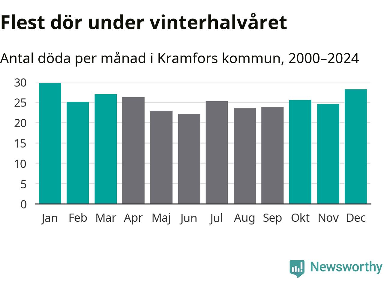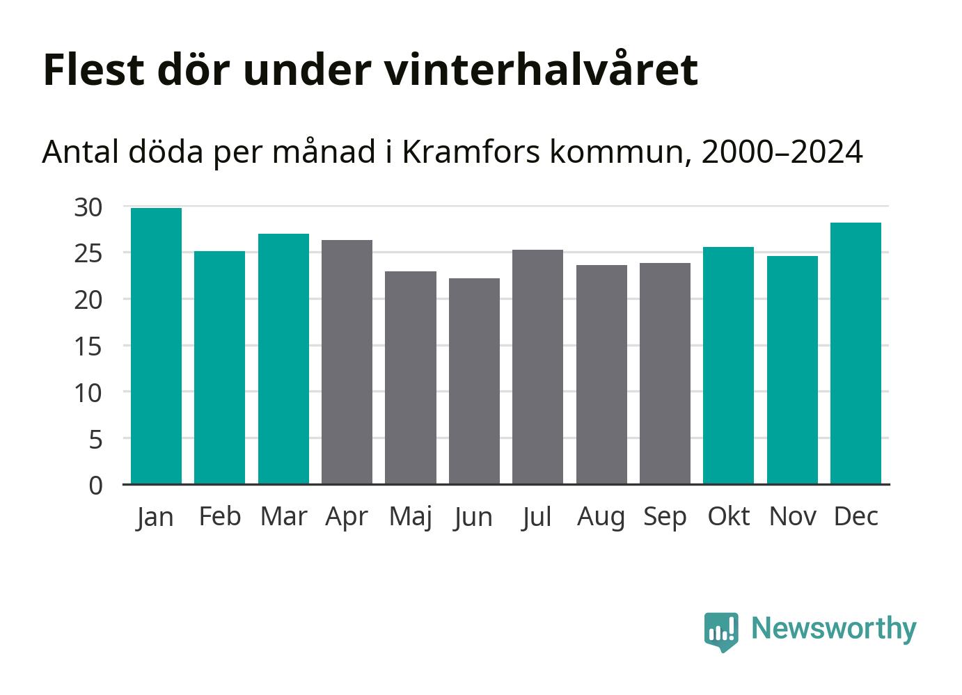 I landet som helhet är det veckorna kring årsskiftet som är de allra dödligaste. Så är det även i Kramfors, där den dödligaste perioden infaller under vecka 2, enligt statistik för de senaste 25 åren. Sammanlagt handlar det om 174 personer , vilket är 21 procent fler än snittet för resten av året.