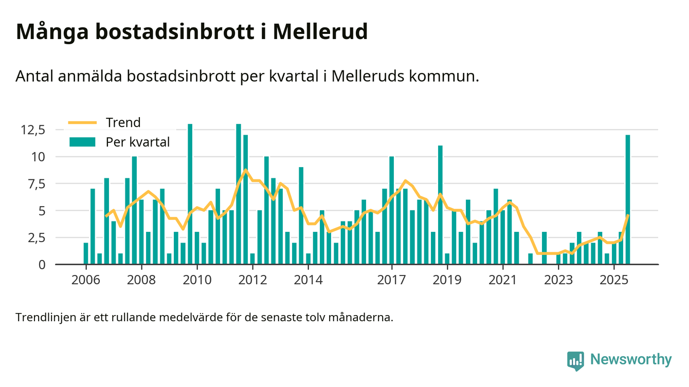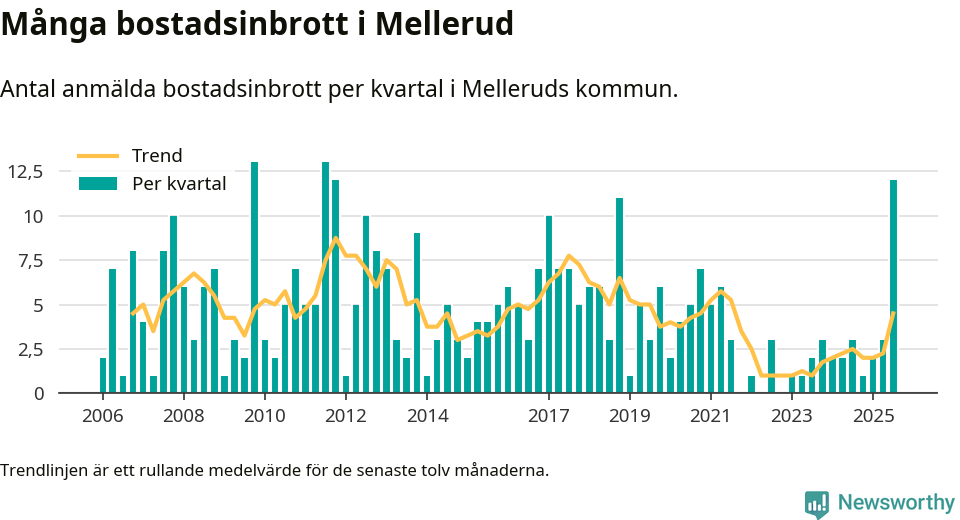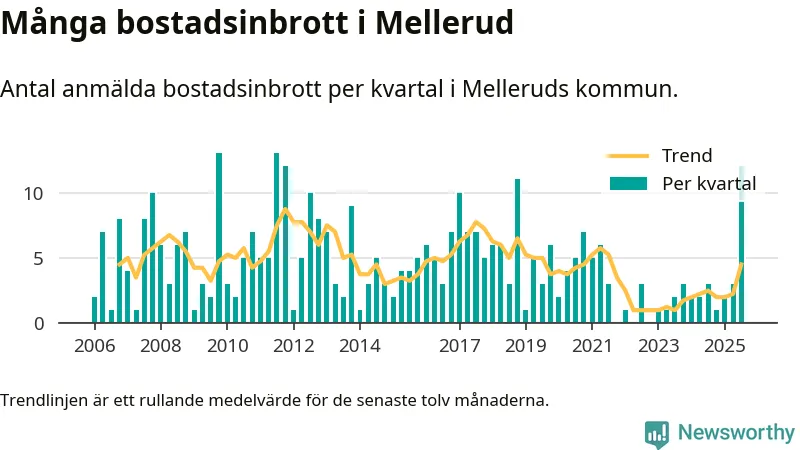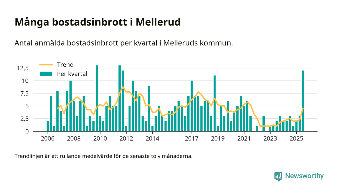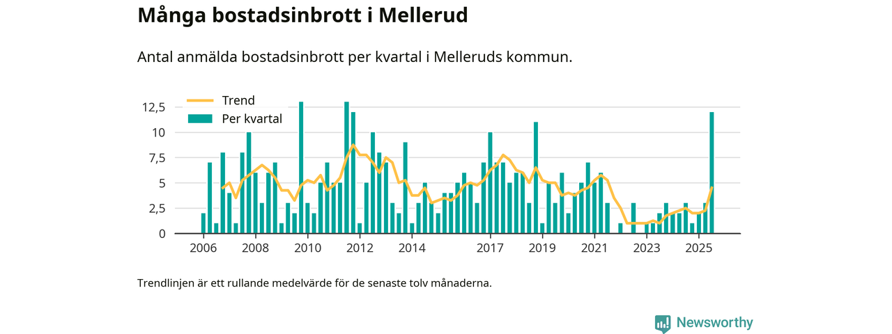 Det anmäldes sammanlagt tolv bostadsinbrott i Melleruds kommun under tredje kvartalet 2025. Vi får gå tillbaka till fjärde kvartalet 2011 för att hitta ett kvartal då det anmäldes lika många bostadsinbrott i kommunen.