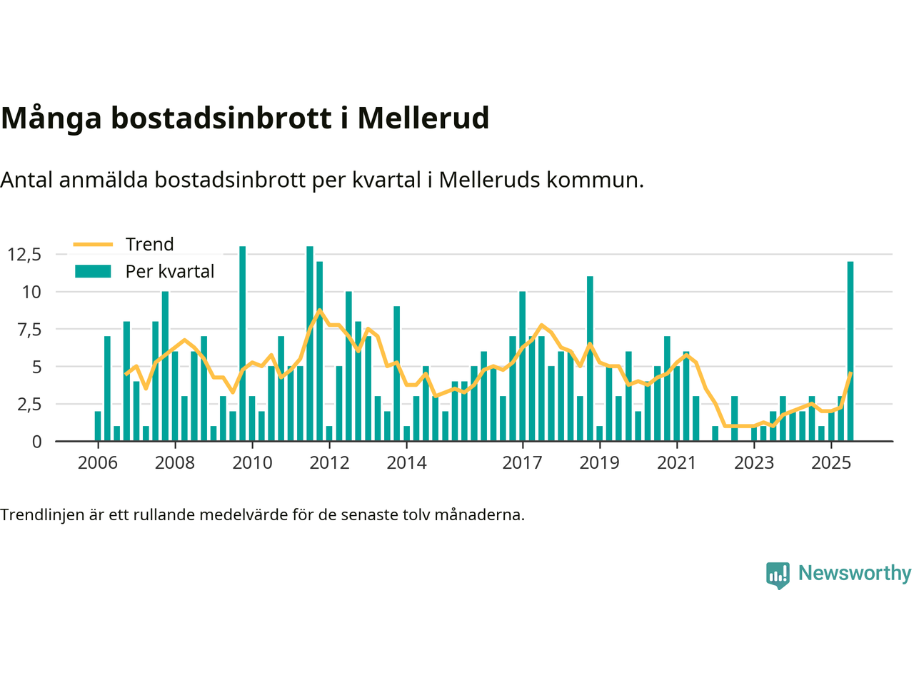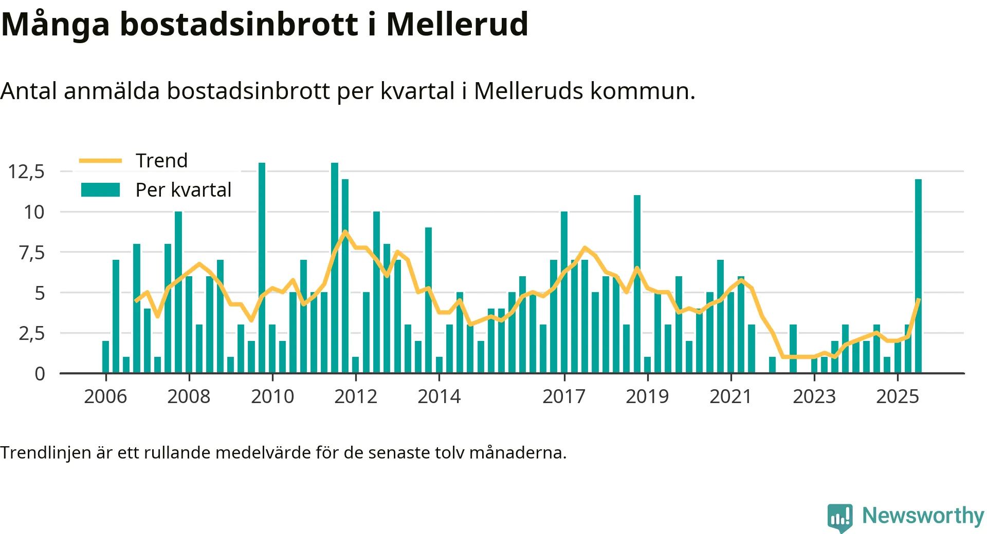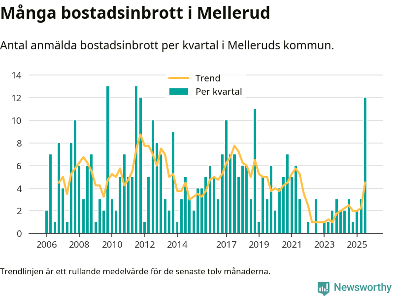 Det anmäldes sammanlagt tolv bostadsinbrott i Melleruds kommun under tredje kvartalet 2025. Vi får gå tillbaka till fjärde kvartalet 2011 för att hitta ett kvartal då det anmäldes lika många bostadsinbrott i kommunen.