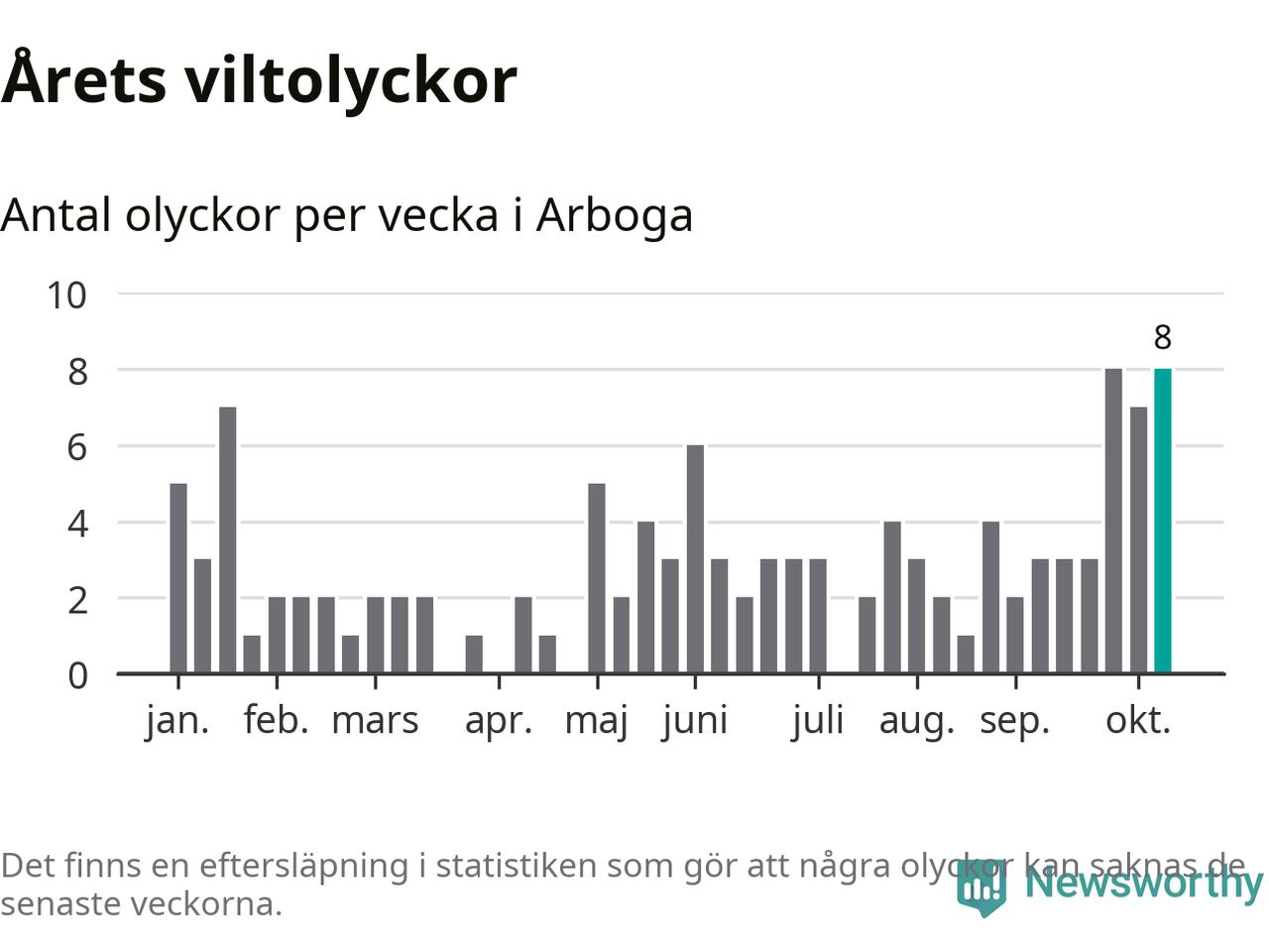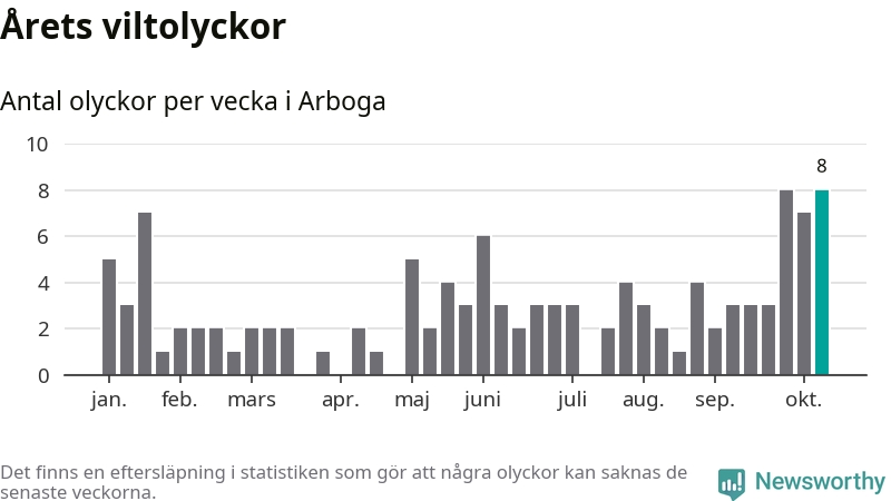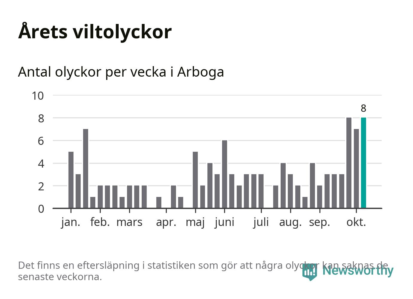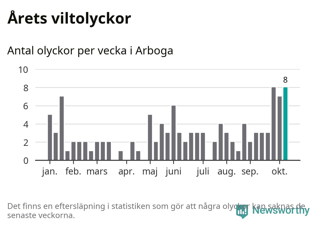 Åtta olyckor på en enda vecka är också ovanligt många. Bara sju gånger tidigare sedan 2015 har det skett så många viltolyckor på en vecka i Arboga kommun.