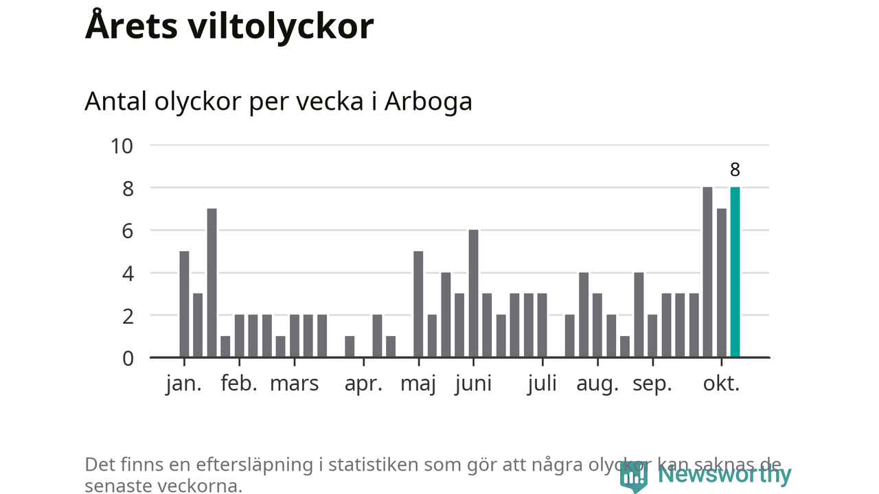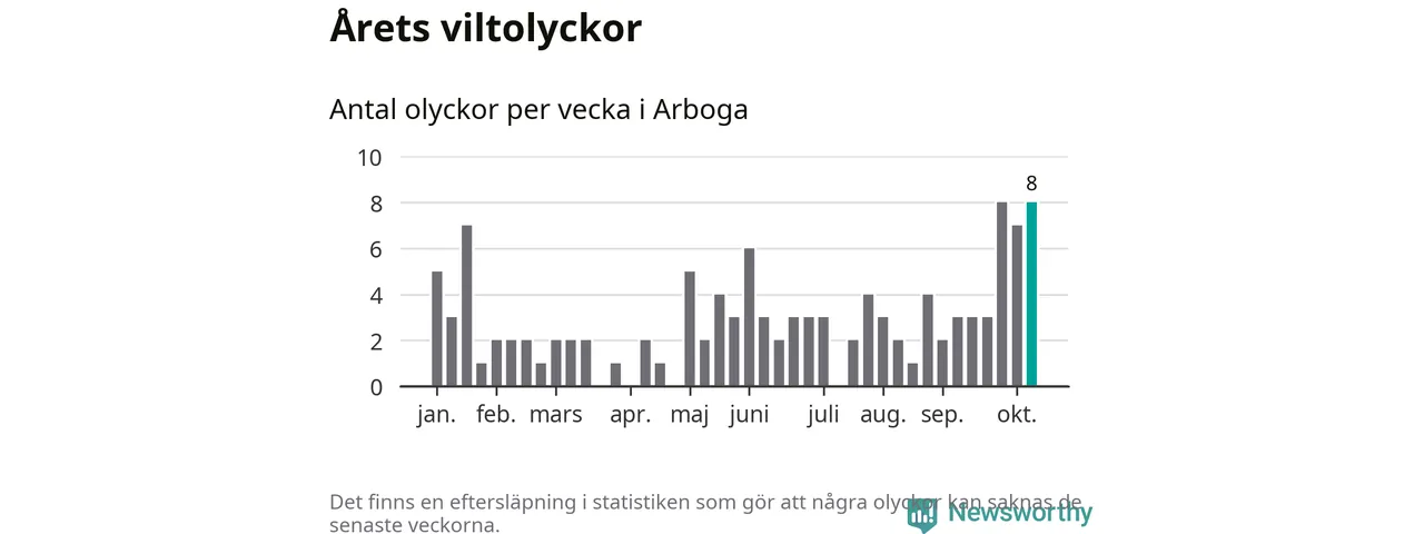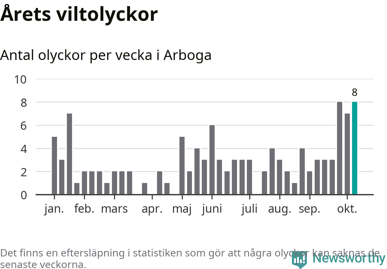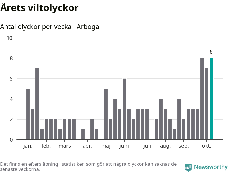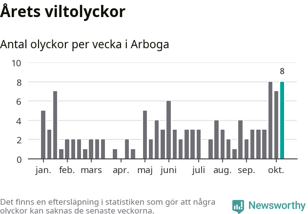 Åtta olyckor på en enda vecka är också ovanligt många. Bara sju gånger tidigare sedan 2015 har det skett så många viltolyckor på en vecka i Arboga kommun.