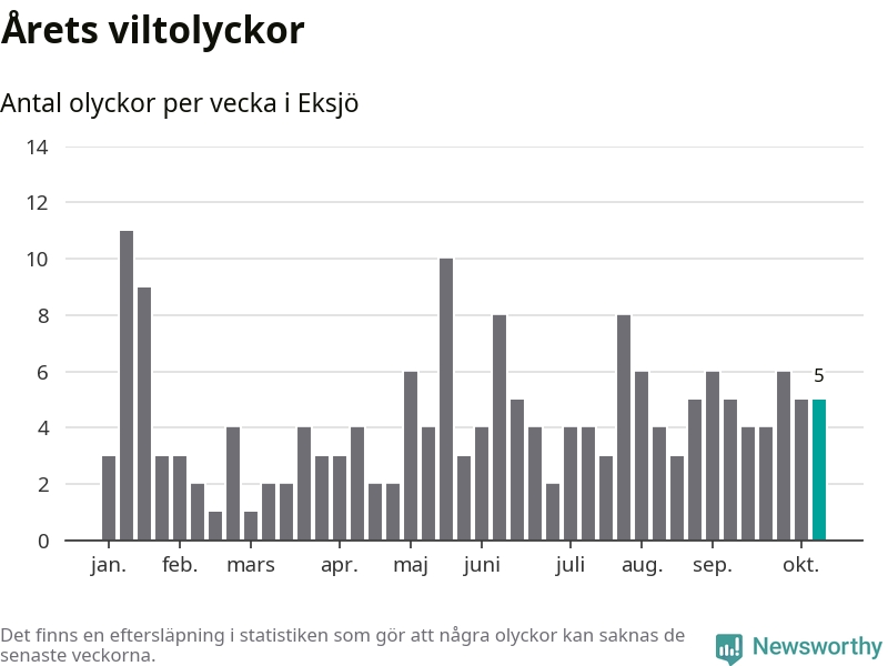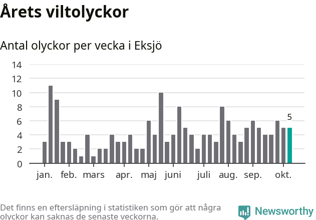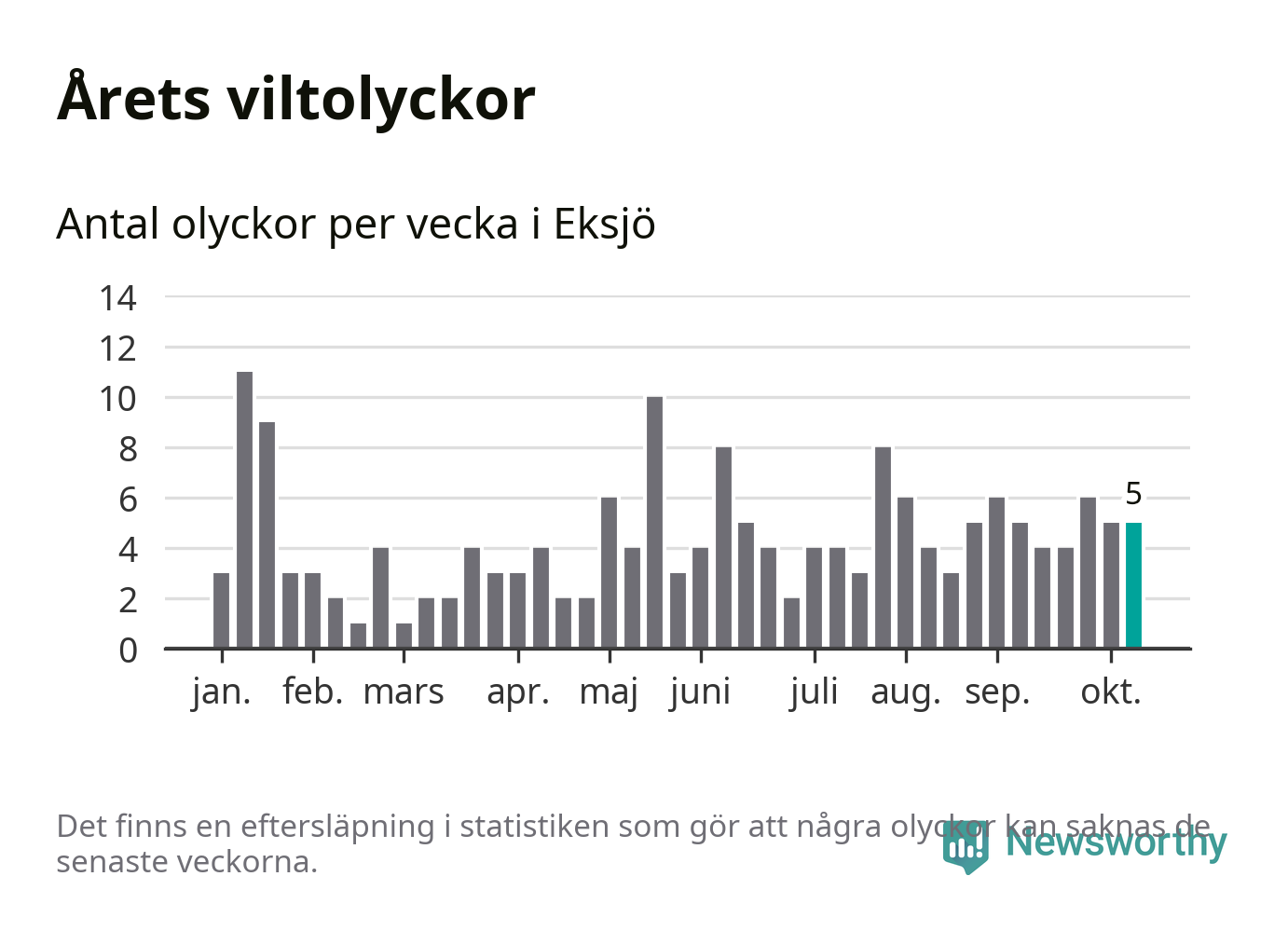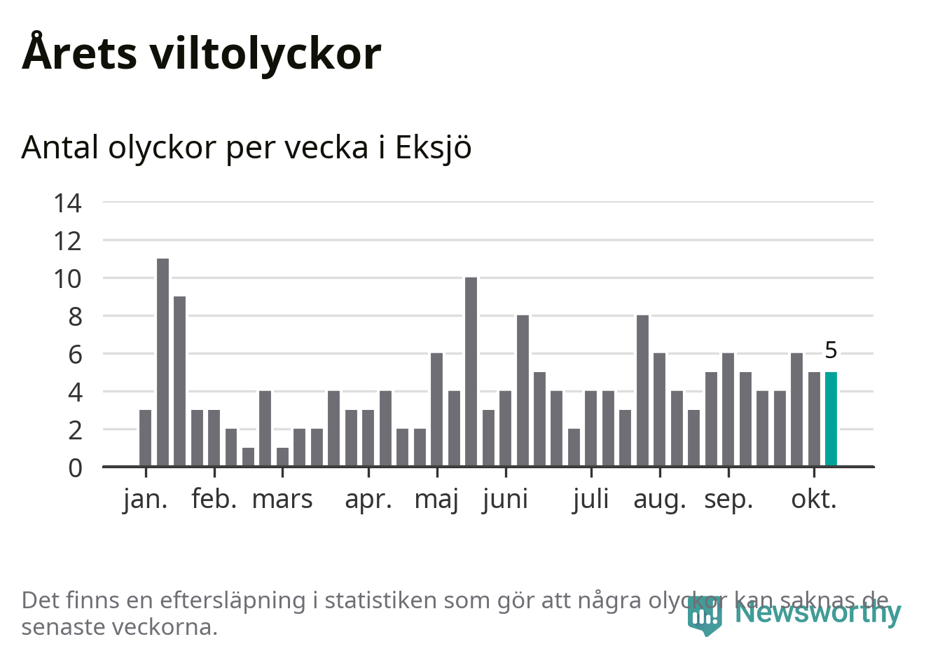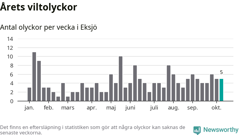 Hittills har fem viltolyckor rapporterats in i Eksjö kommun från vecka 42. Se listan här.