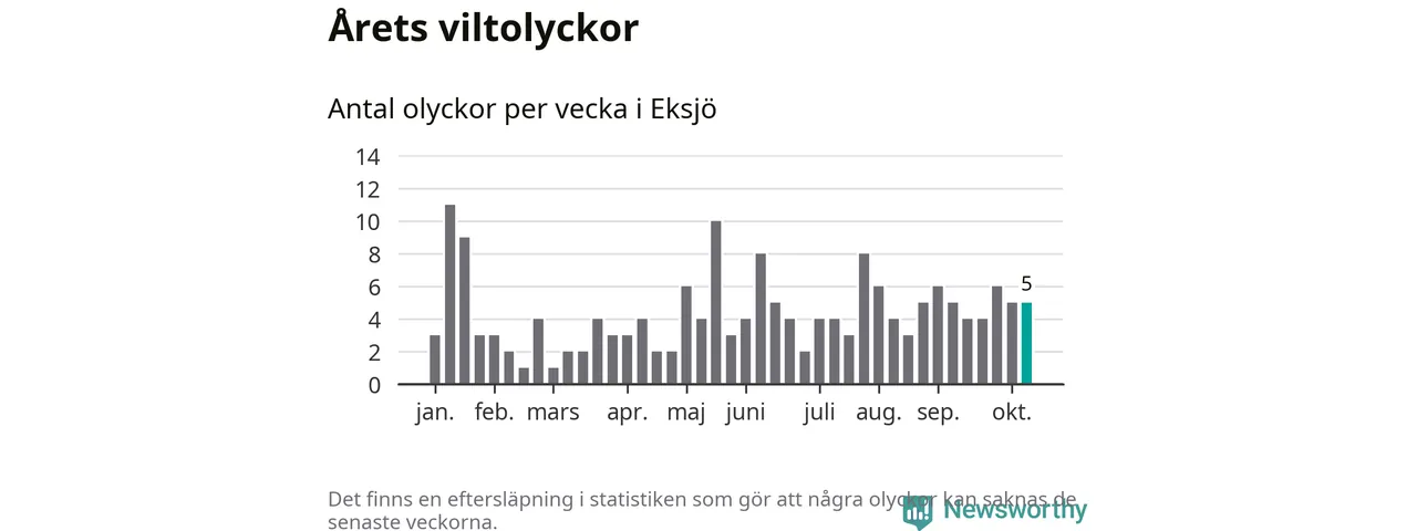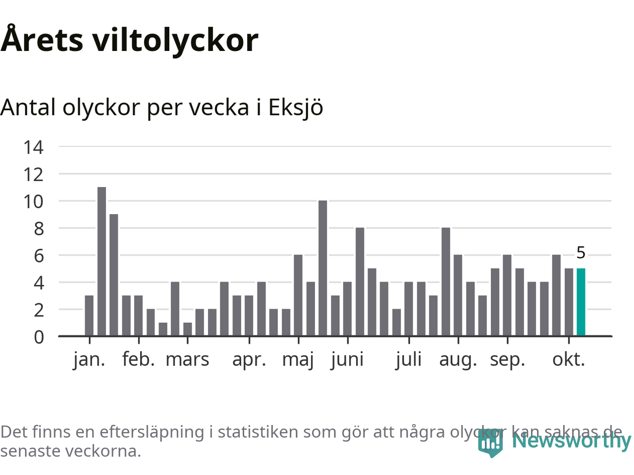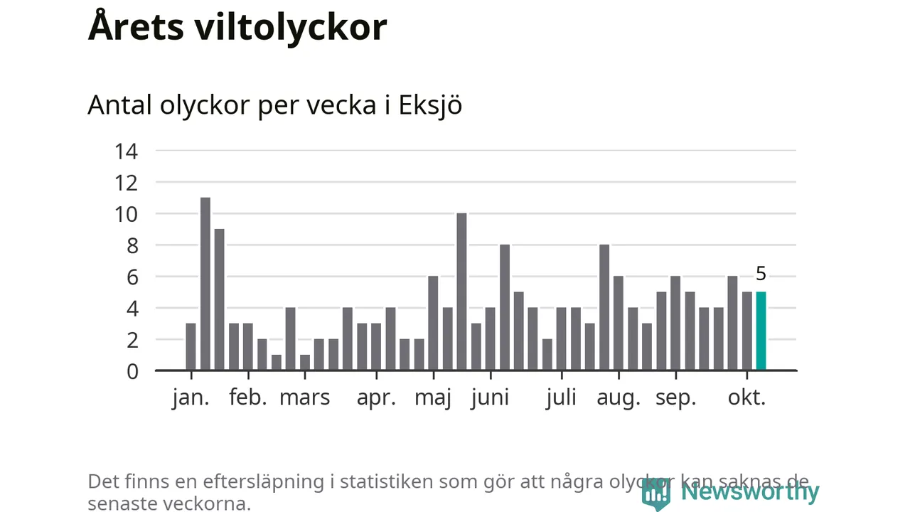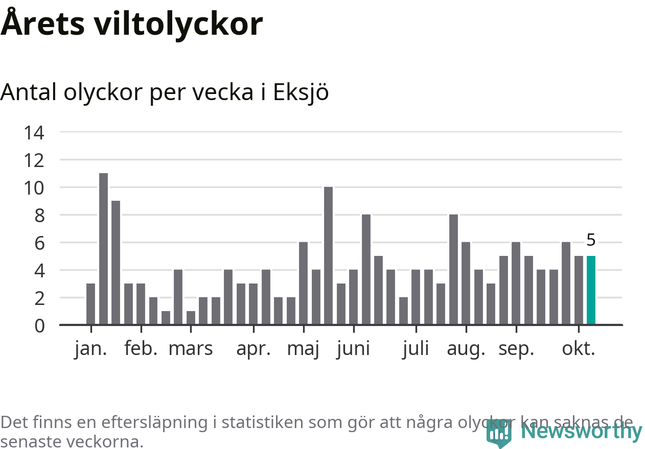 Hittills har fem viltolyckor rapporterats in i Eksjö kommun från vecka 42. Se listan här.