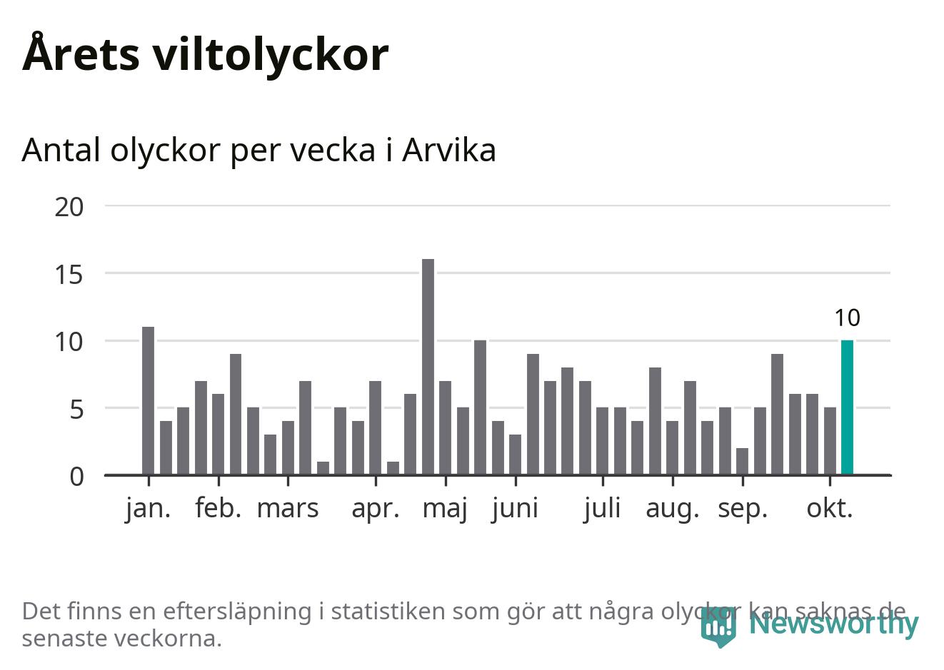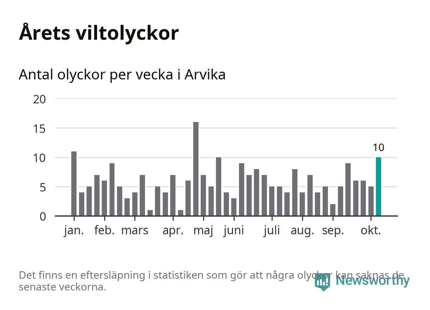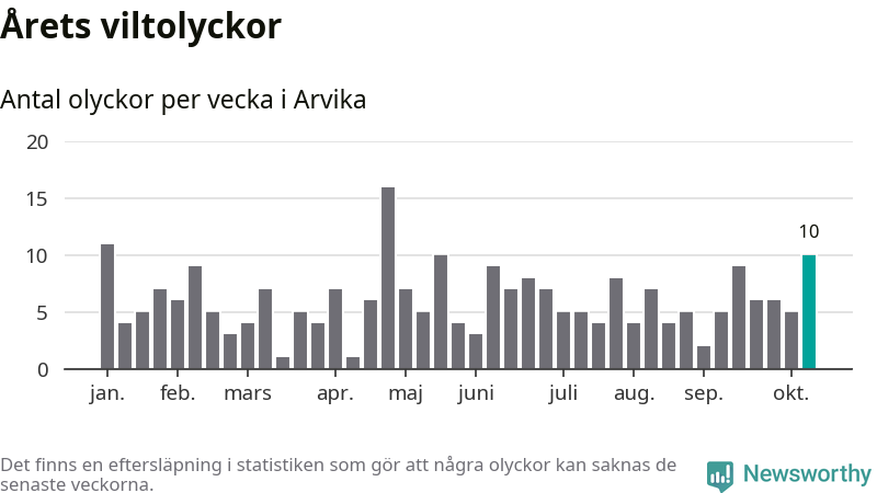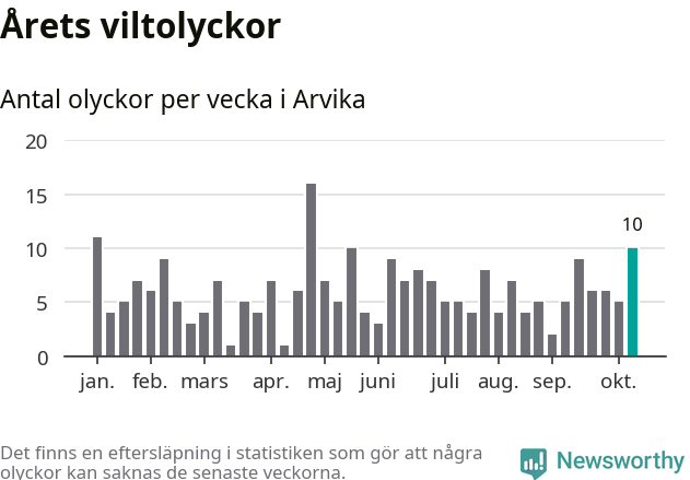 Hittills har tio viltolyckor rapporterats in i Arvika kommun från vecka 42. Se listan här.