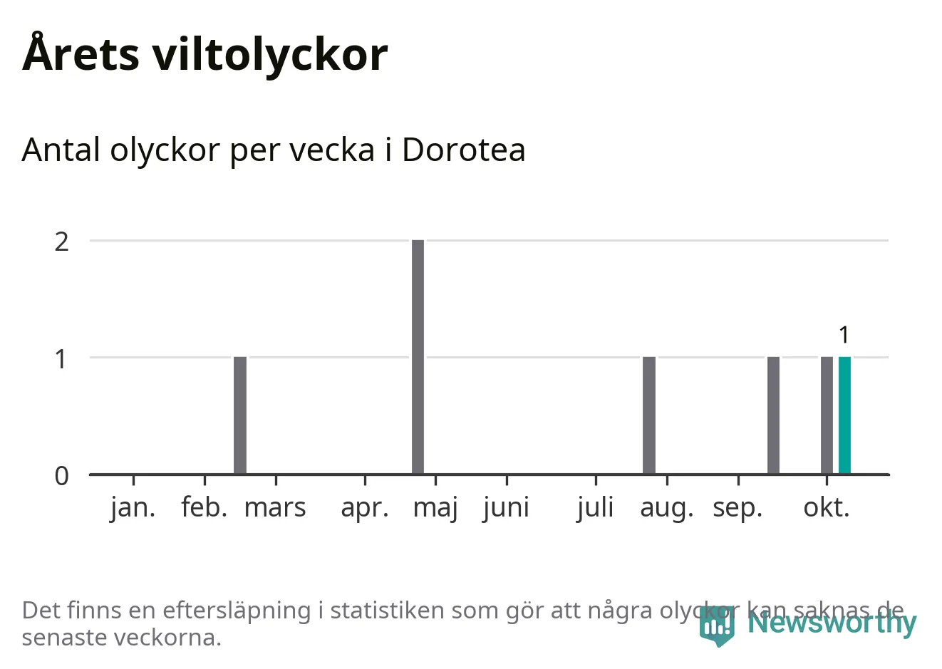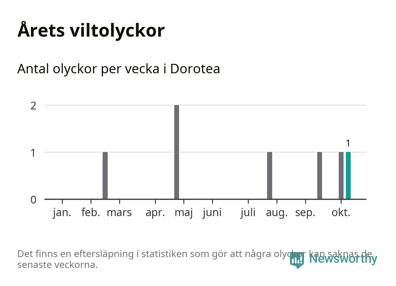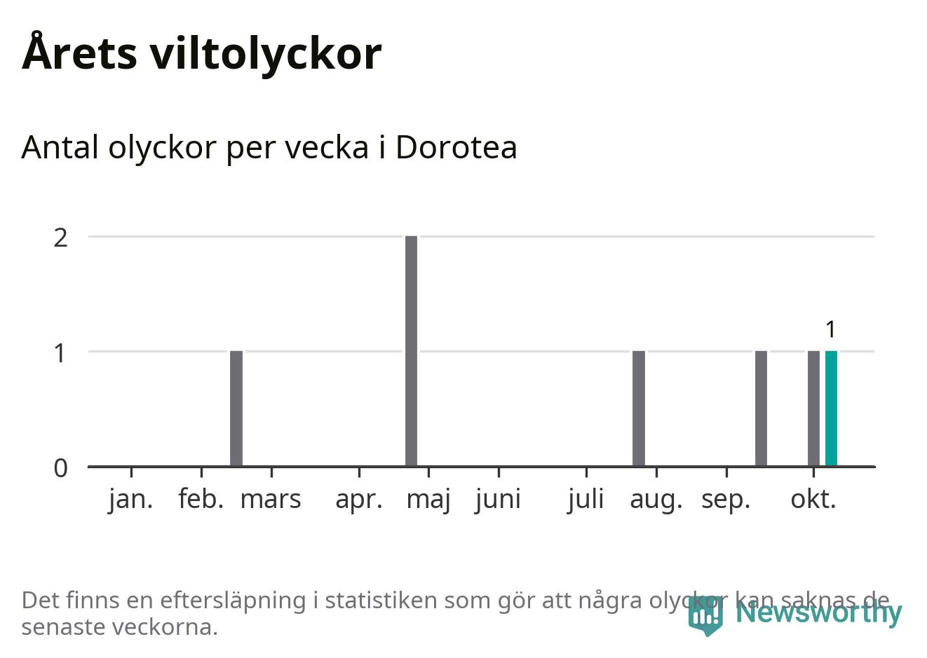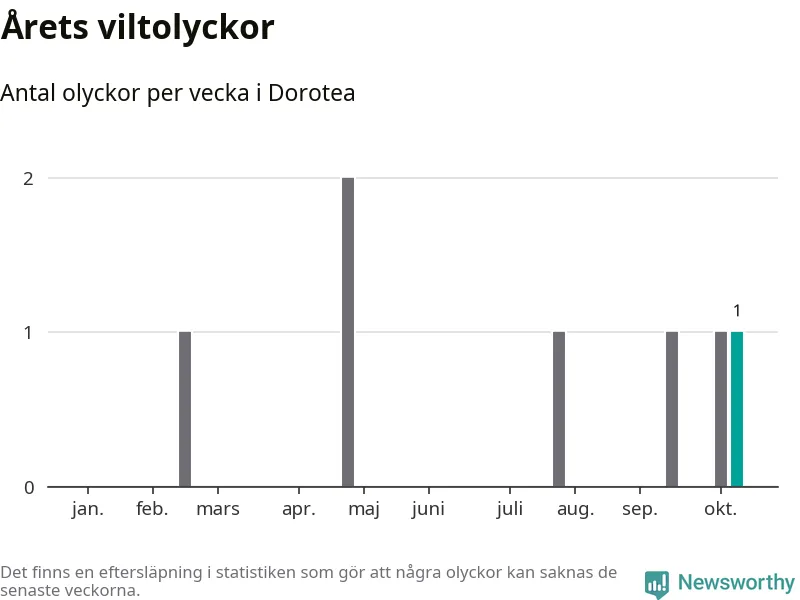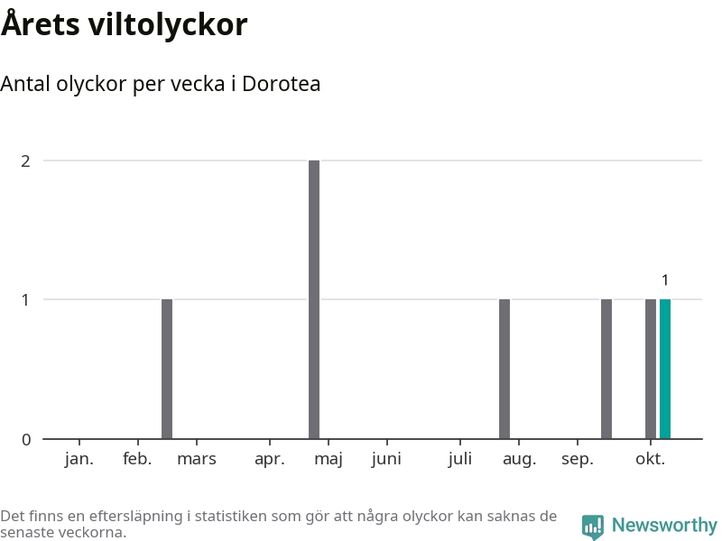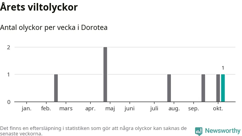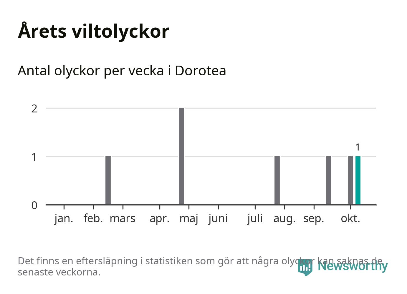 Från förra veckan (vecka 42) har hittills en viltolycka rapporterats in i Dorotea kommun.