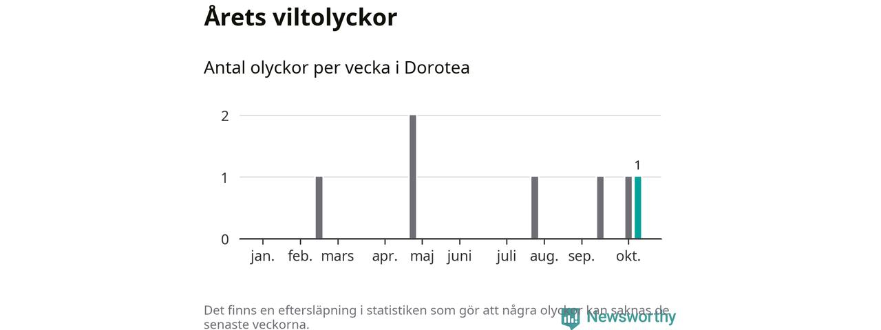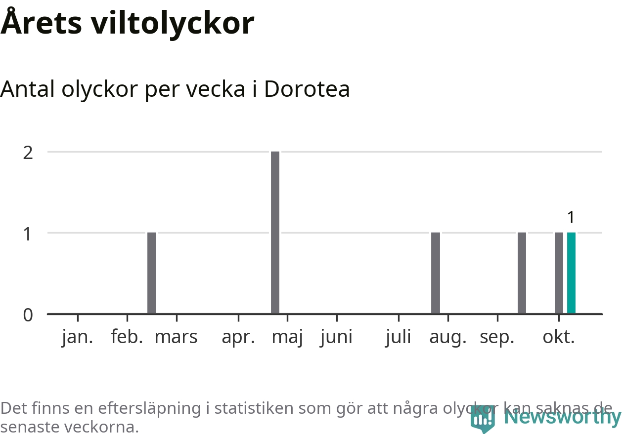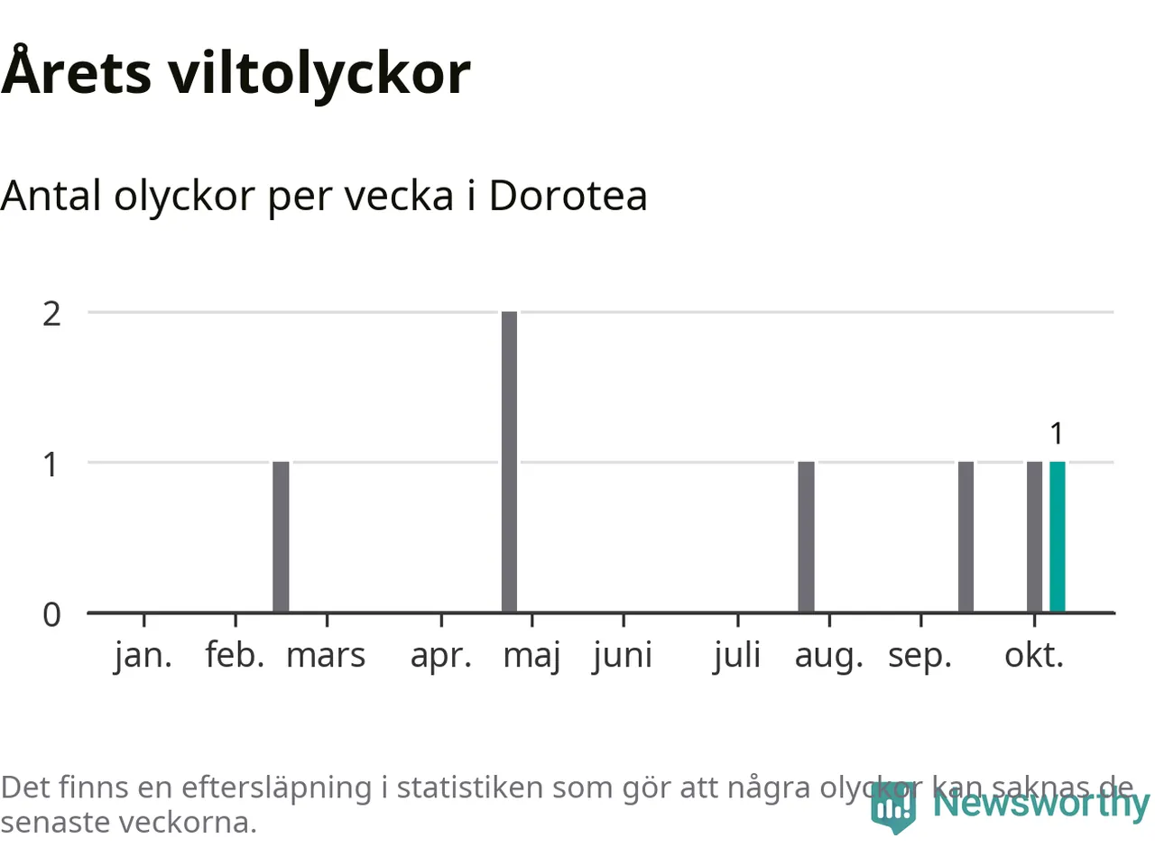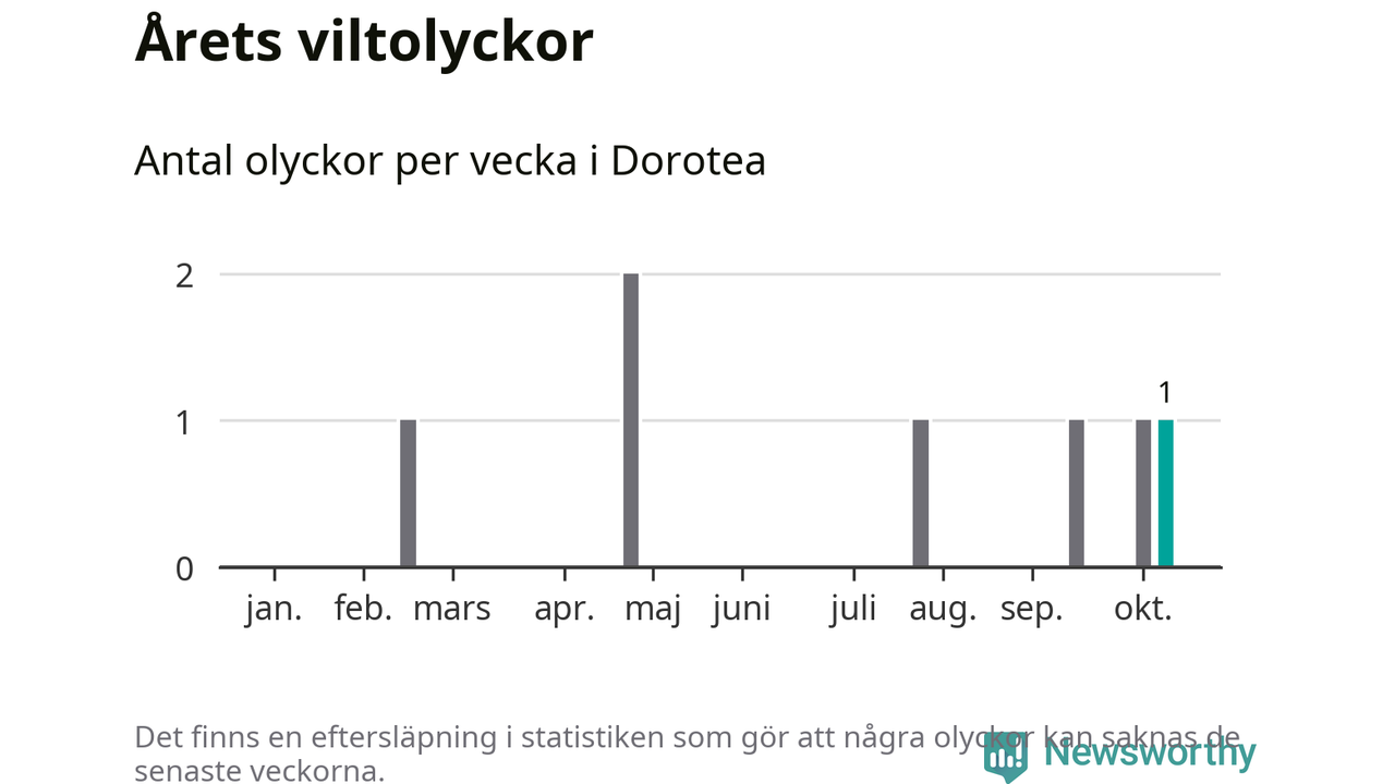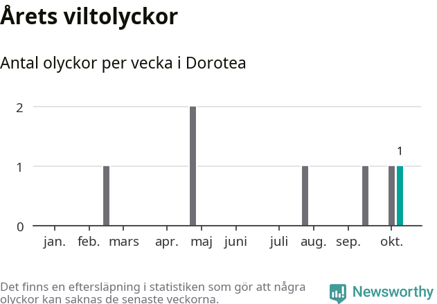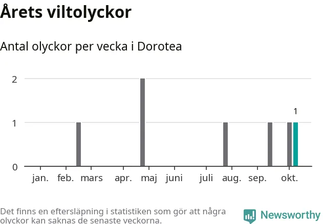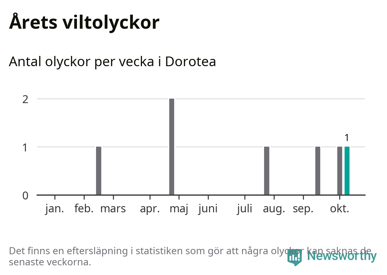 Från förra veckan (vecka 42) har hittills en viltolycka rapporterats in i Dorotea kommun.