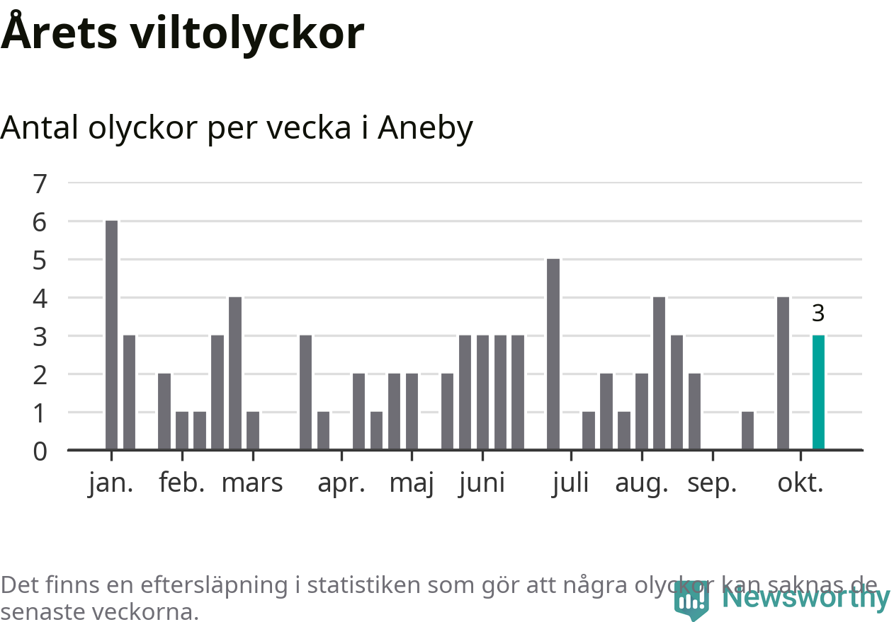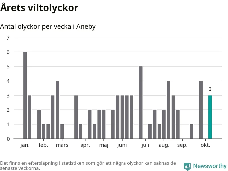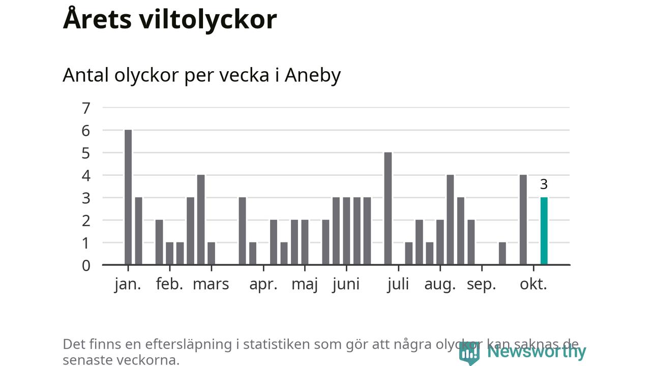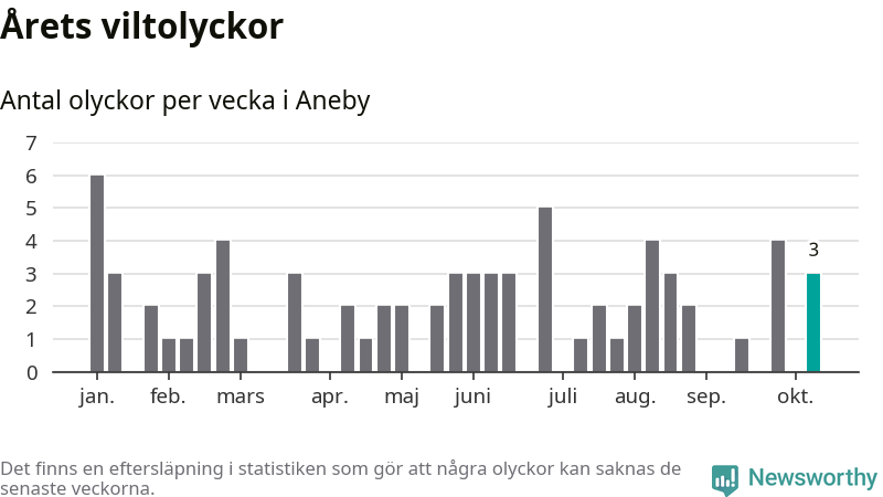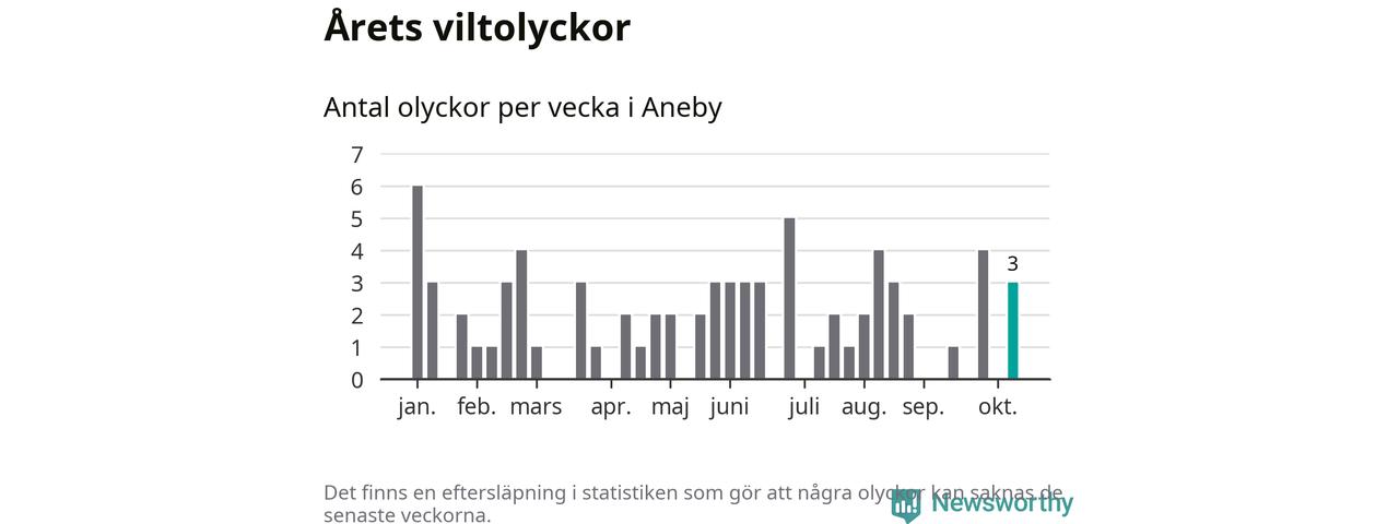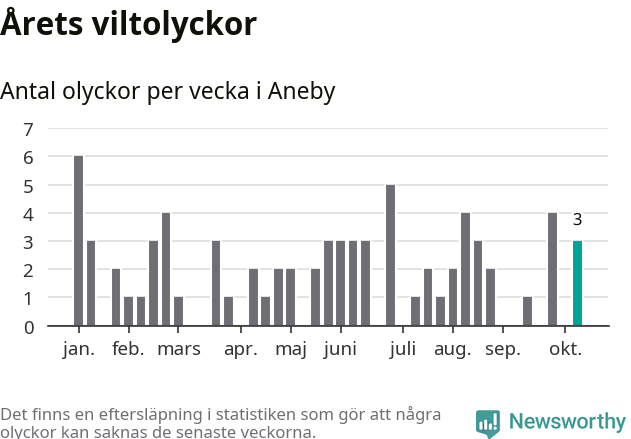 Hittills har tre viltolyckor rapporterats in i Aneby kommun från vecka 42. Se listan här.