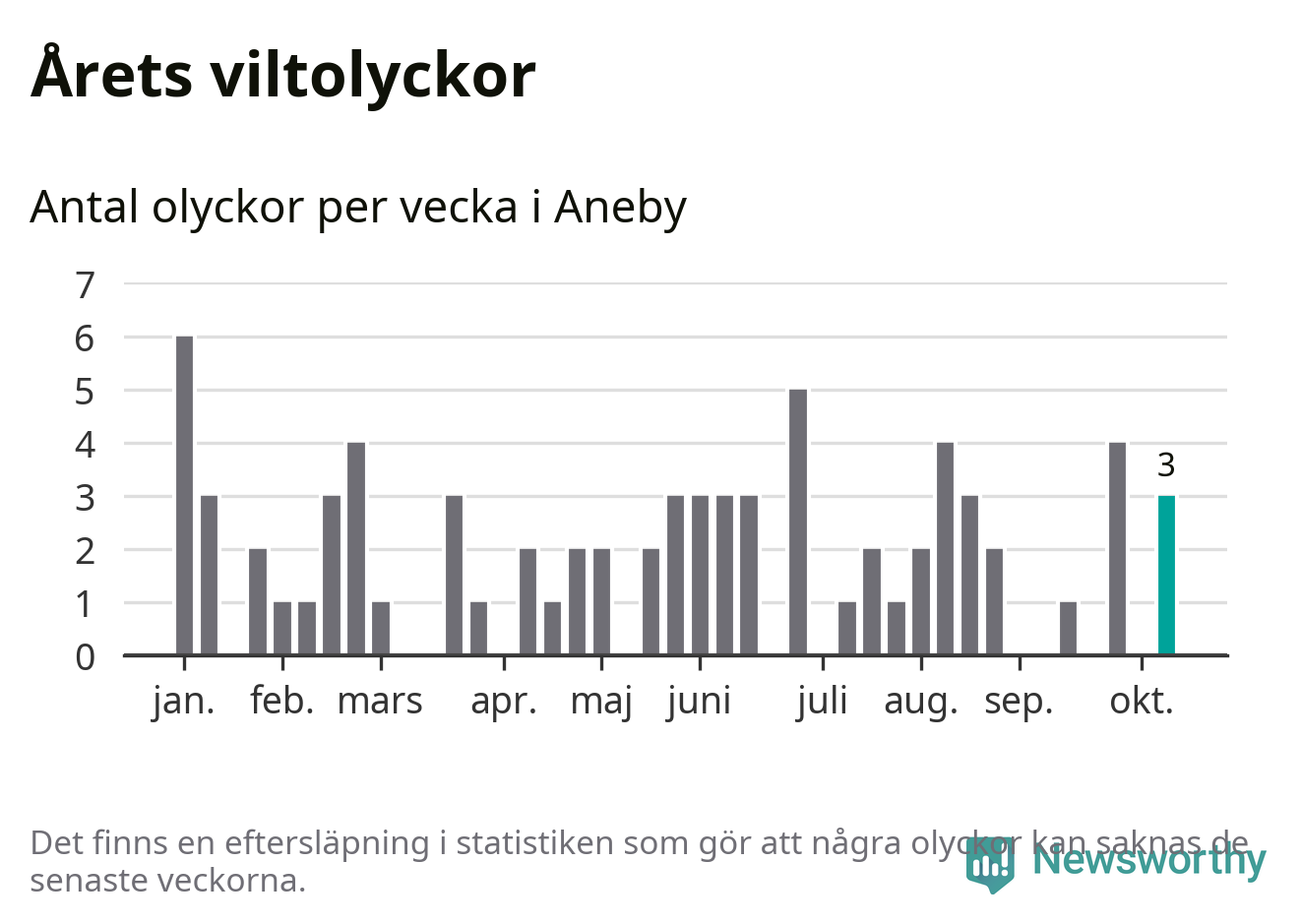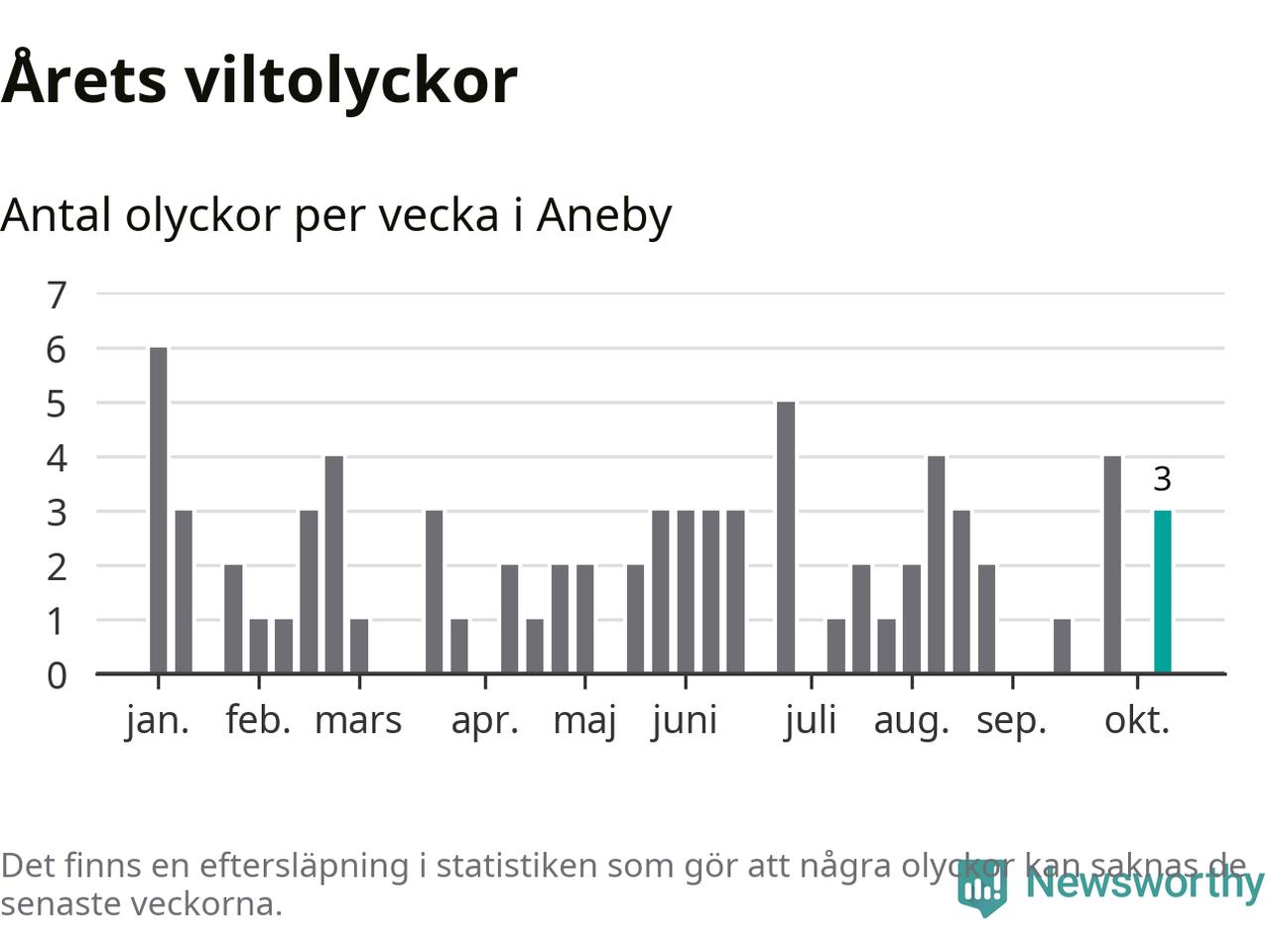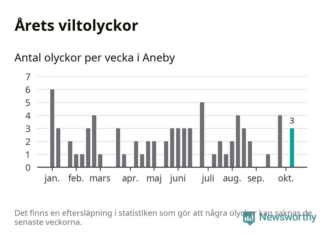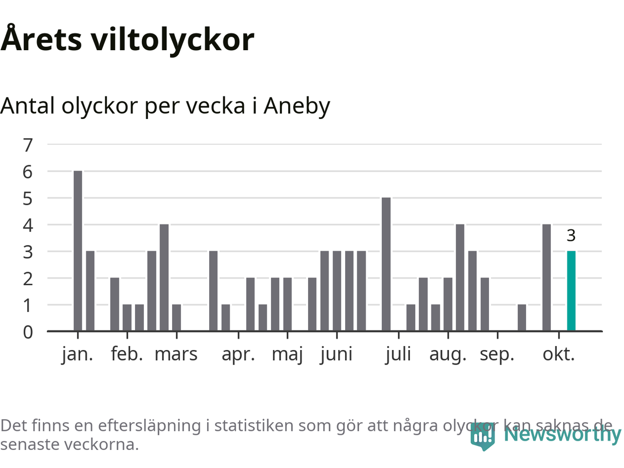 Hittills har tre viltolyckor rapporterats in i Aneby kommun från vecka 42. Se listan här.