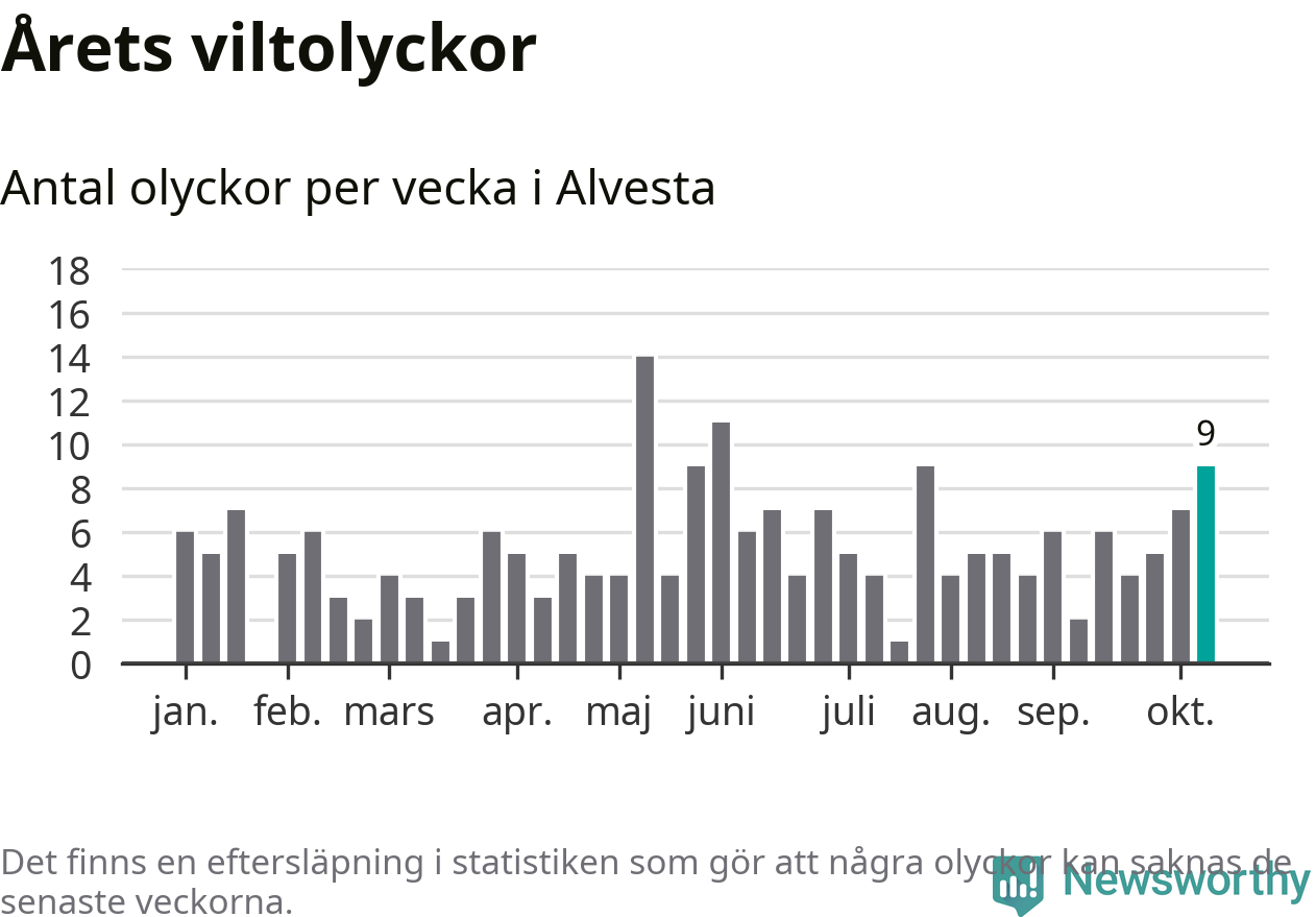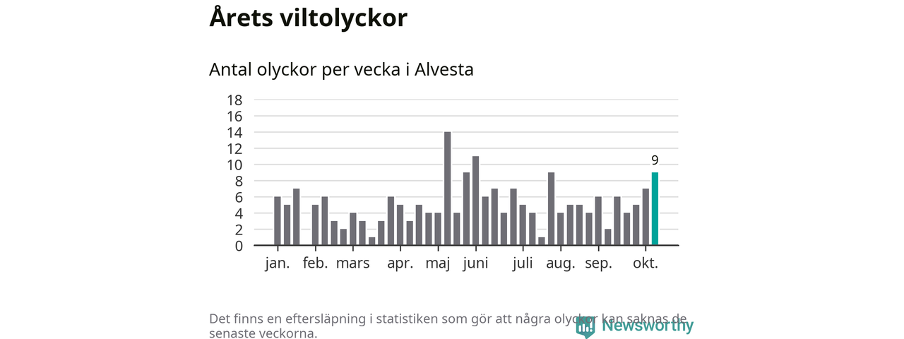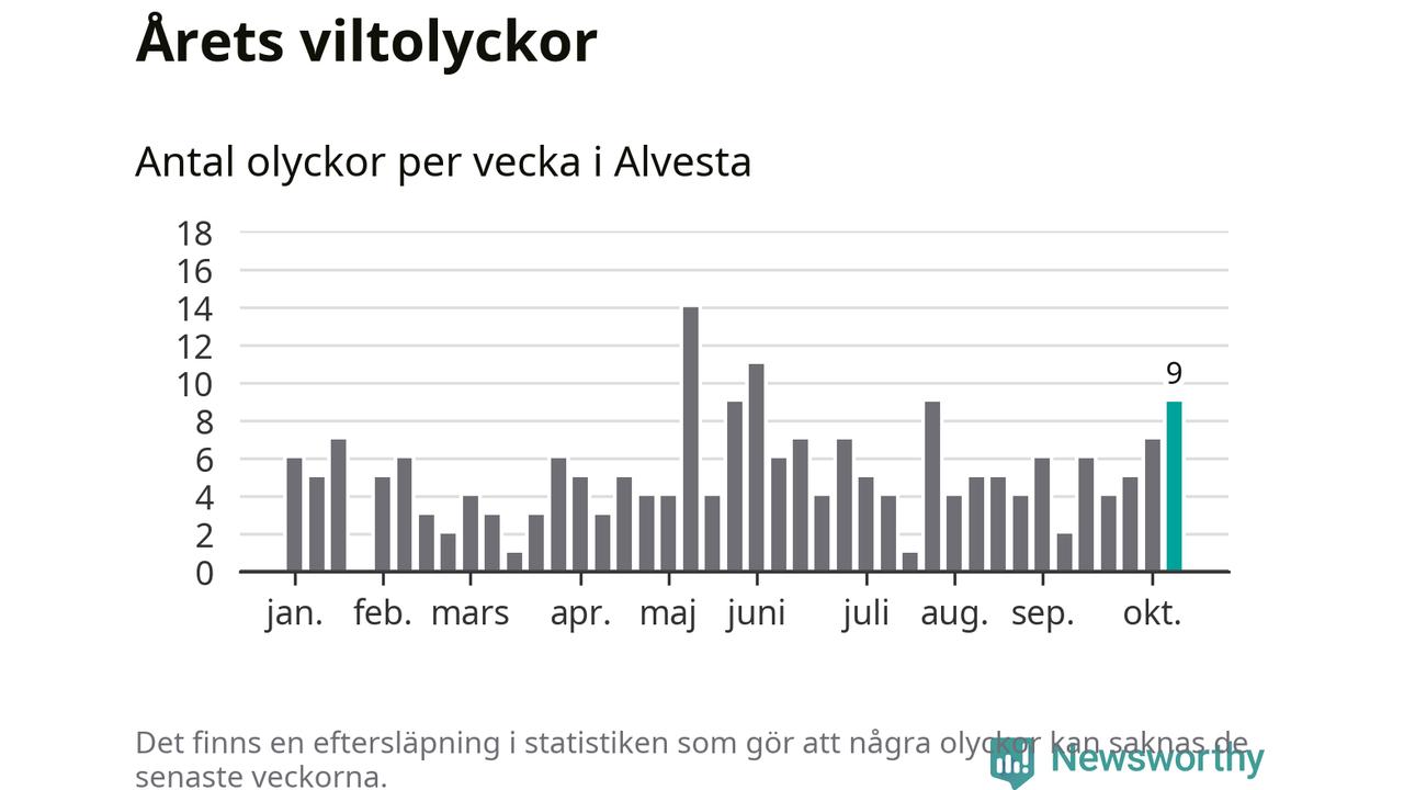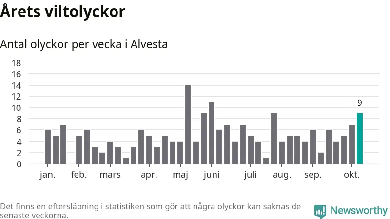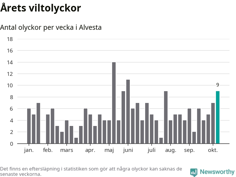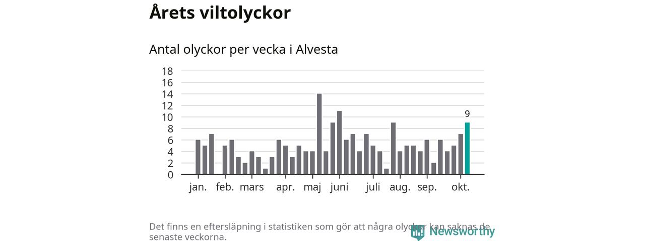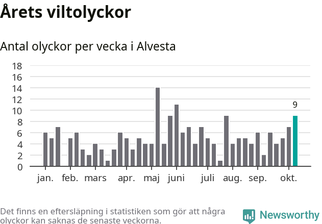 Hittills har nio viltolyckor rapporterats in i Alvesta kommun från vecka 42. Se listan här.