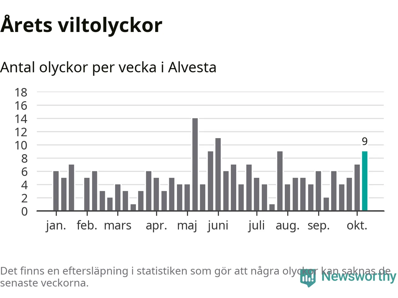 Totalt det här året har det inträffat 217 viltolyckor i kommunen. Det är en normal nivå i förhållande till hur det har sett ut under de senaste tio åren – genomsnittet för motsvarande period är 226.