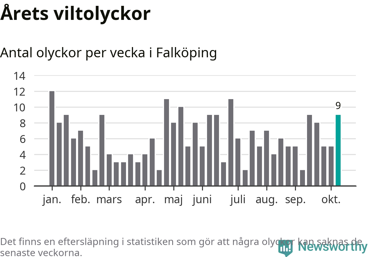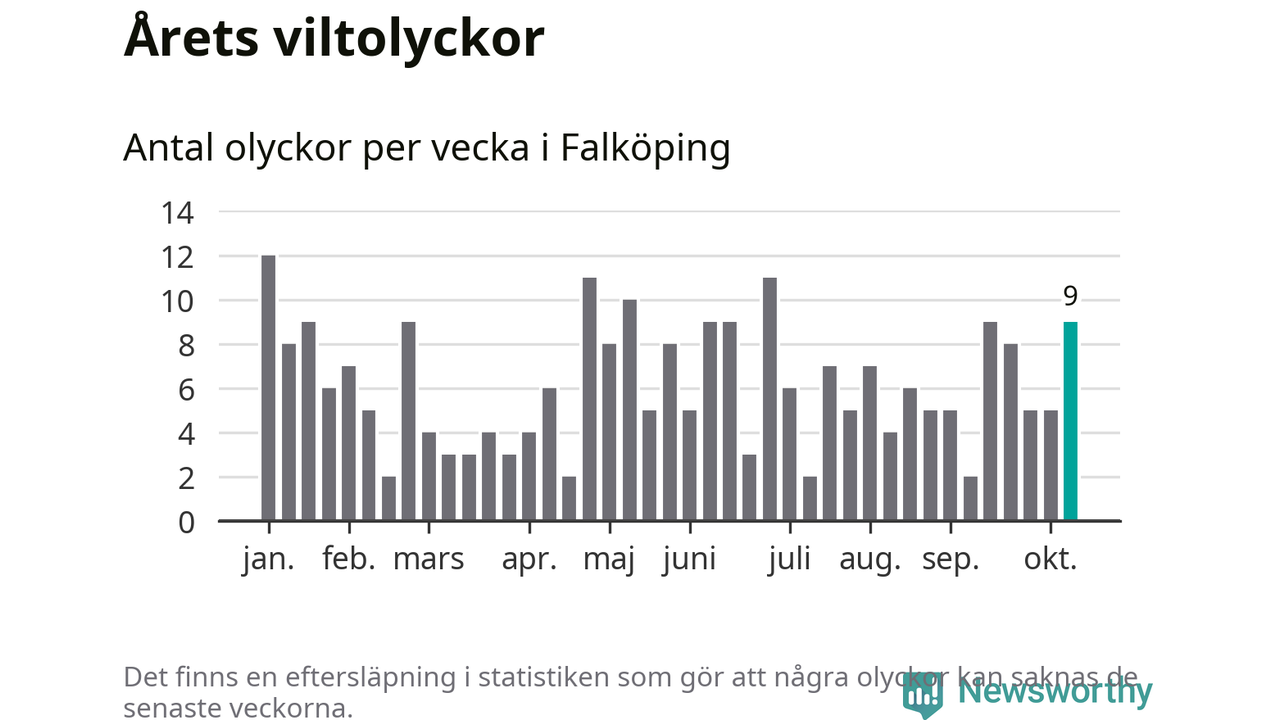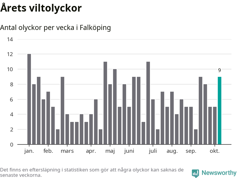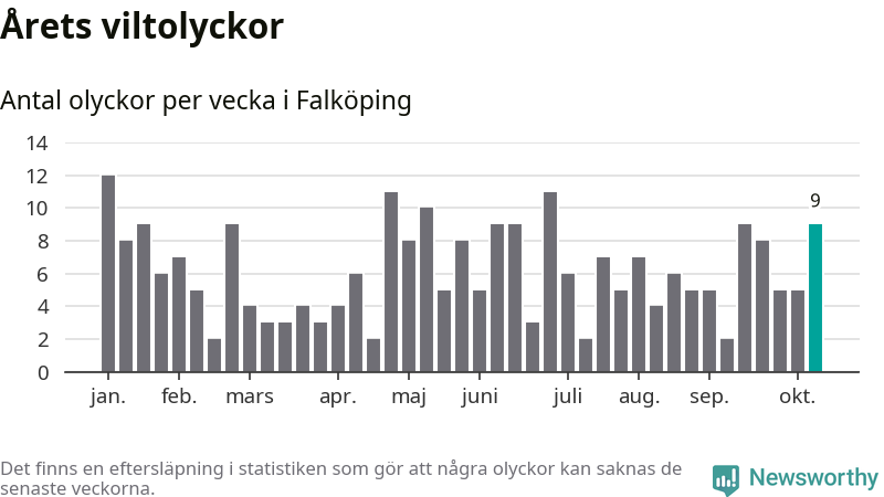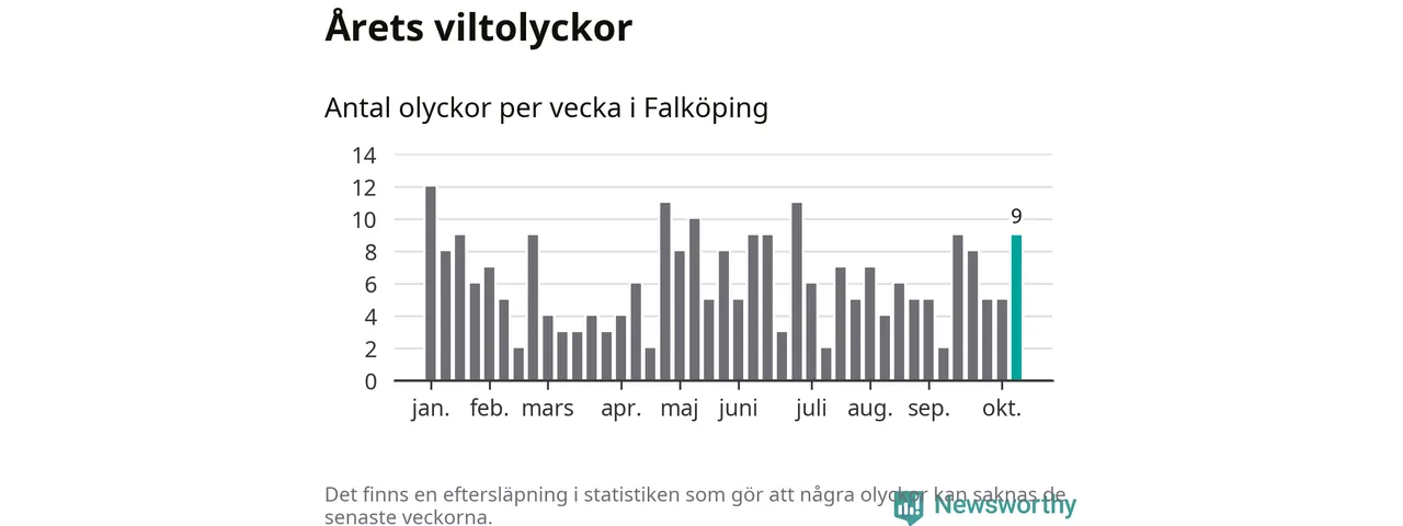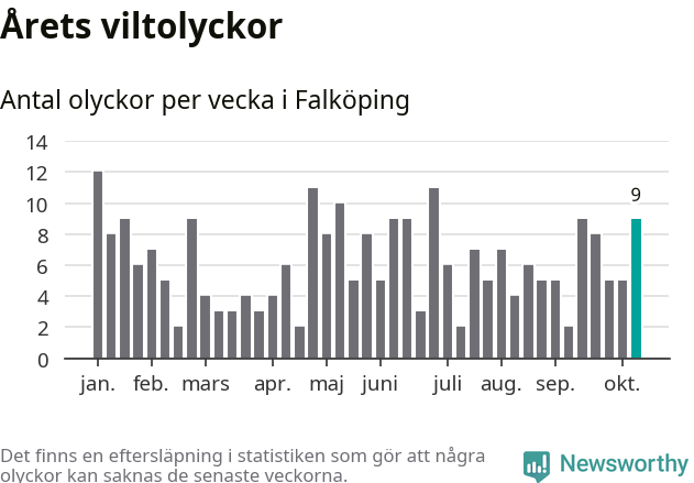 Hittills har nio viltolyckor rapporterats in i Falköpings kommun från vecka 42. Se listan här.