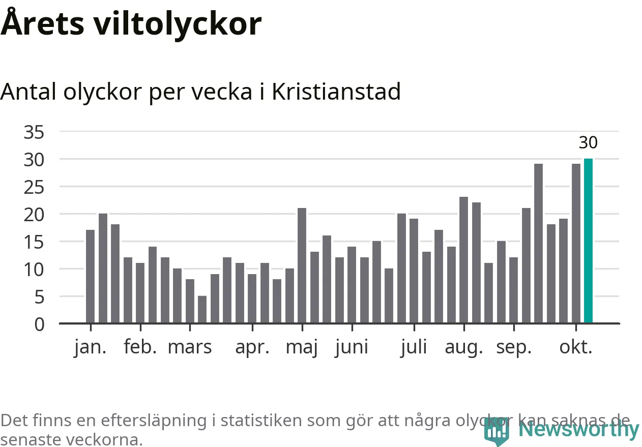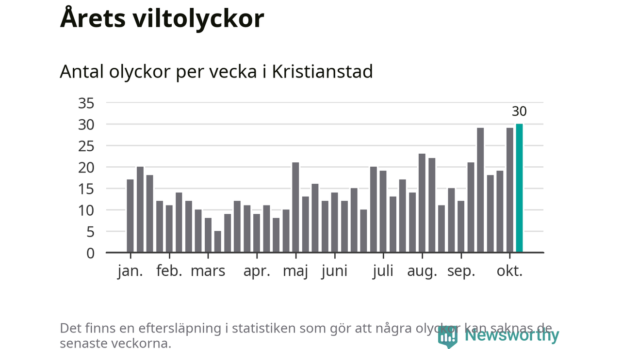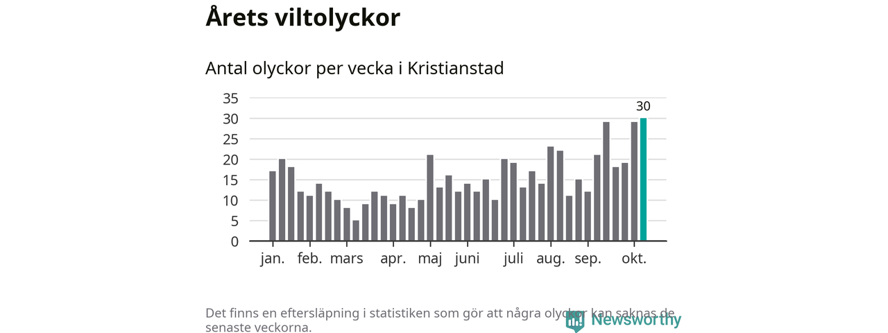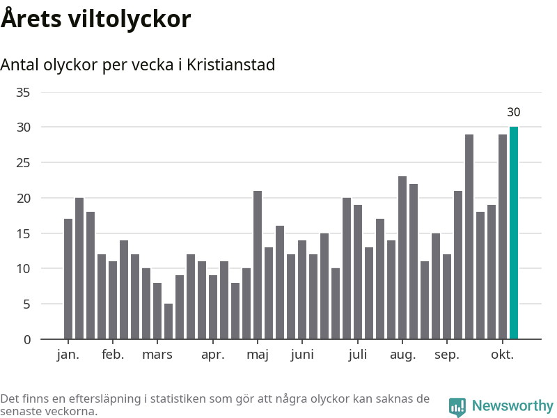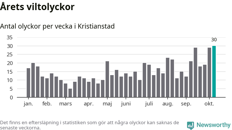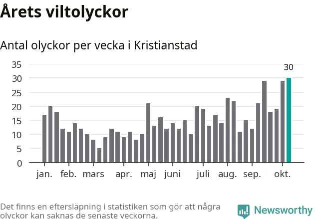 Under vecka 42 rapporterades 30 viltolyckor in i Kristianstads kommun. Det är det största antalet på en enskild vecka hittills i år.