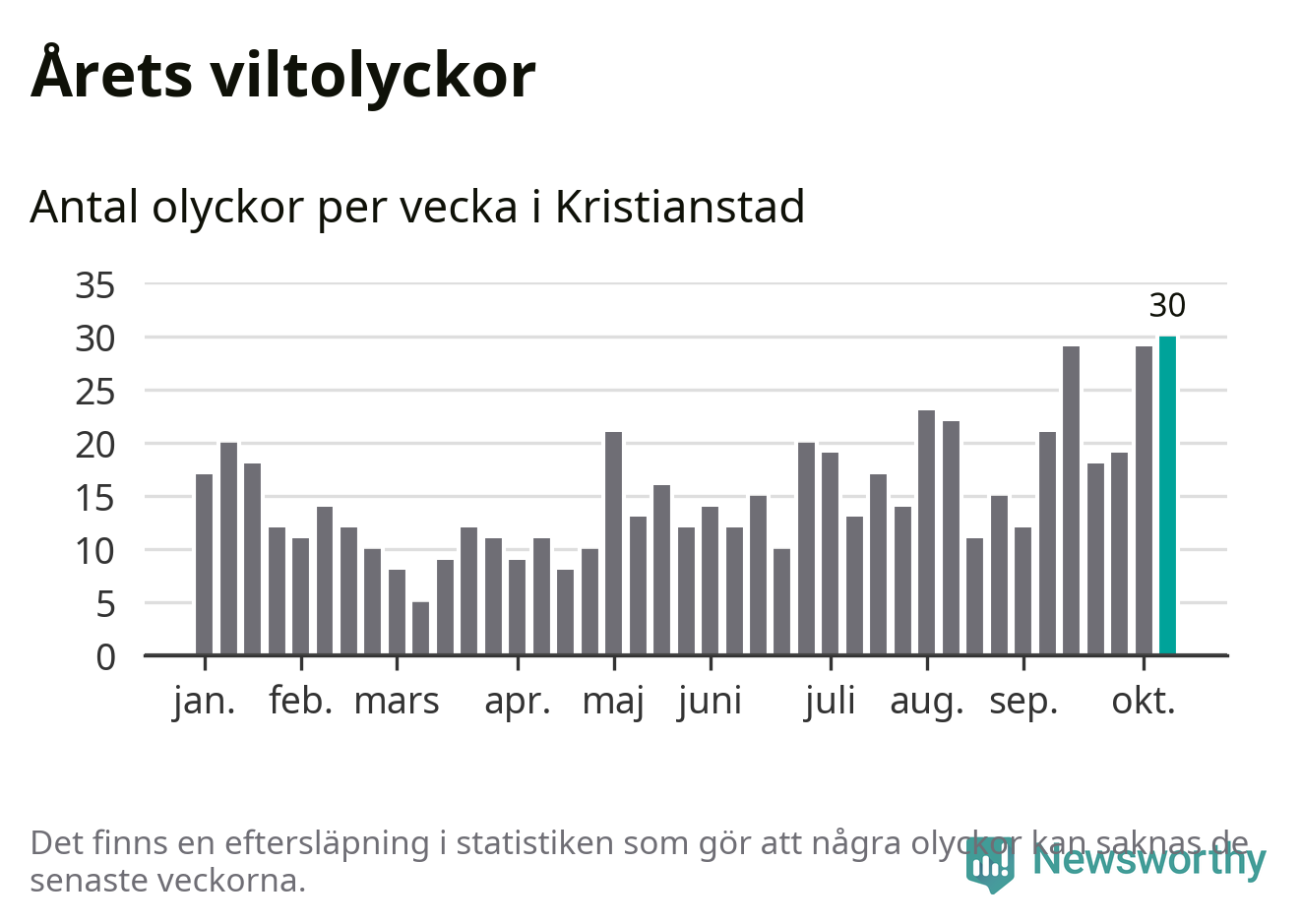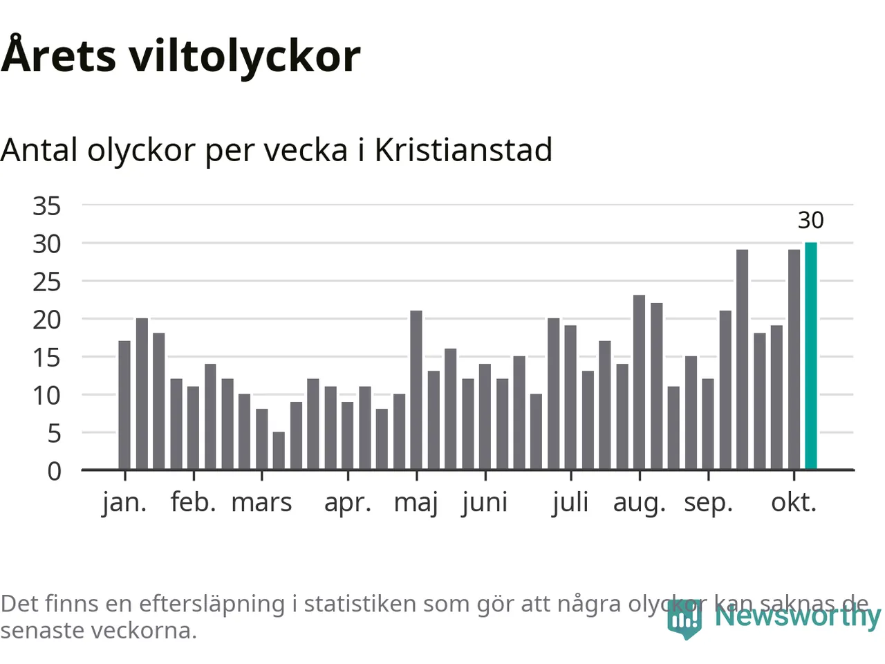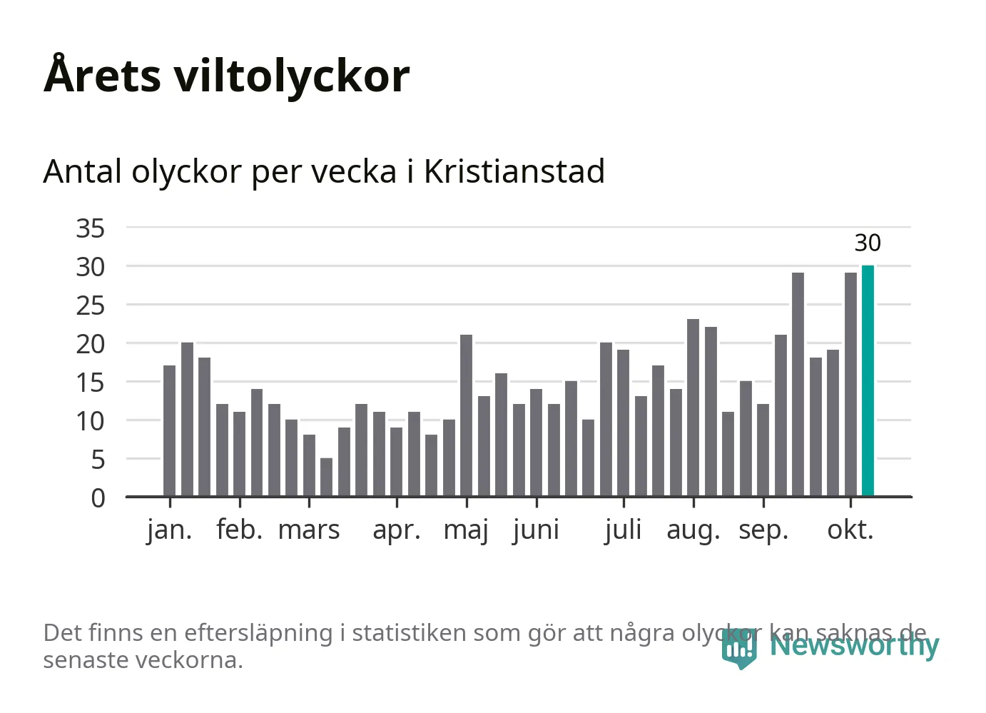 Under vecka 42 rapporterades 30 viltolyckor in i Kristianstads kommun. Det är det största antalet på en enskild vecka hittills i år.