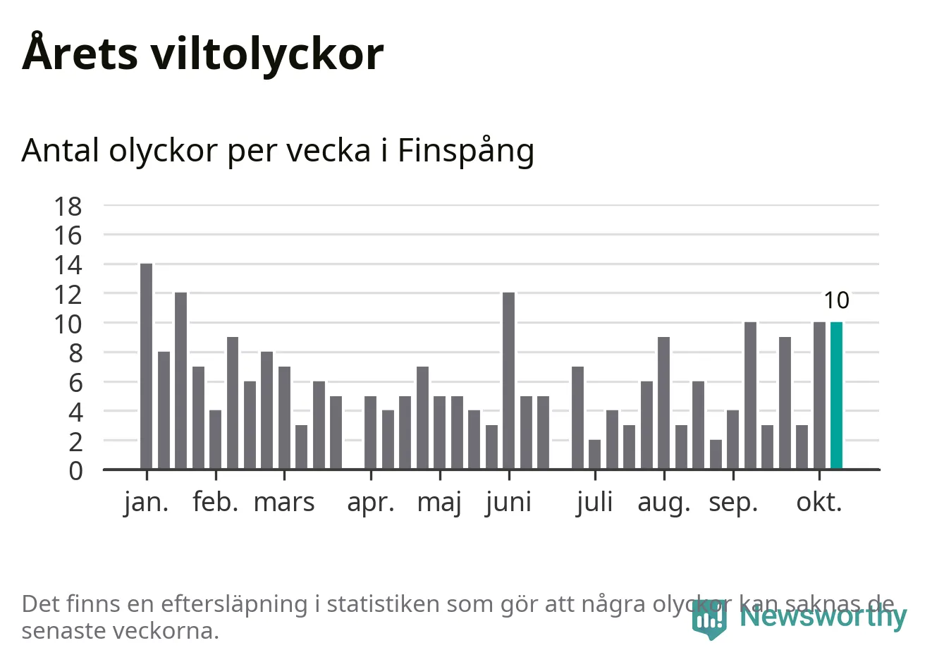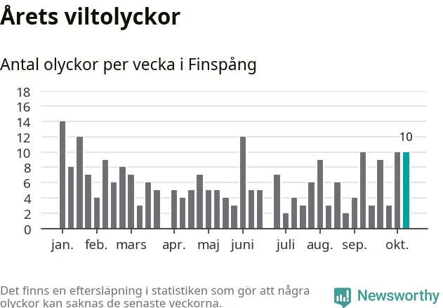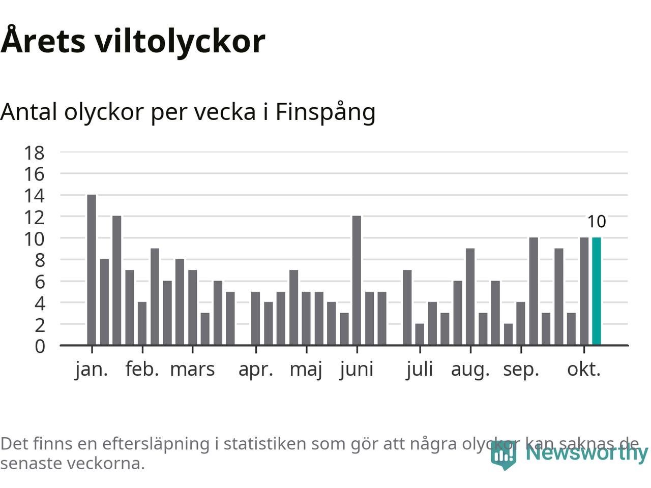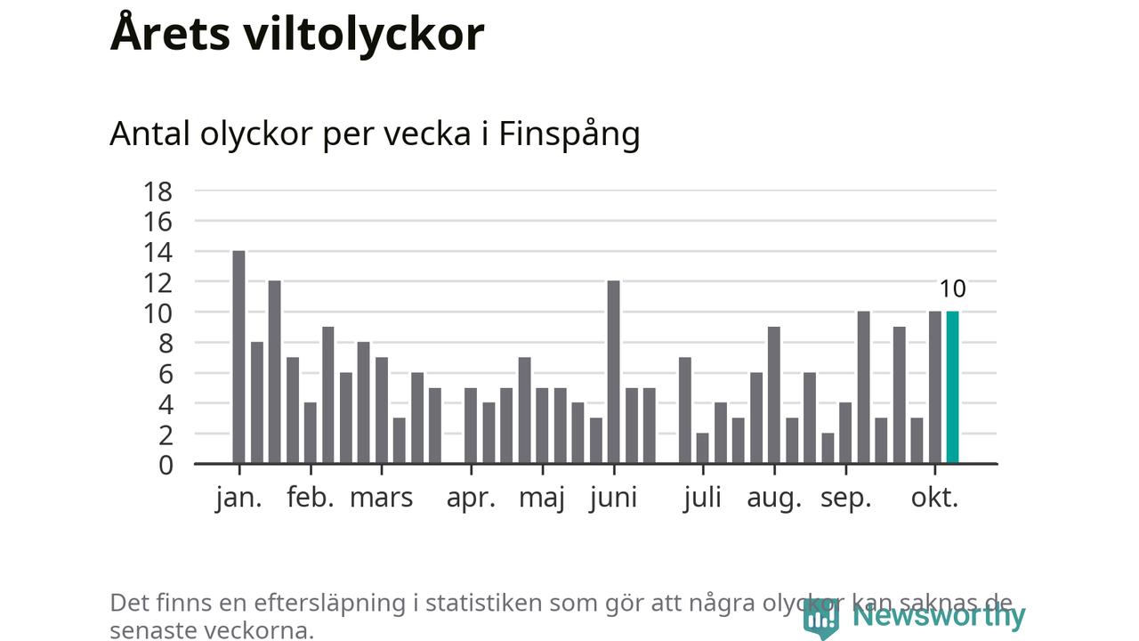 Hittills har tio viltolyckor rapporterats in i Finspångs kommun från vecka 42. Se listan här.
