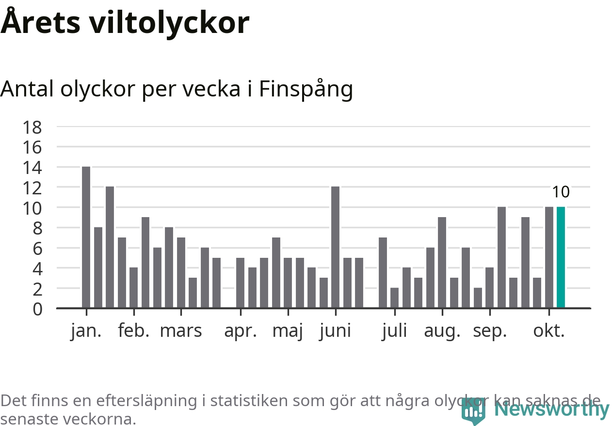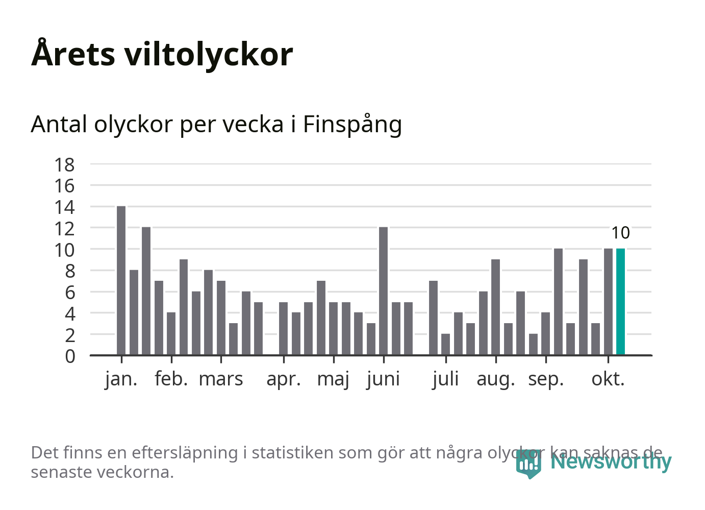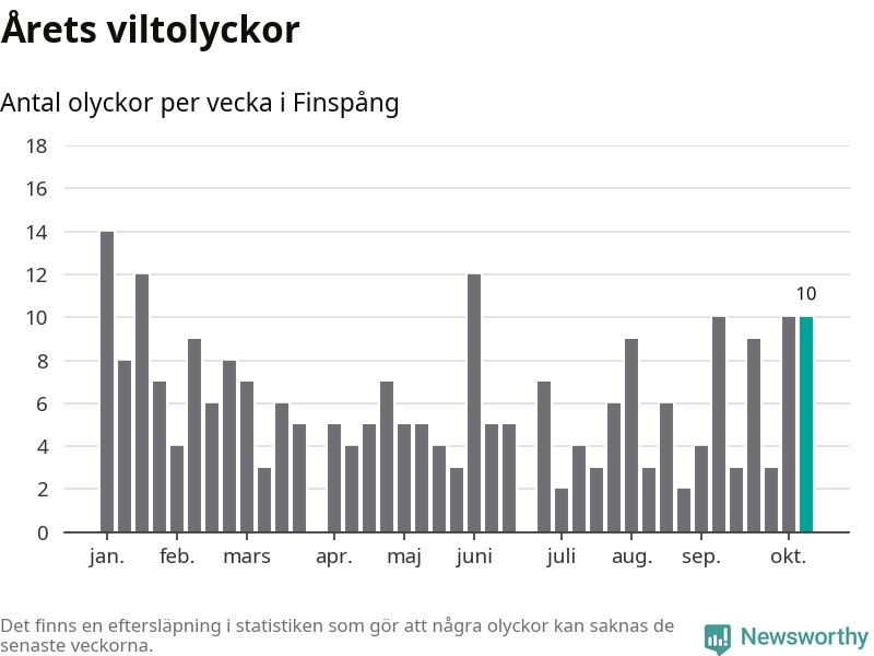 Hittills har tio viltolyckor rapporterats in i Finspångs kommun från vecka 42. Se listan här.