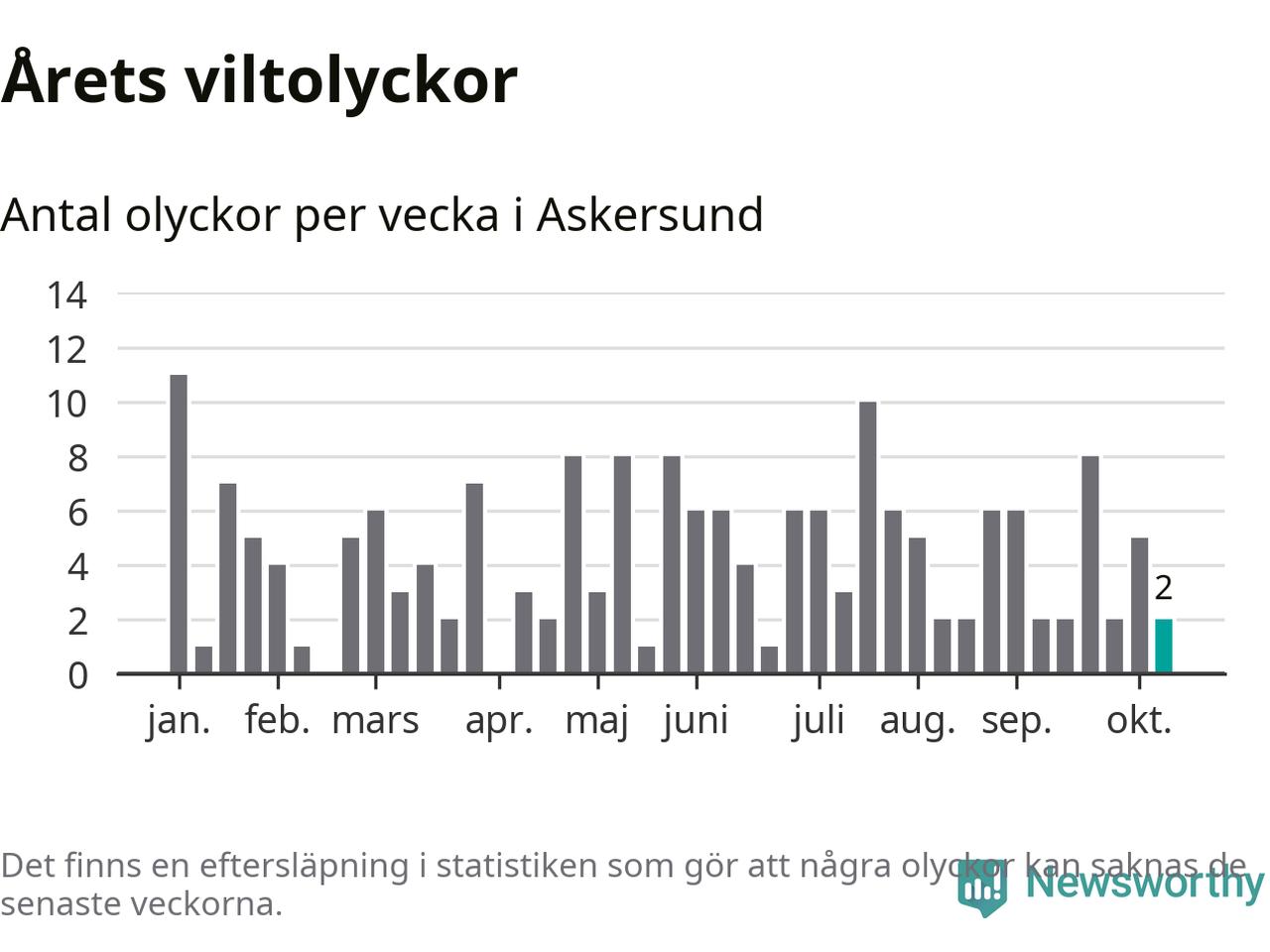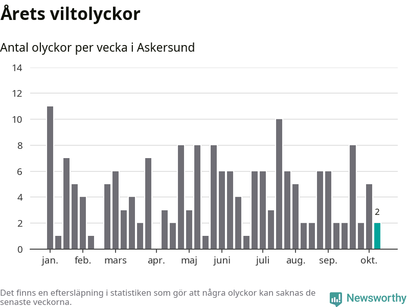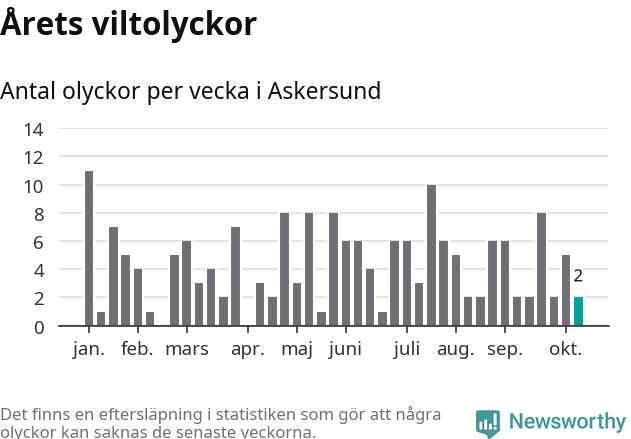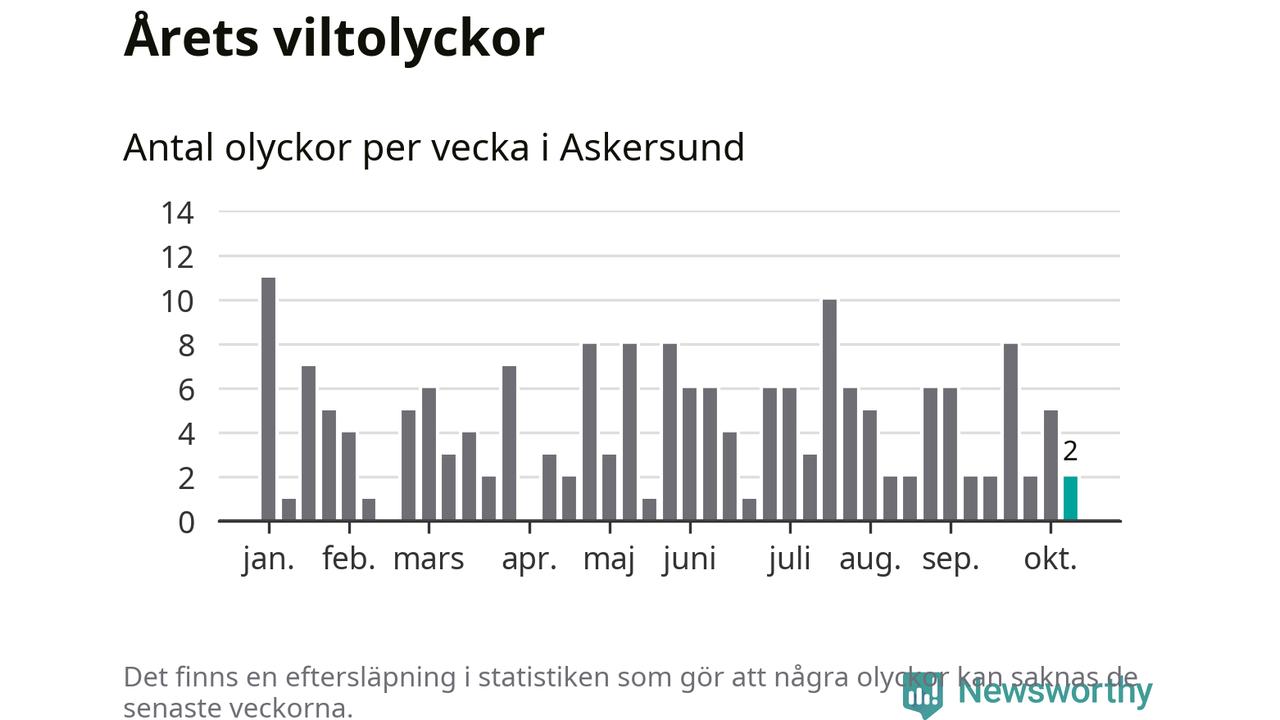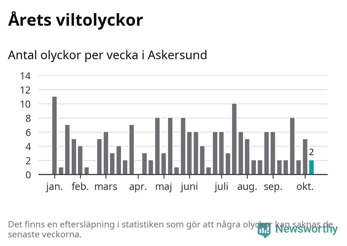 Hittills har två viltolyckor rapporterats in i Askersunds kommun från vecka 42. Se listan här.