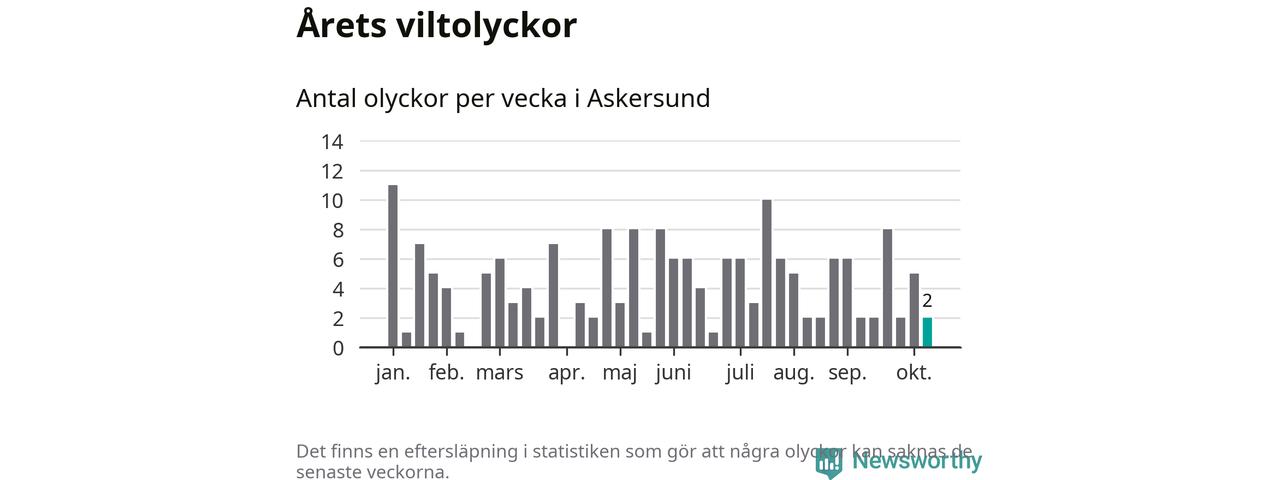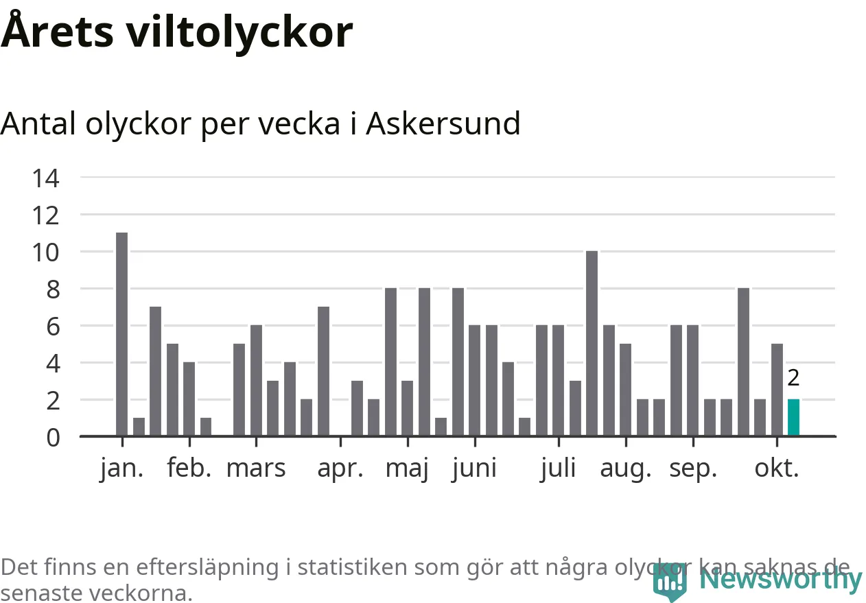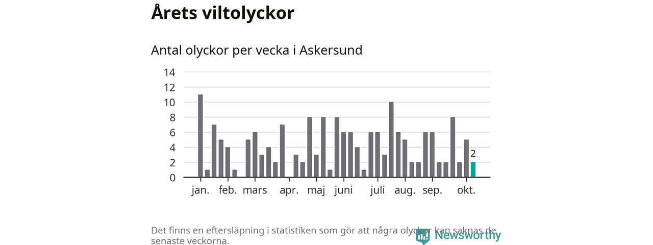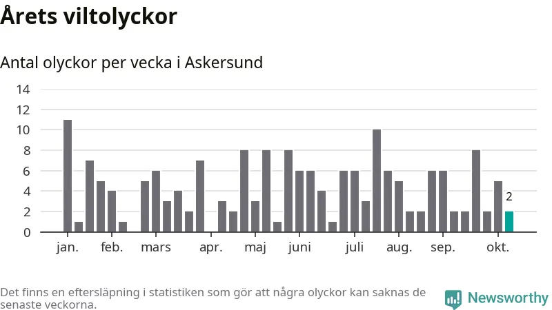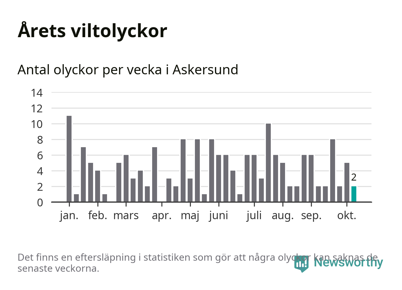Hittills har två viltolyckor rapporterats in i Askersunds kommun från vecka 42. Se listan här.