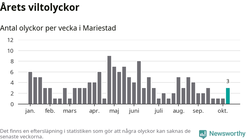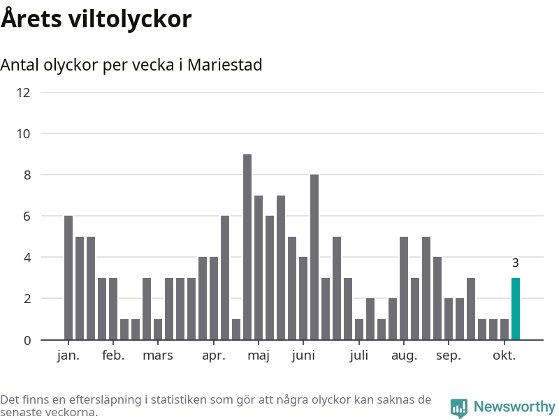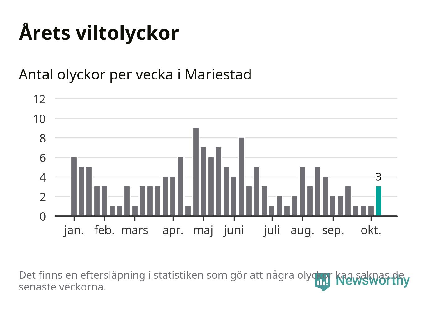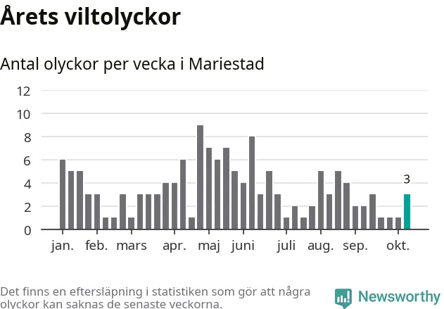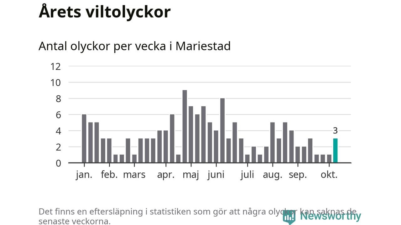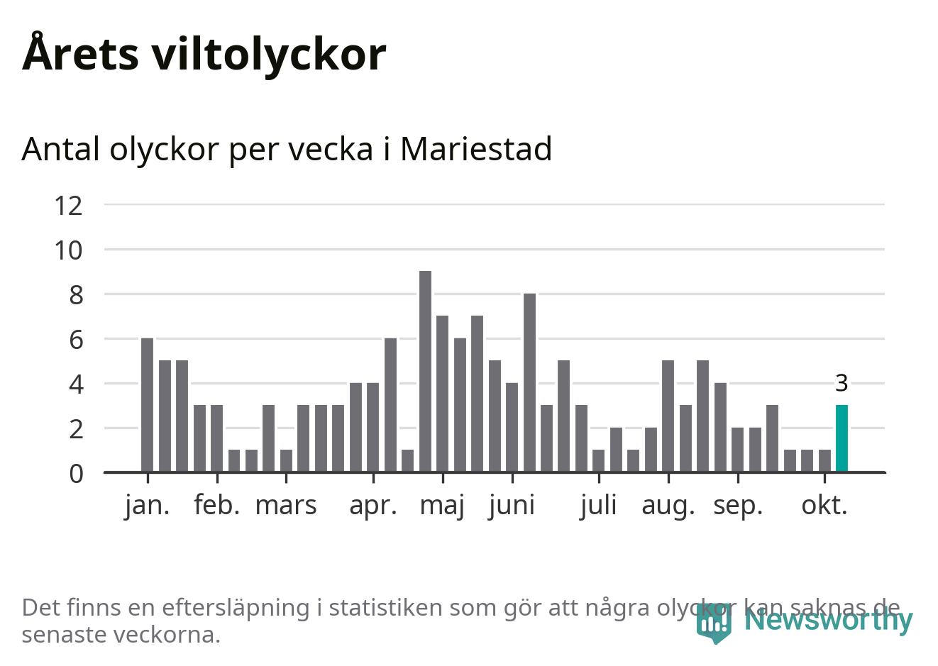 Hittills har tre viltolyckor rapporterats in i Mariestads kommun från vecka 42. Se listan här.
