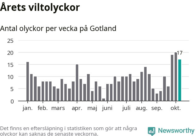Hittills har 17 viltolyckor rapporterats in i Gotlands kommun från vecka 42. Se listan här.