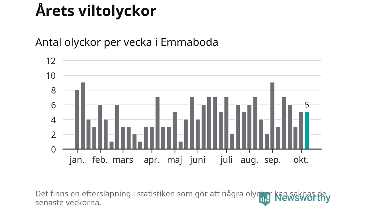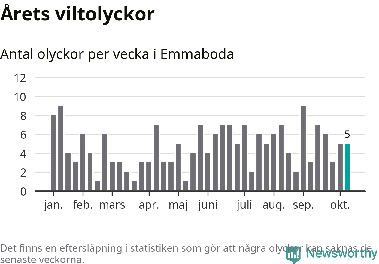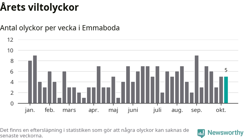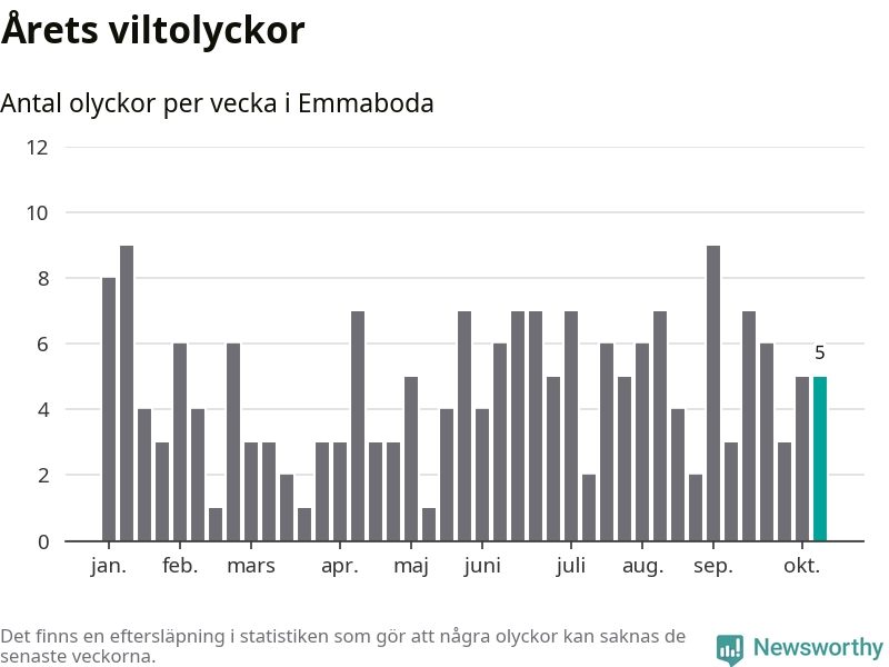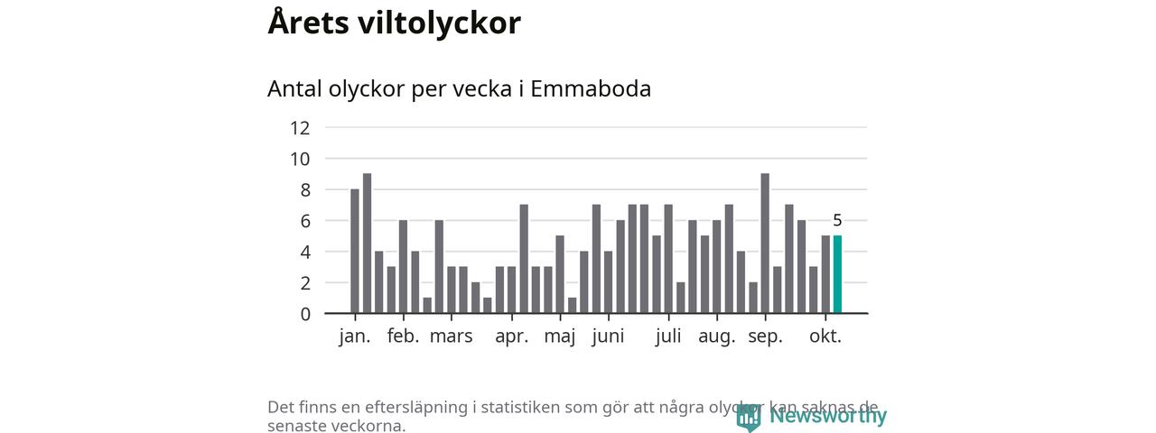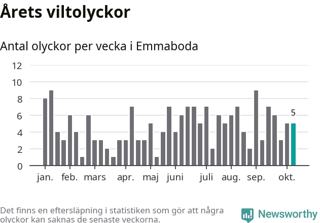 Hittills har fem viltolyckor rapporterats in i Emmaboda kommun från vecka 42. Se listan här.