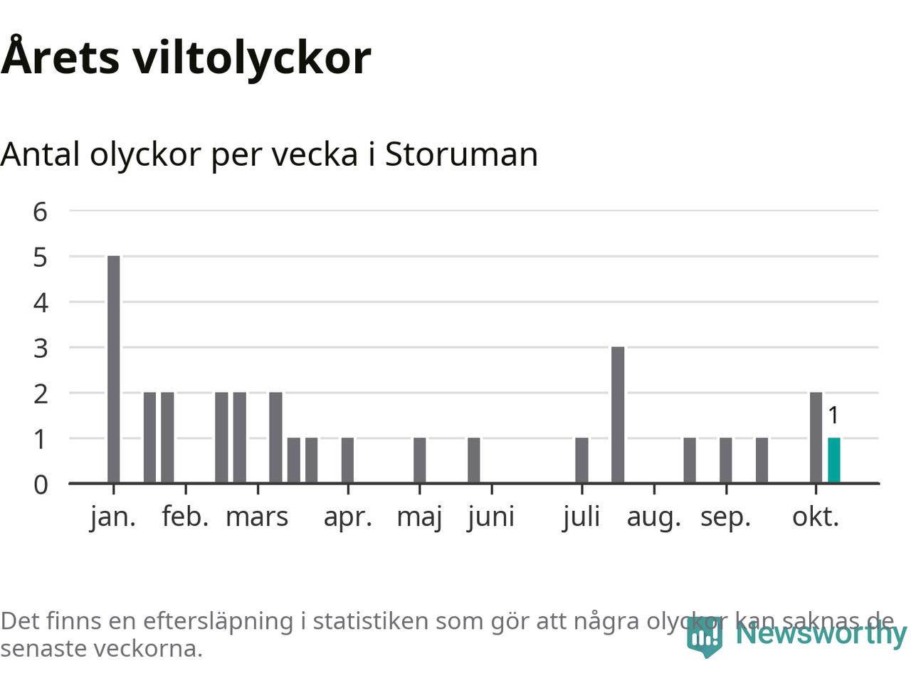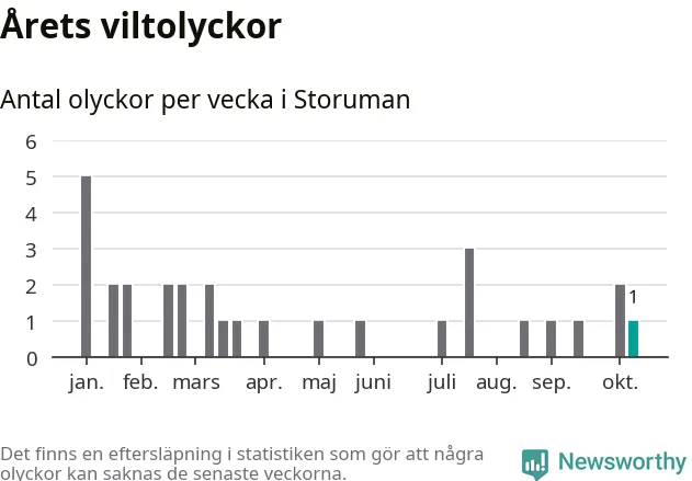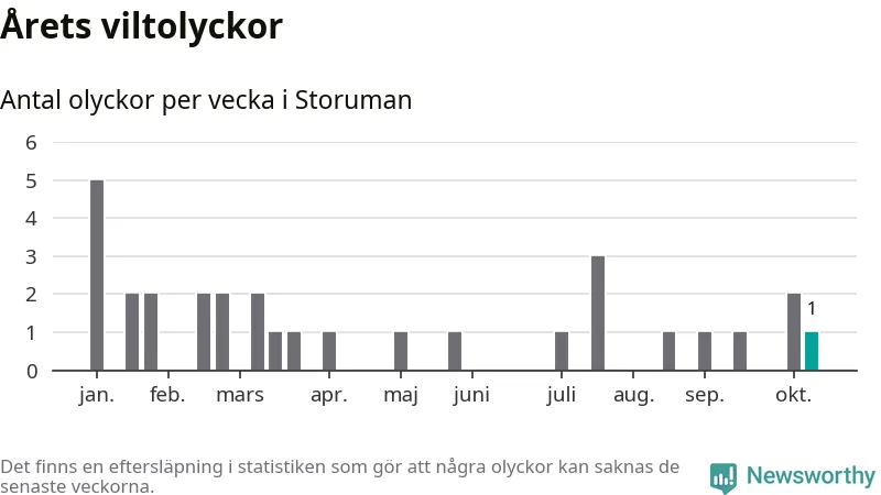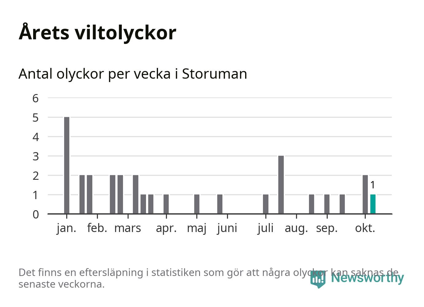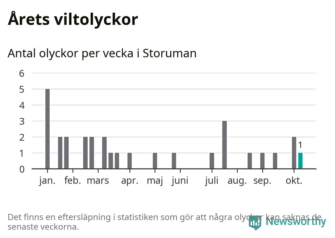 Från förra veckan (vecka 42) har hittills en viltolycka rapporterats in i Storumans kommun.