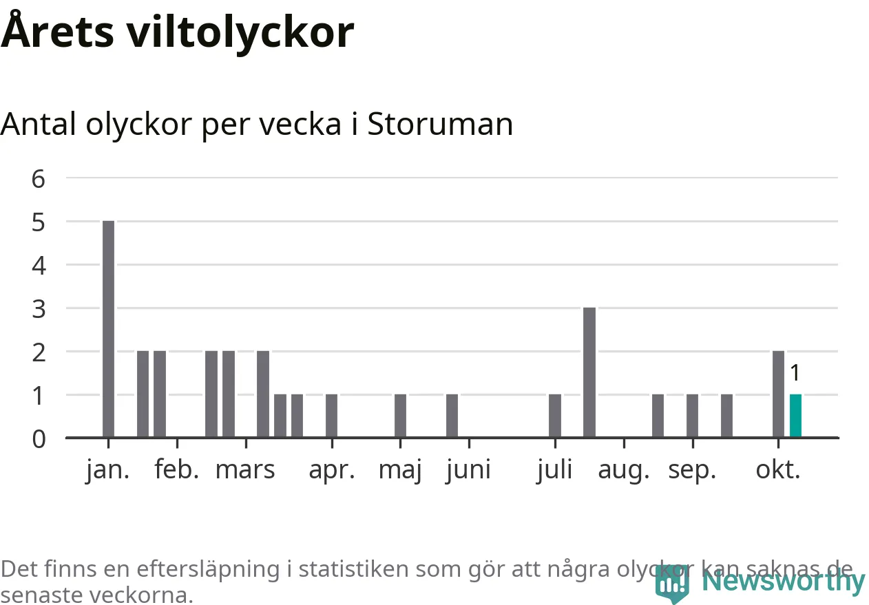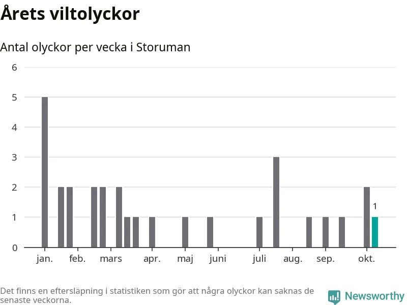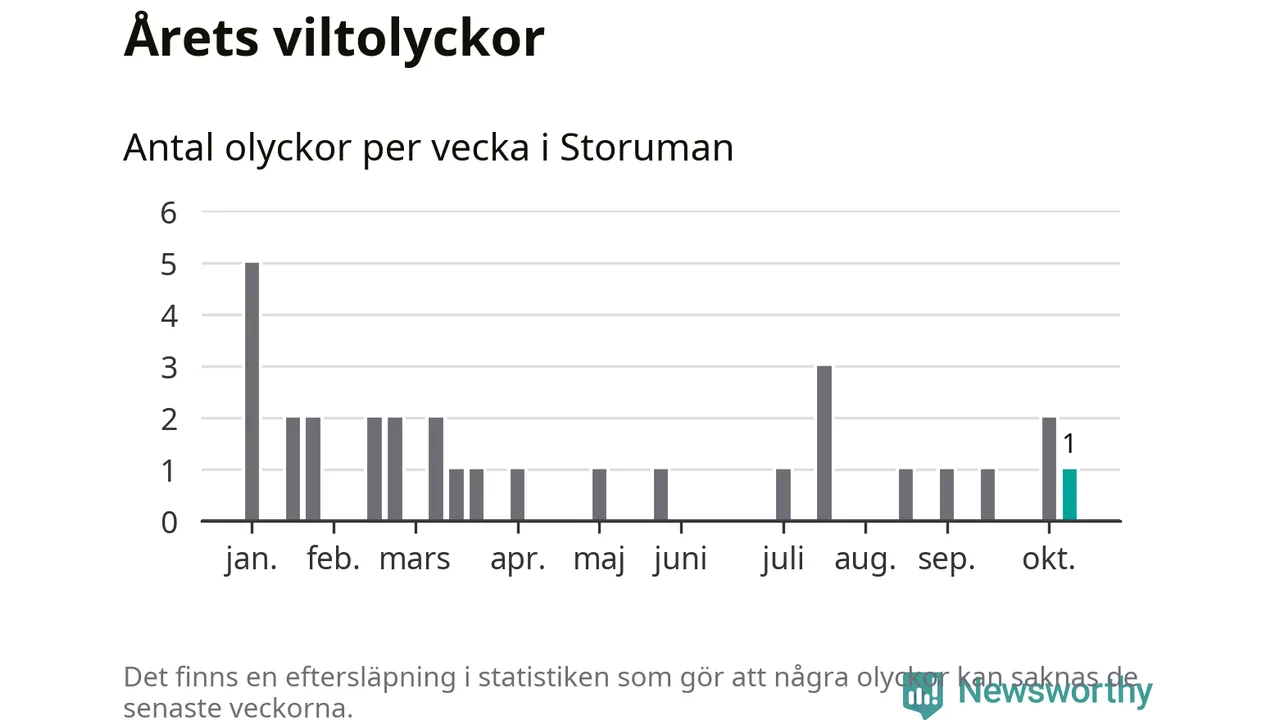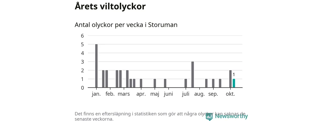 Från förra veckan (vecka 42) har hittills en viltolycka rapporterats in i Storumans kommun.