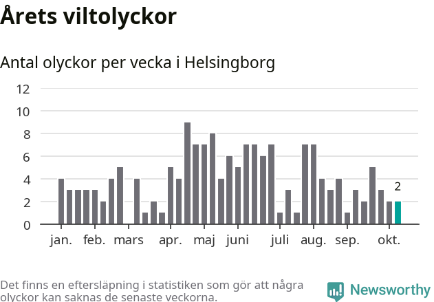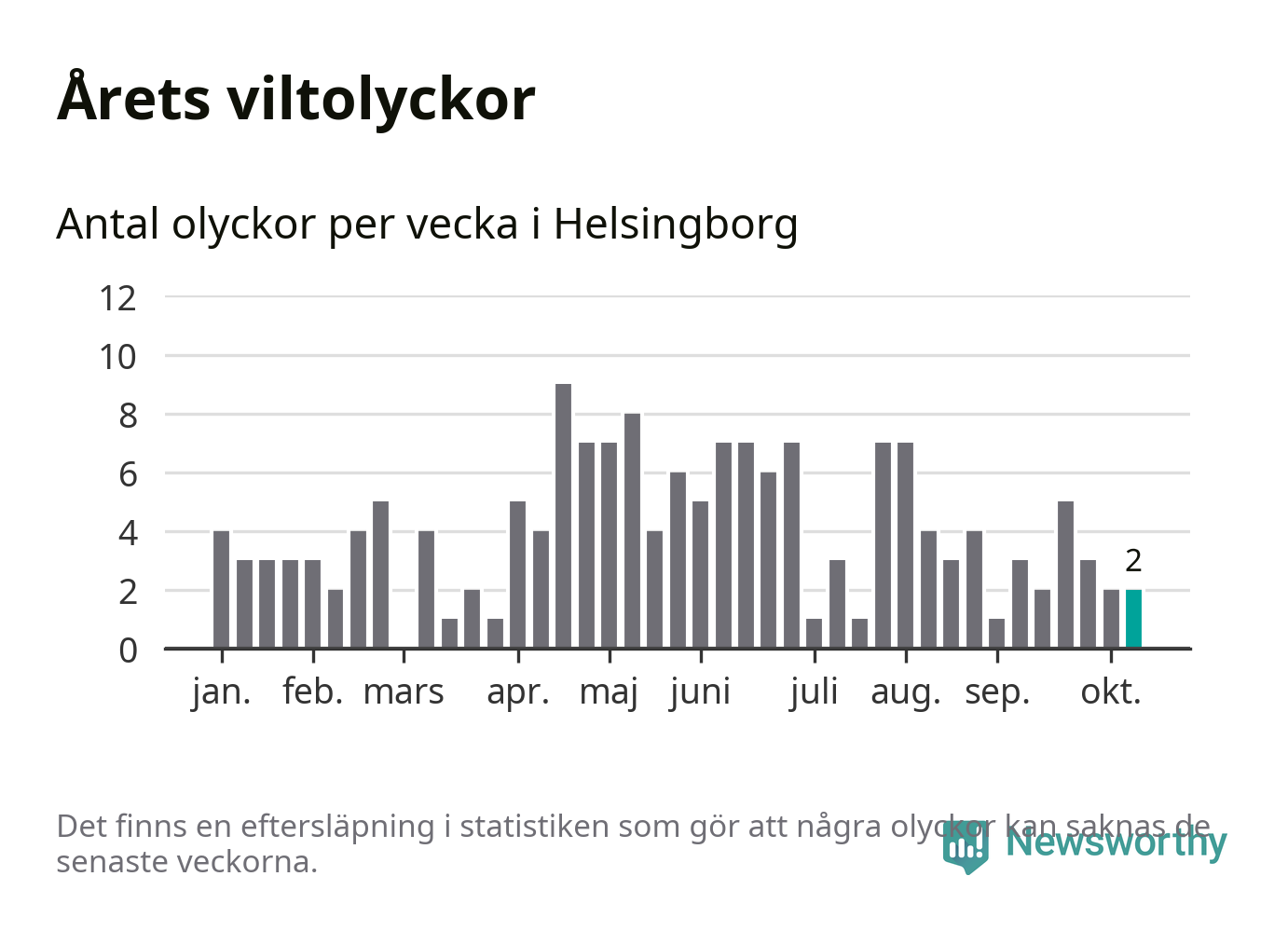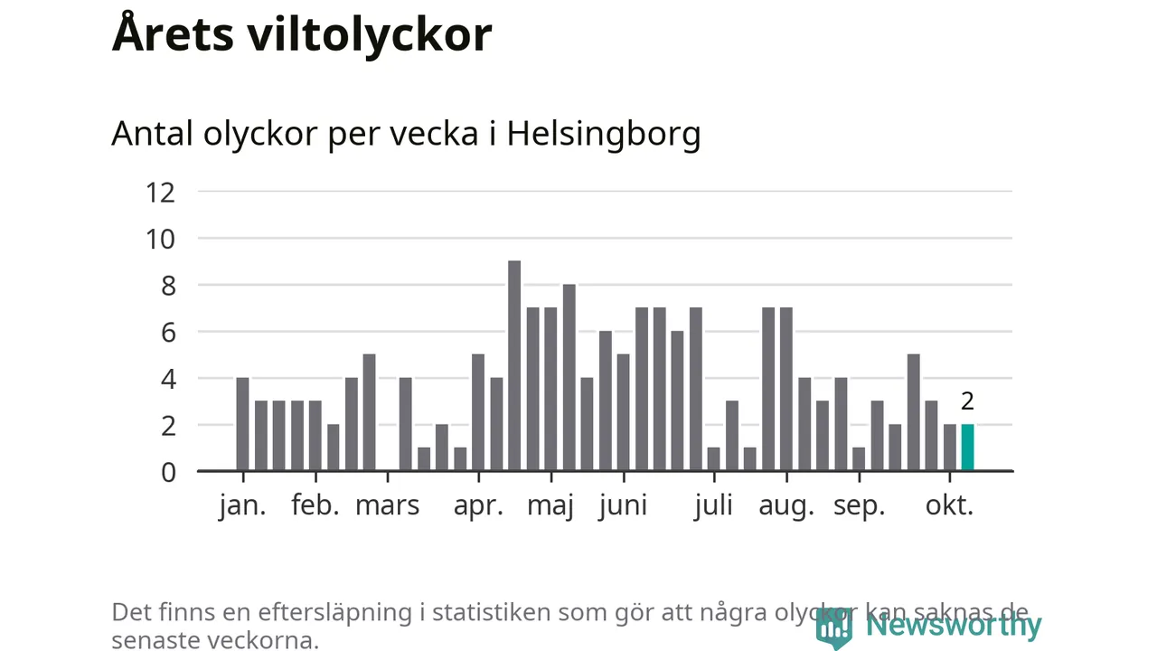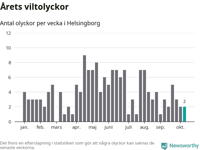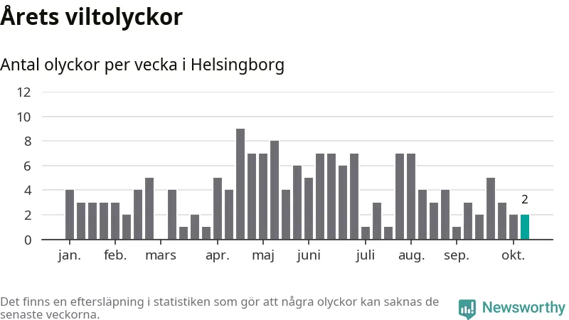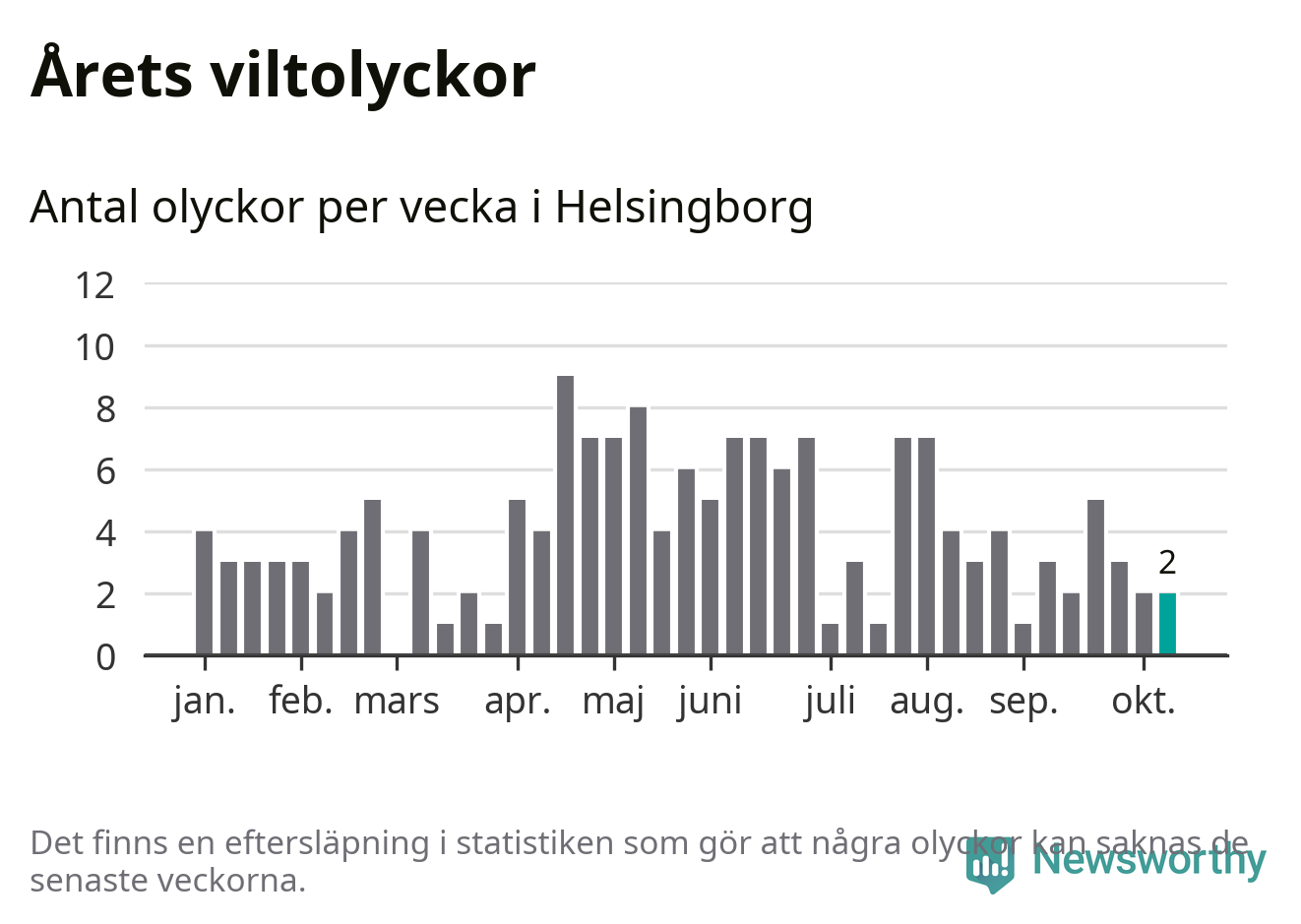 Hittills har två viltolyckor rapporterats in i Helsingborgs kommun från vecka 42. Se listan här.
