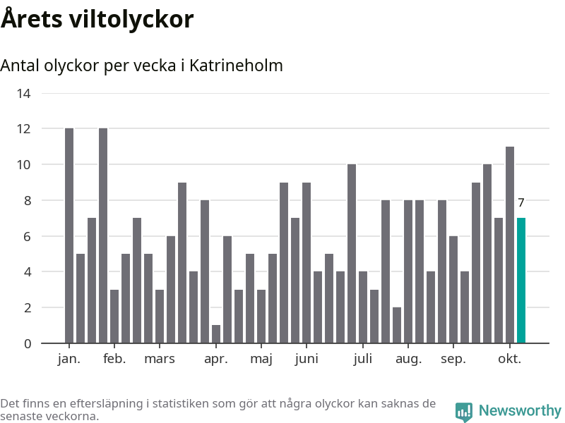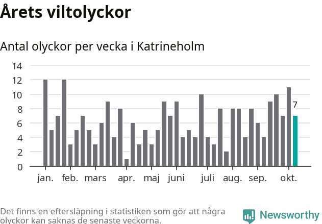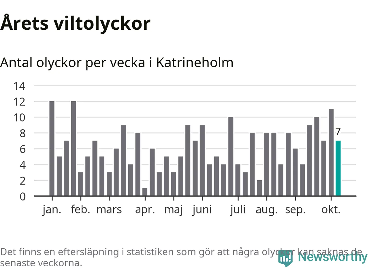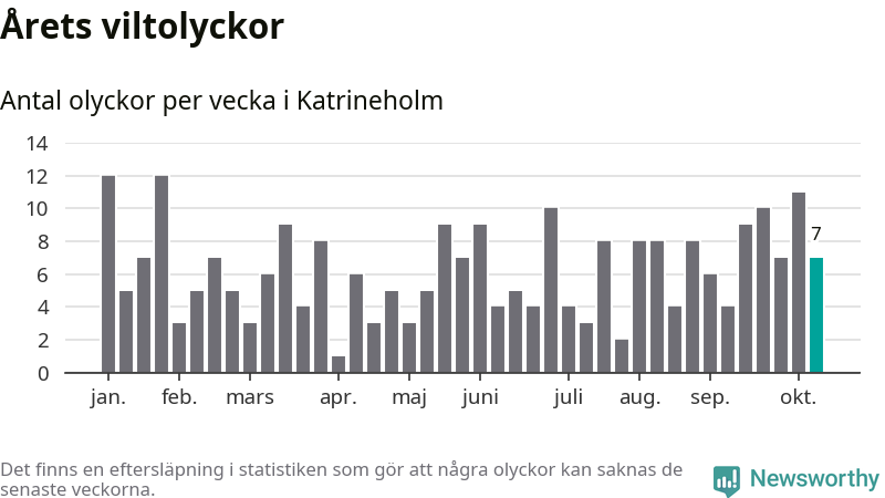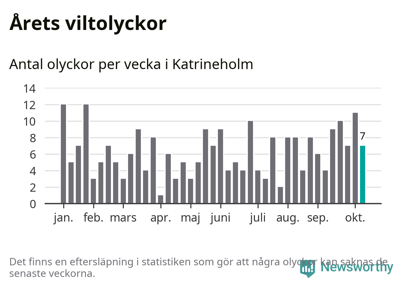 Hittills har sju viltolyckor rapporterats in i Katrineholms kommun från vecka 42. Se listan här.