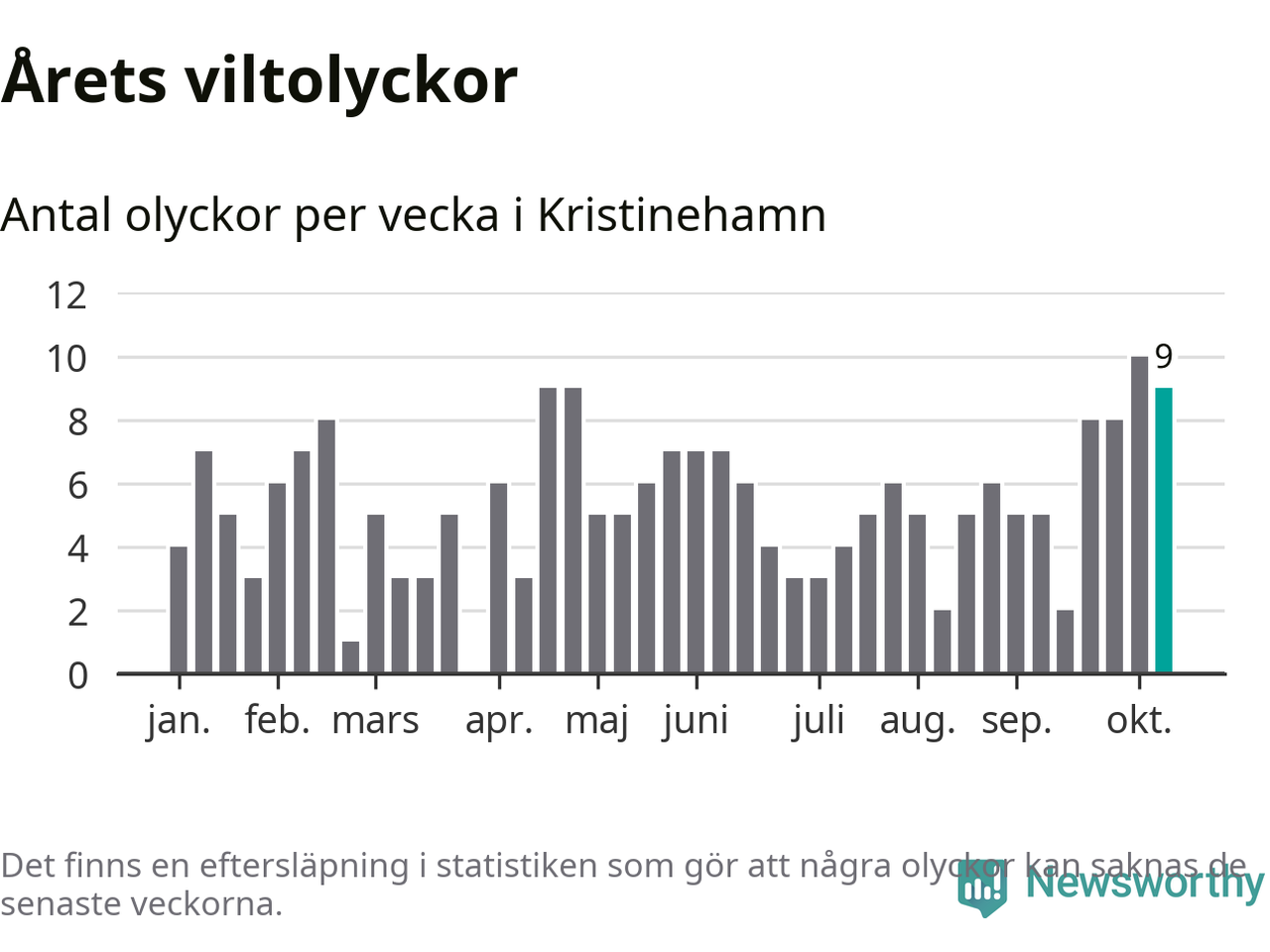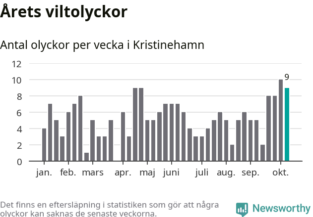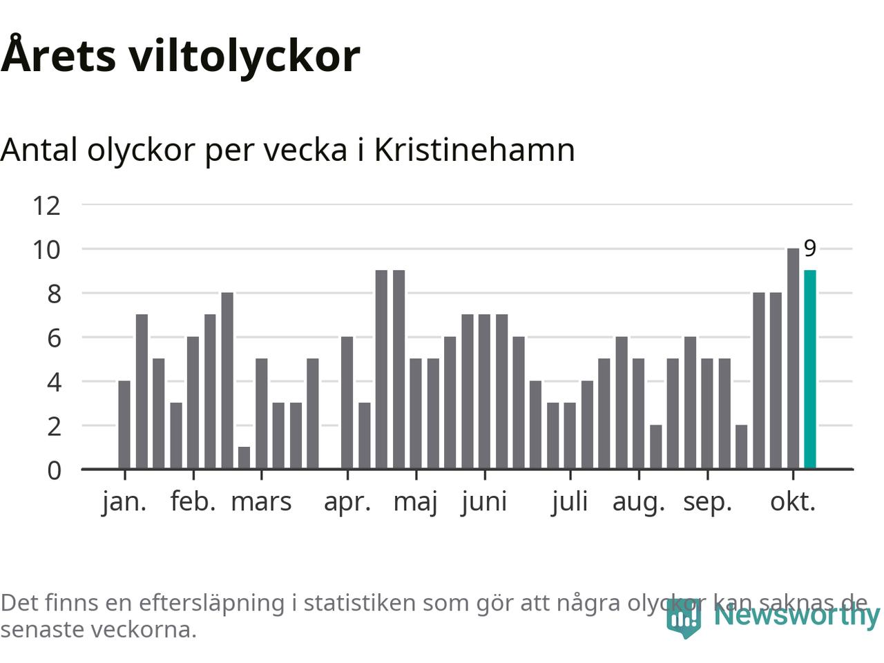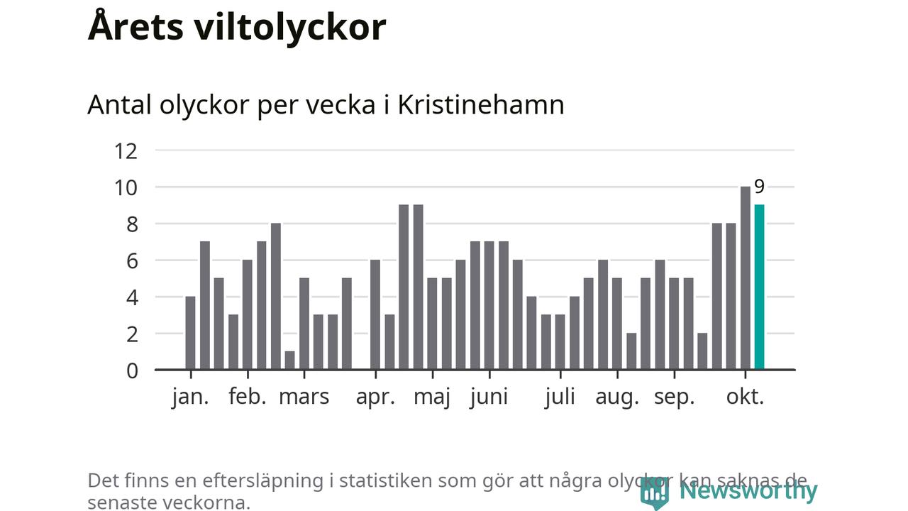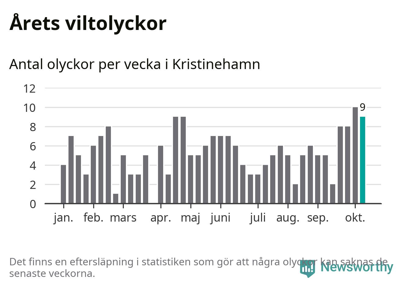 Hittills har nio viltolyckor rapporterats in i Kristinehamns kommun från vecka 42. Se listan här.