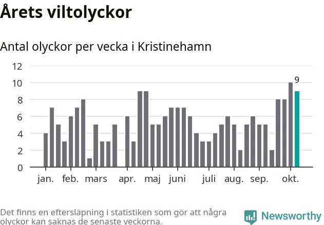 Totalt det här året har det inträffat 219 viltolyckor i kommunen. Det är mer än genomsnittet för motsvarande period (omkring 186) de senaste tio åren.
