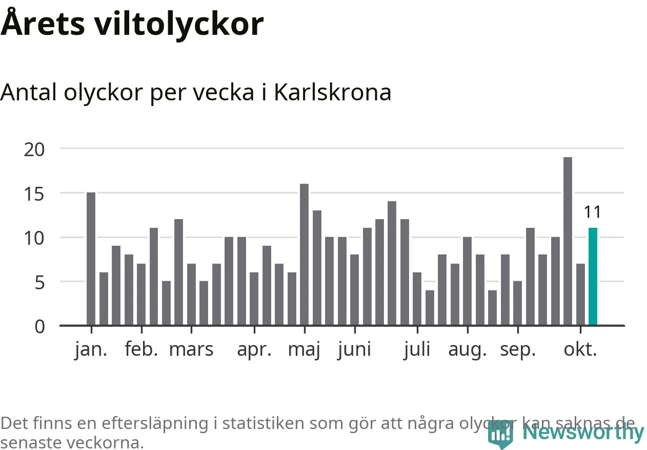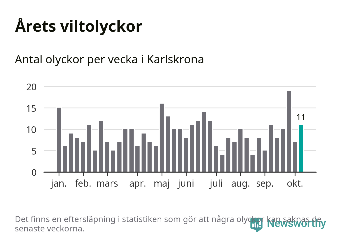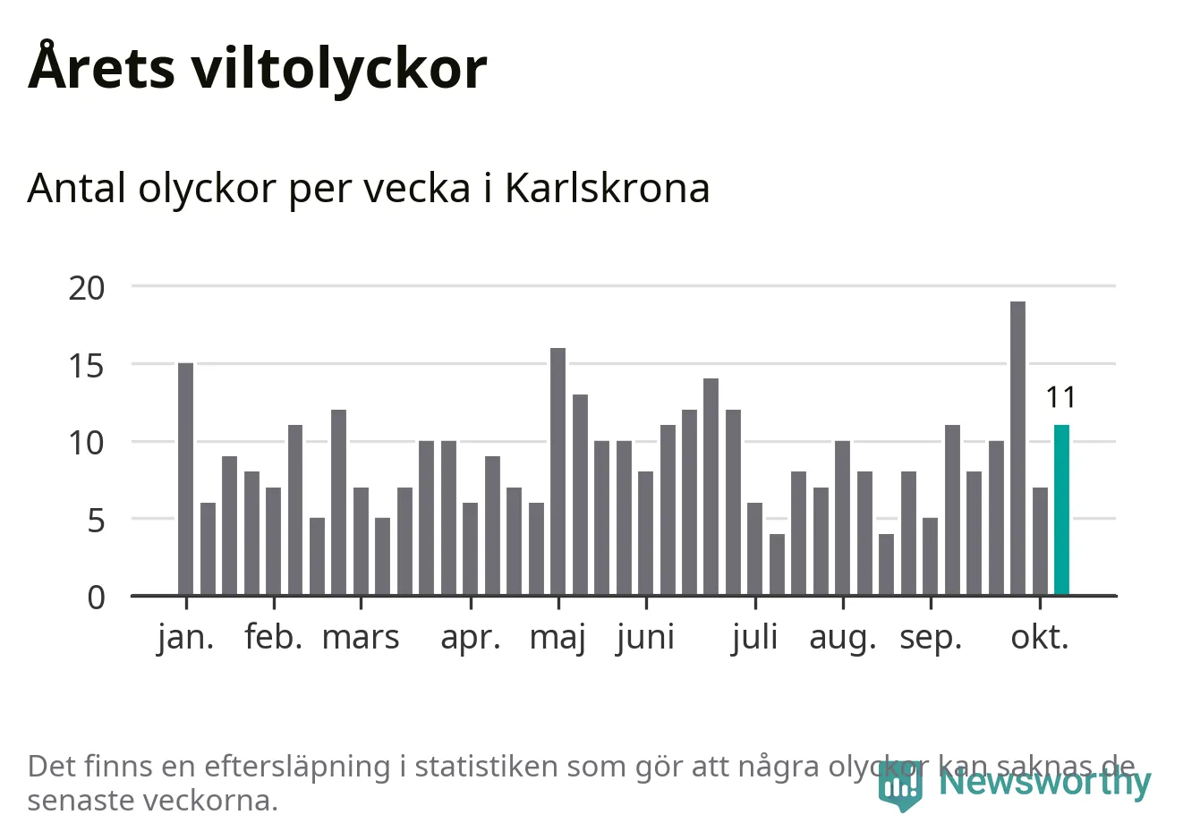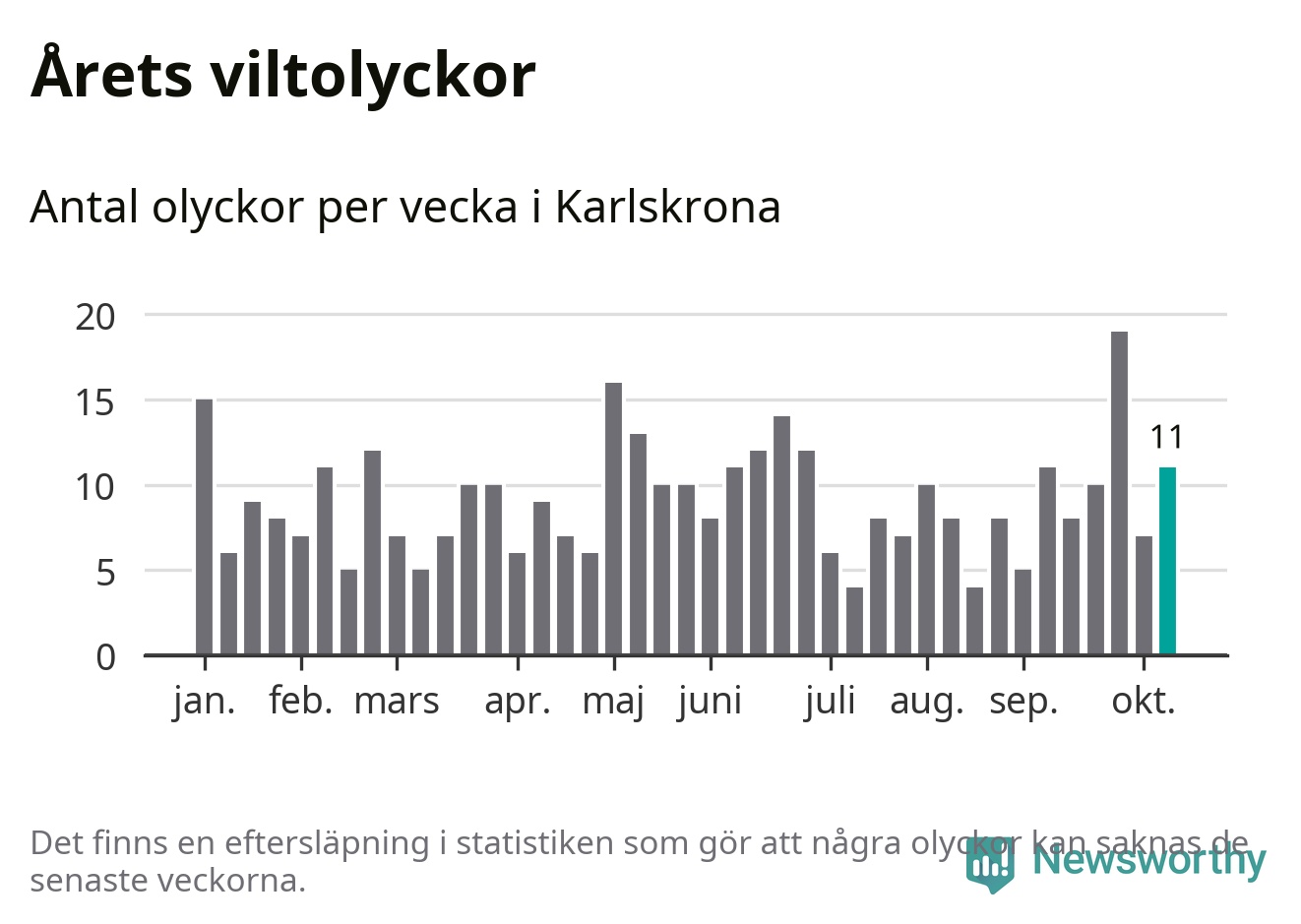 Hittills har elva viltolyckor rapporterats in i Karlskrona kommun från vecka 42. Se listan här.