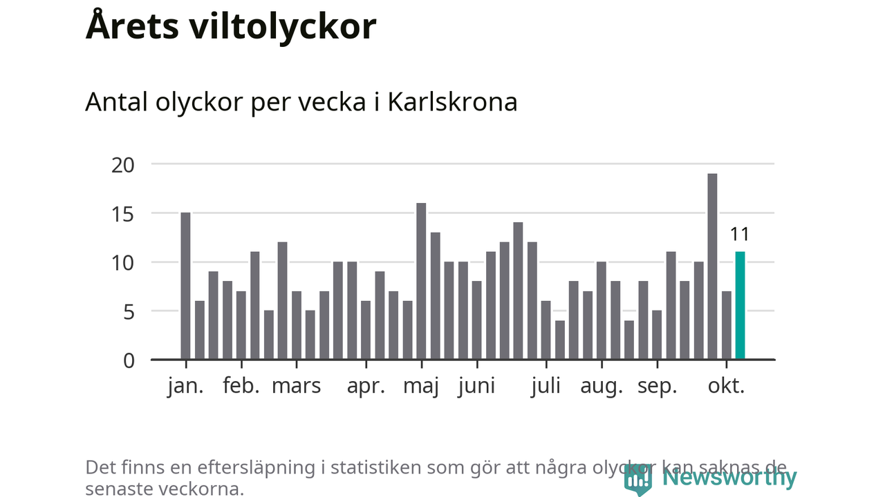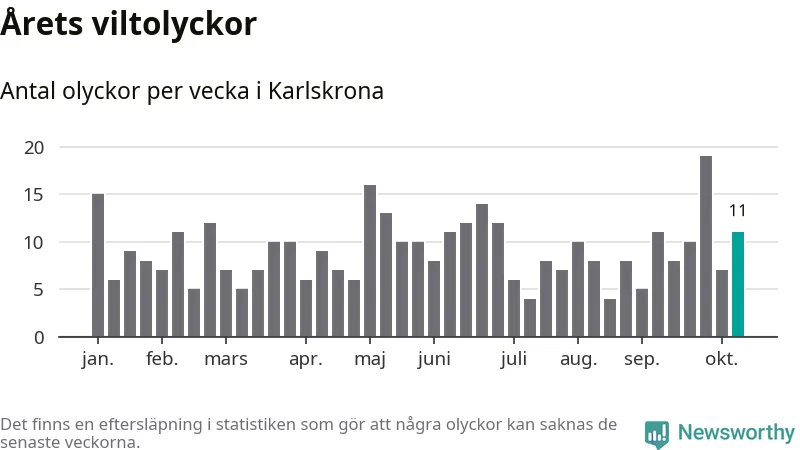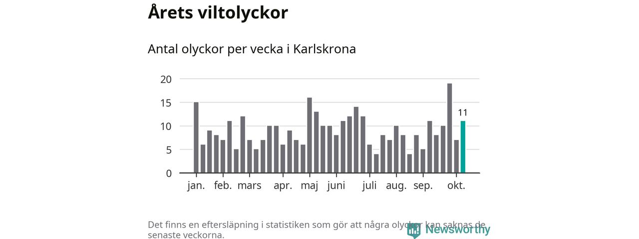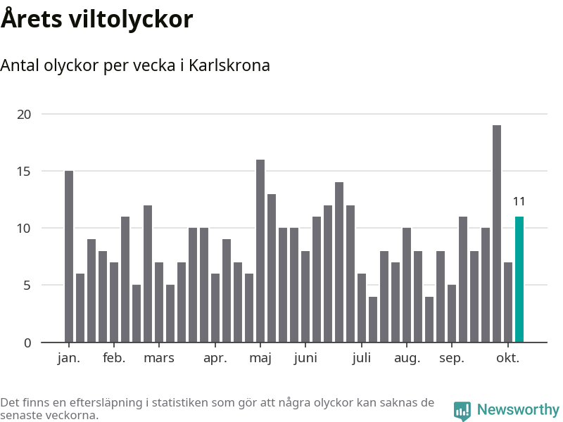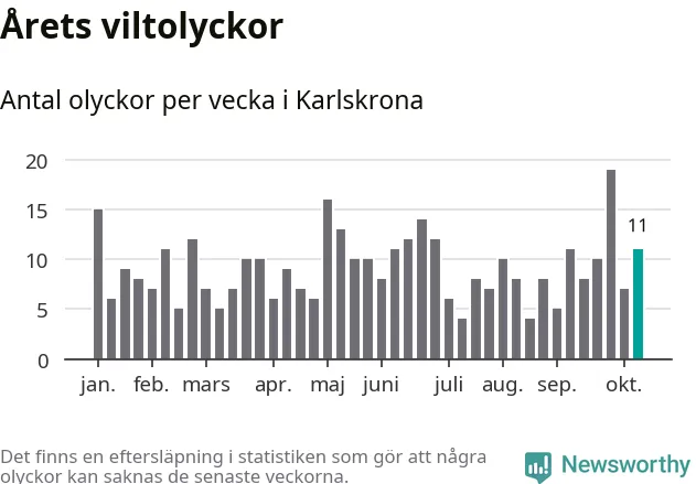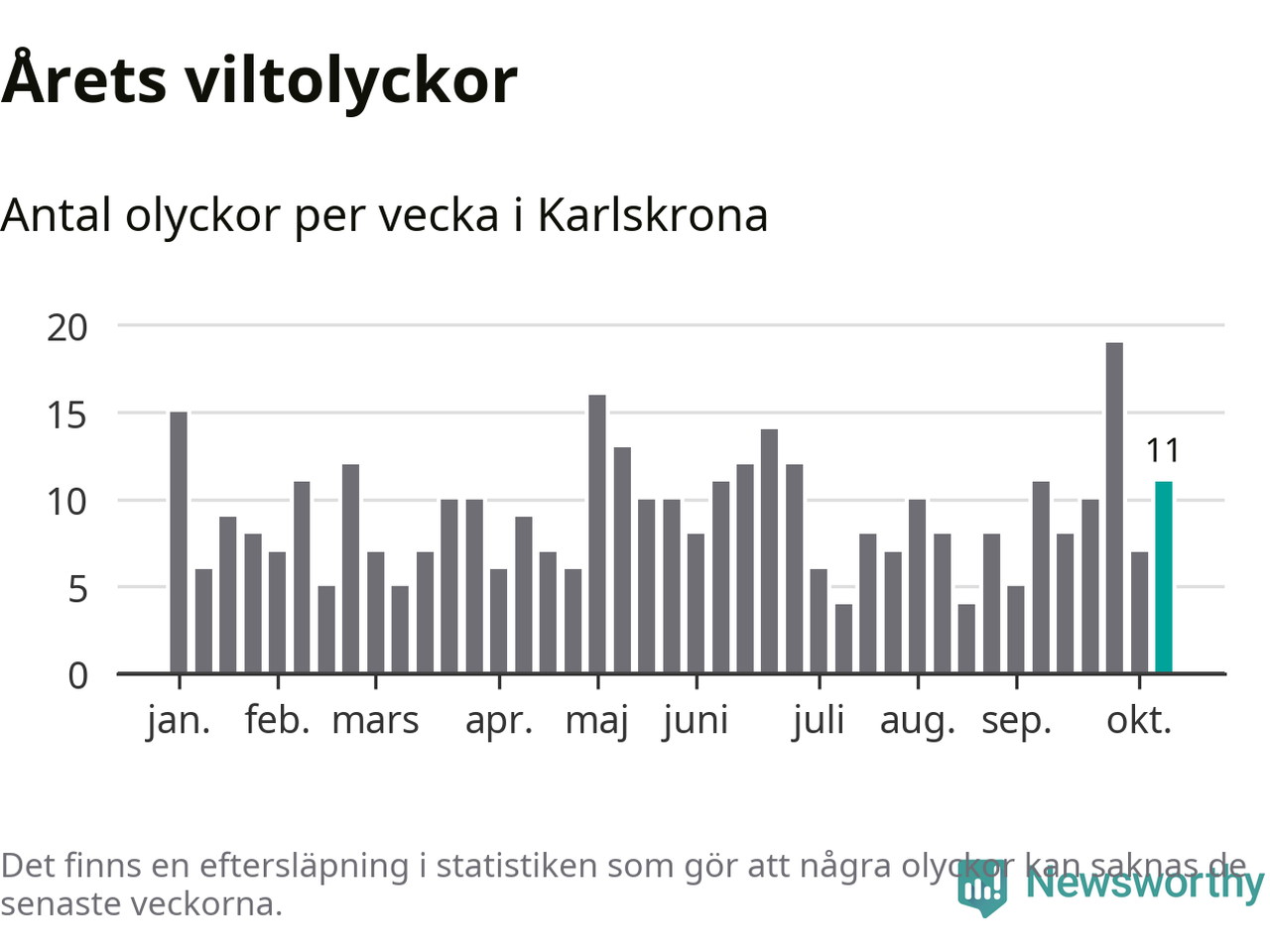 Hittills har elva viltolyckor rapporterats in i Karlskrona kommun från vecka 42. Se listan här.