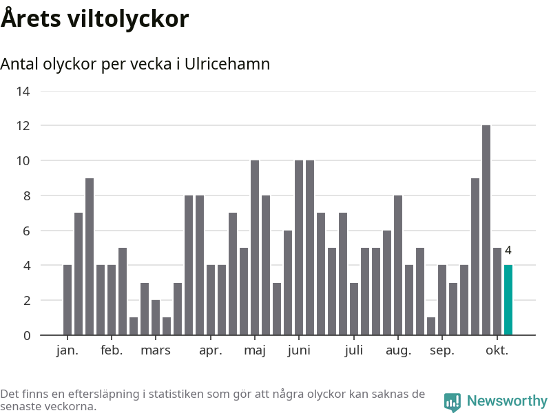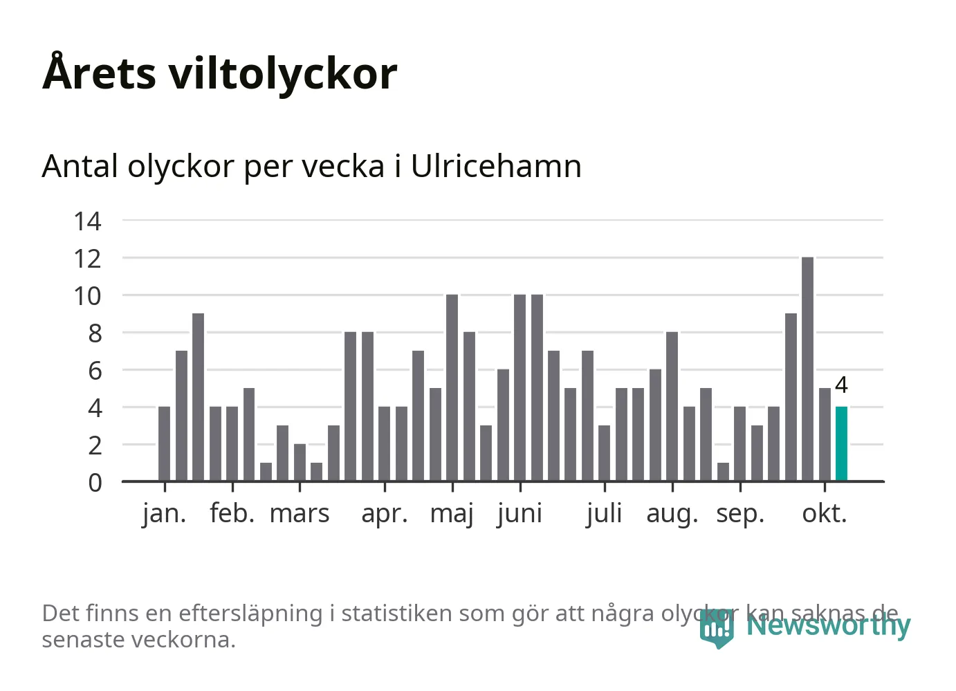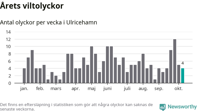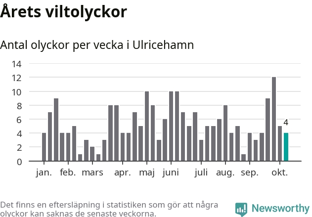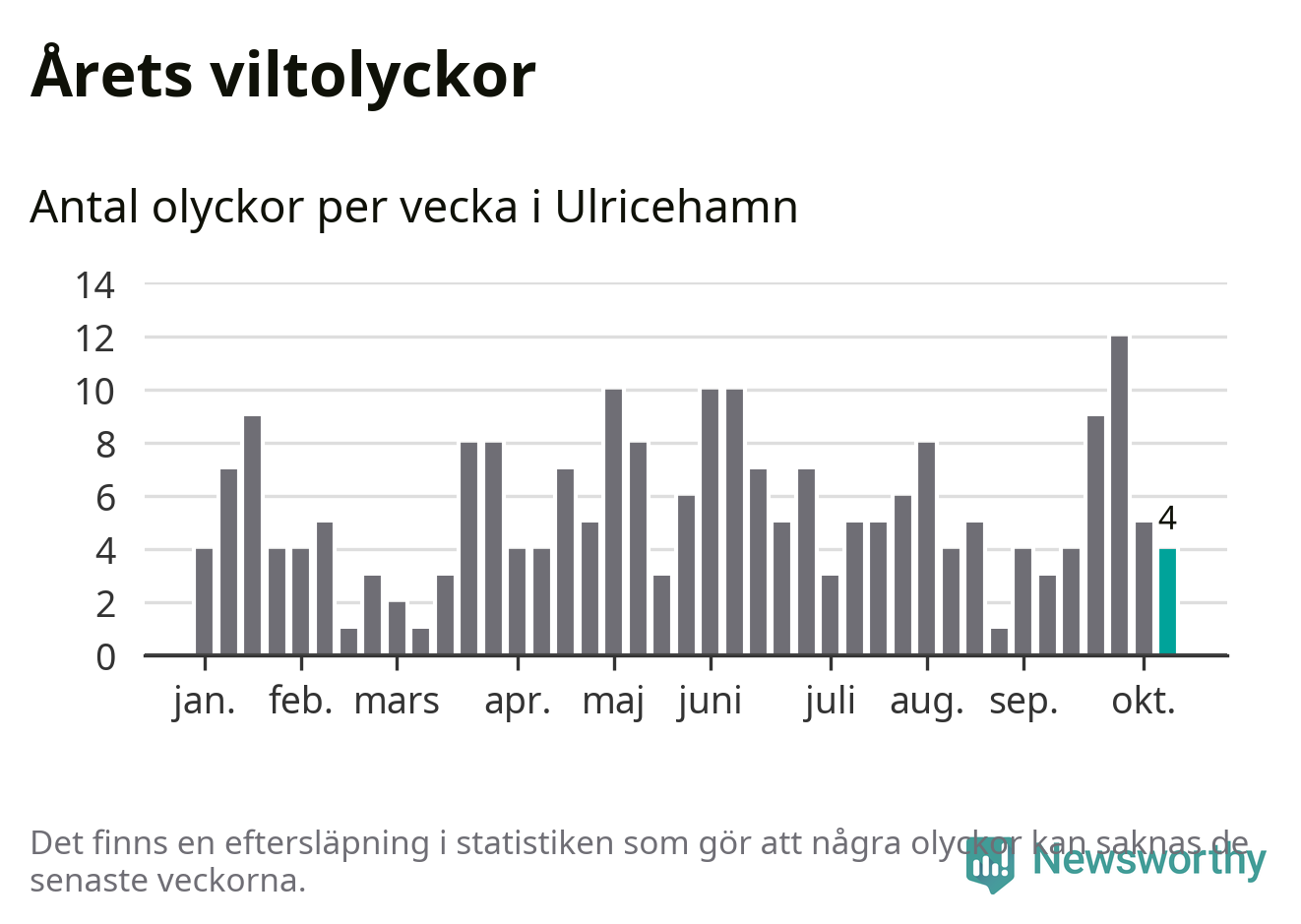 Hittills har fyra viltolyckor rapporterats in i Ulricehamns kommun från vecka 42. Se listan här.