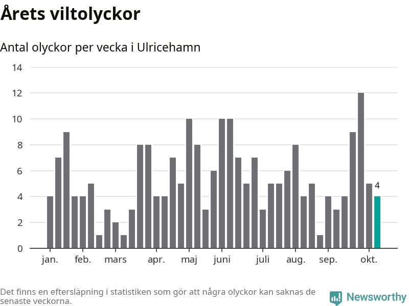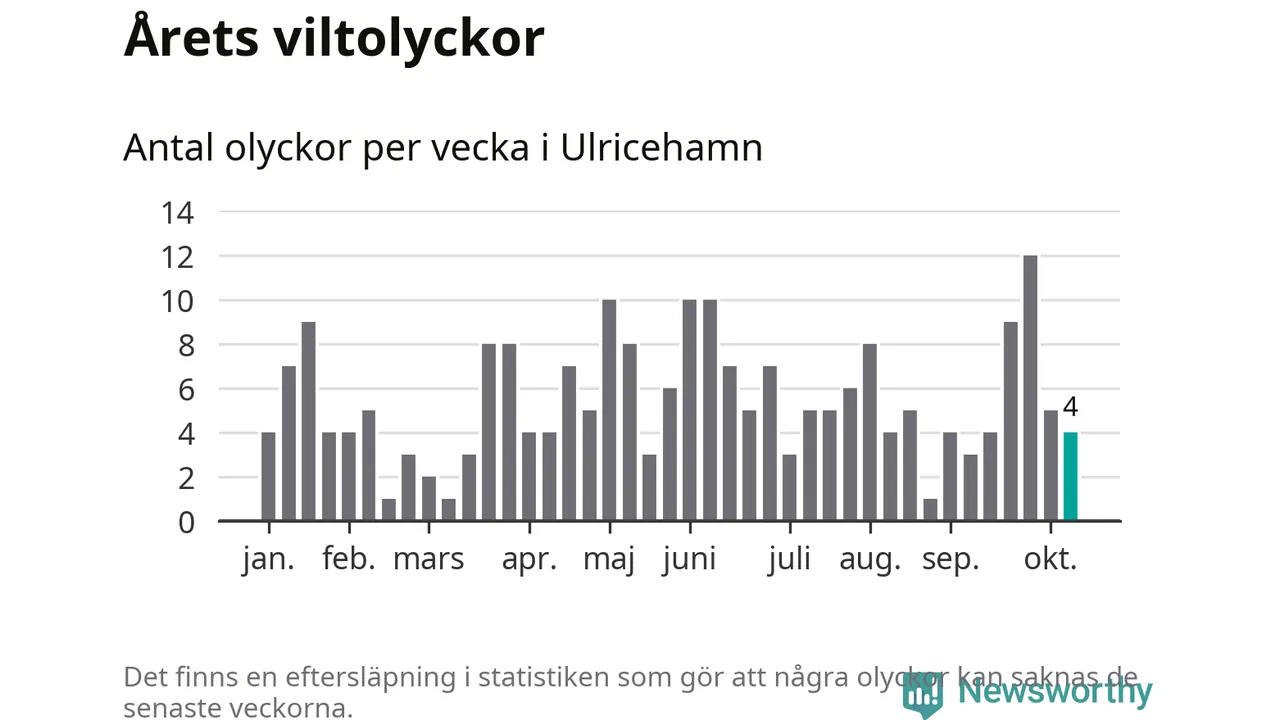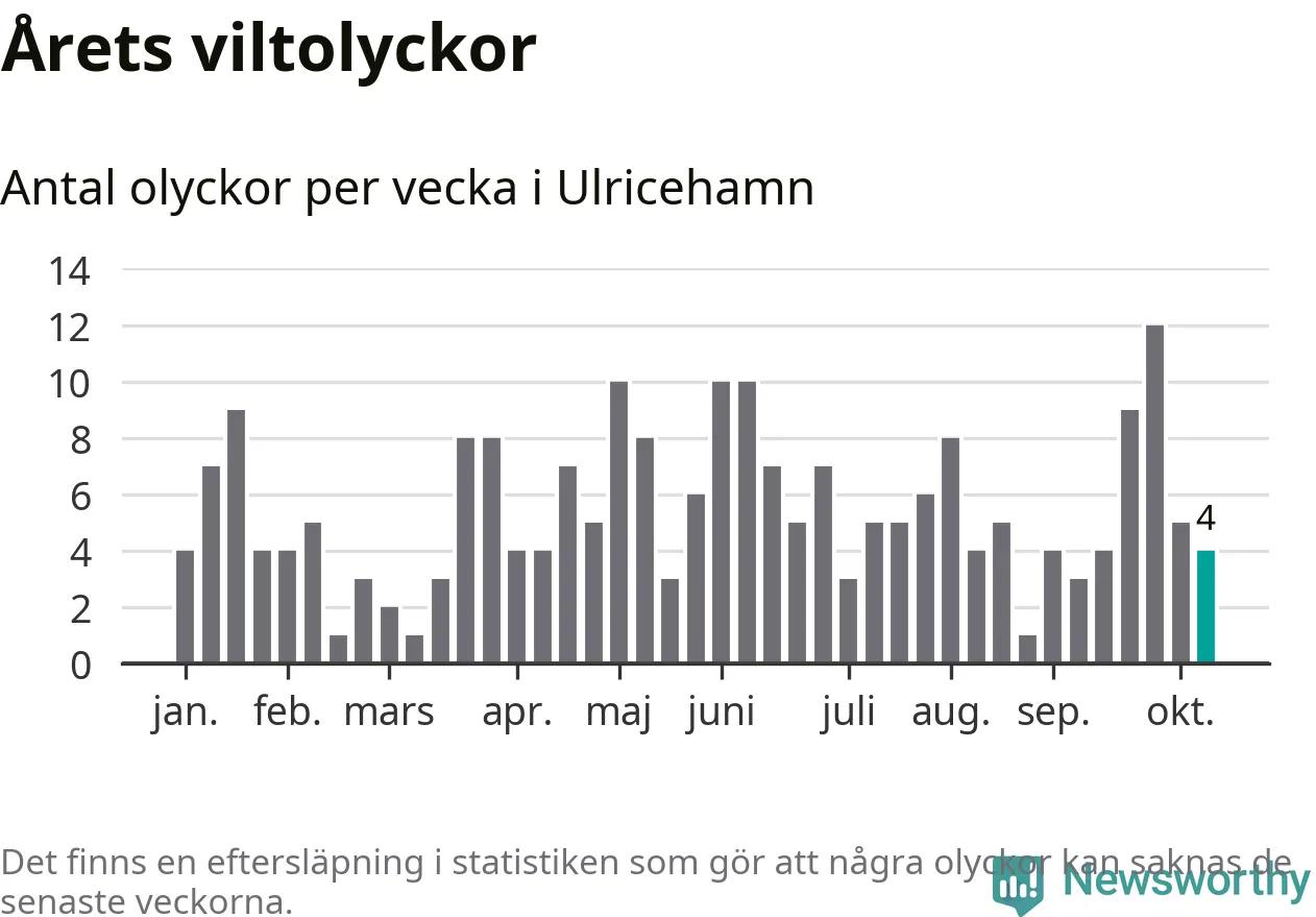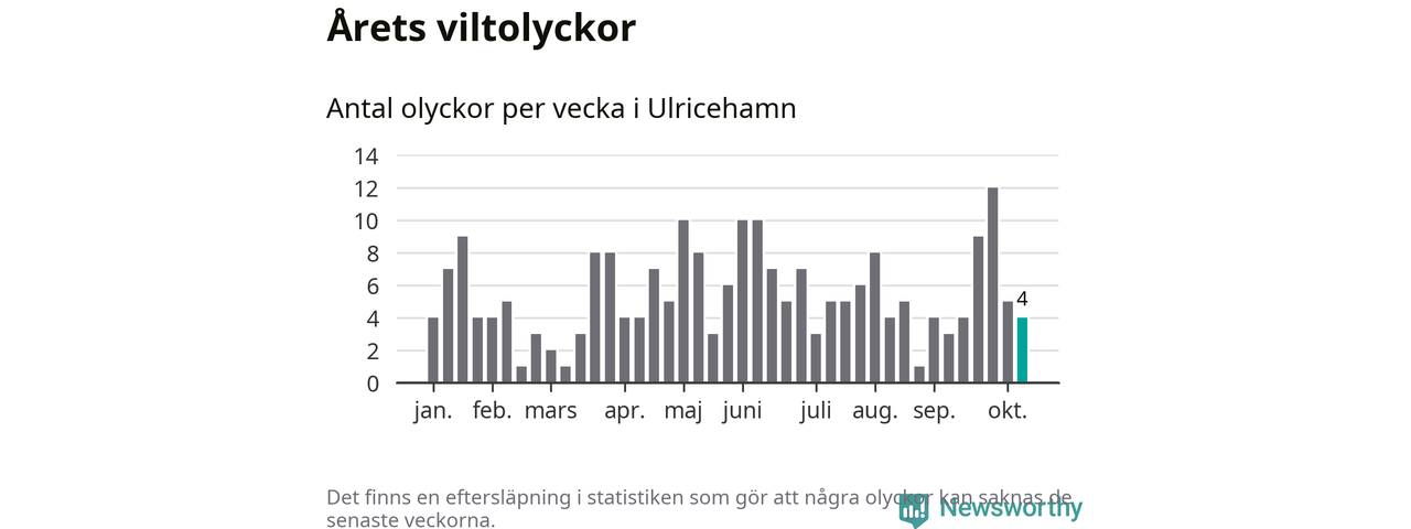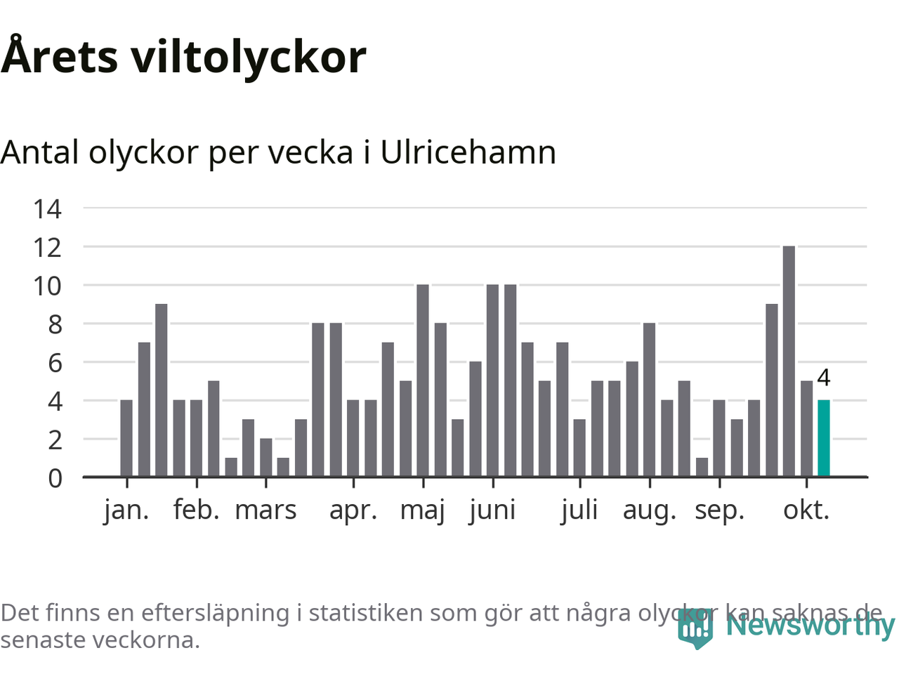 Hittills har fyra viltolyckor rapporterats in i Ulricehamns kommun från vecka 42. Se listan här.