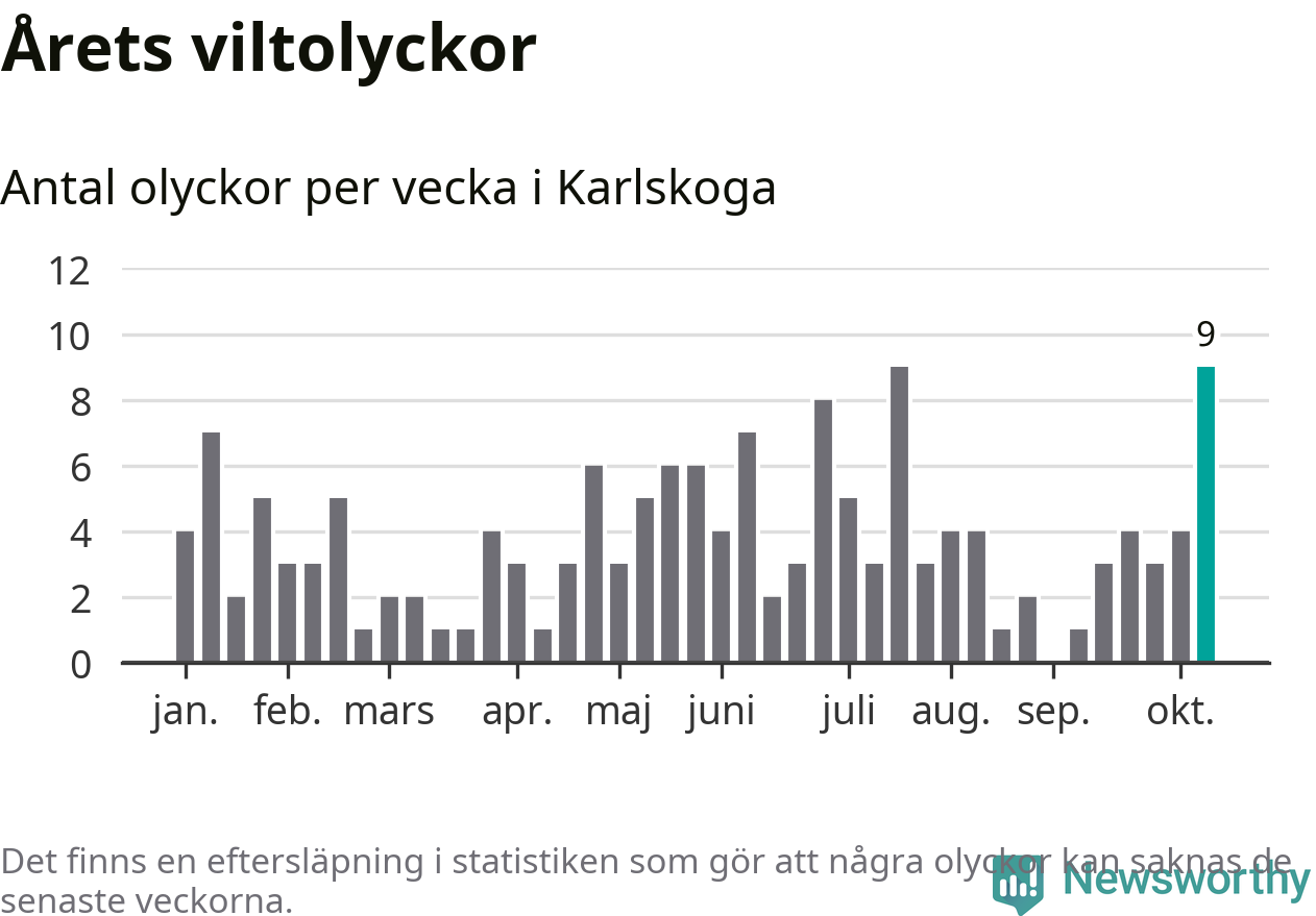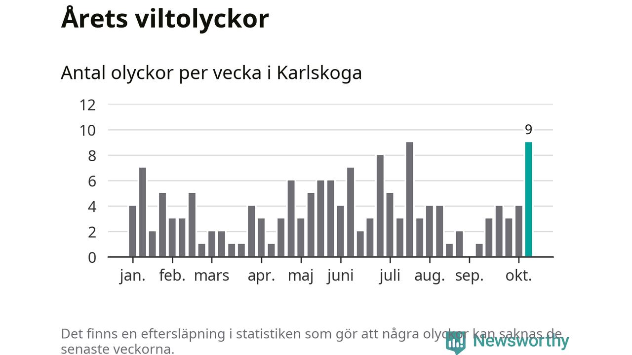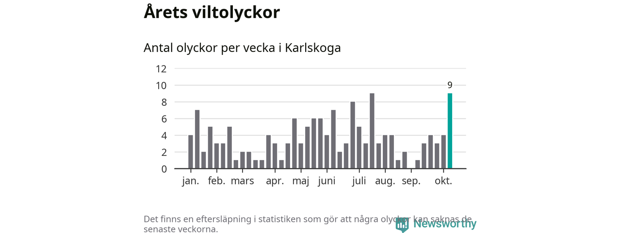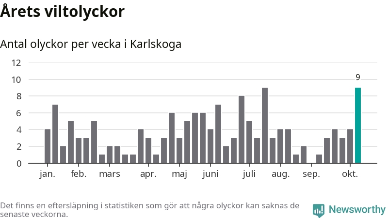 152 viltolyckor i kommunen. Det är mer än genomsnittet för motsvarande period (omkring 124) de senaste tio åren.