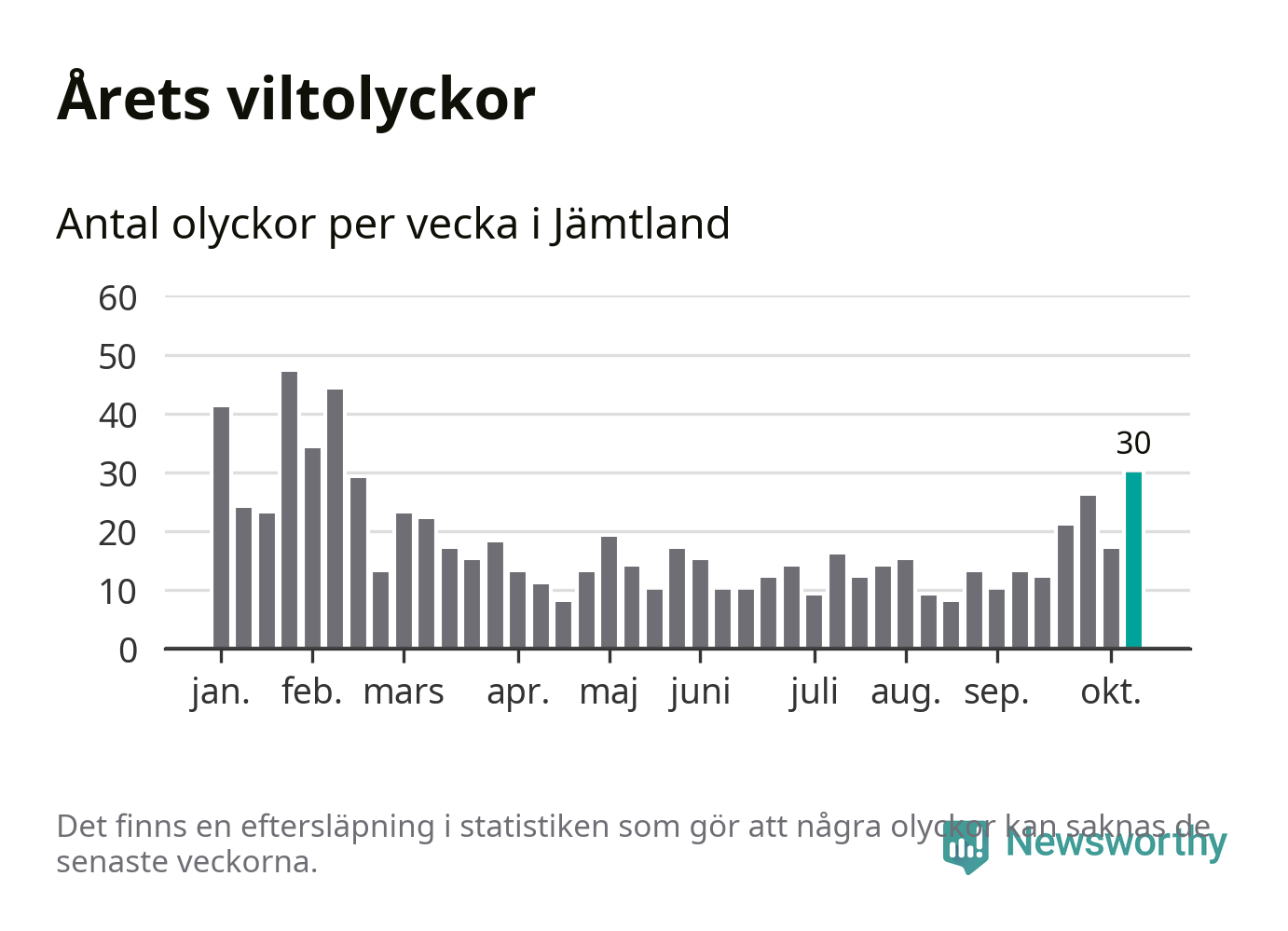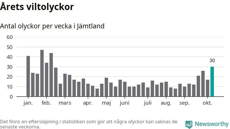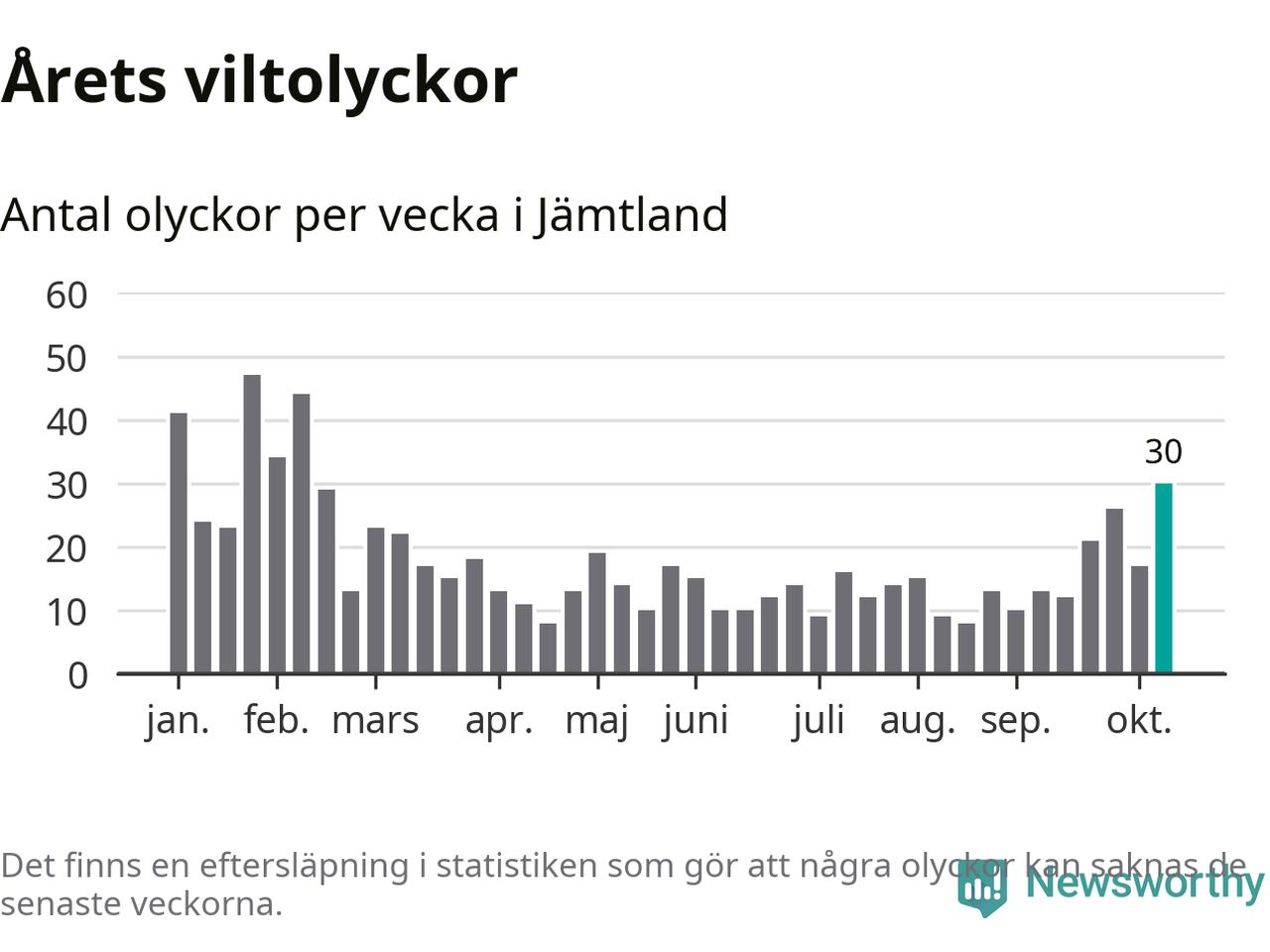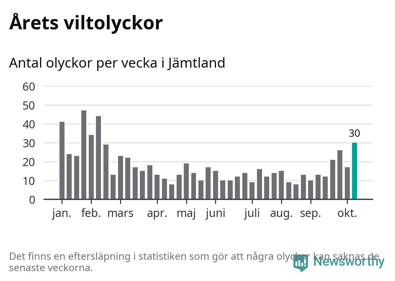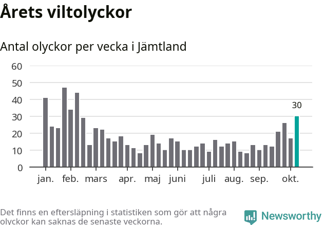Hittills har 30 viltolyckor rapporterats in i Jämtlands län från vecka 42. Se listan här.